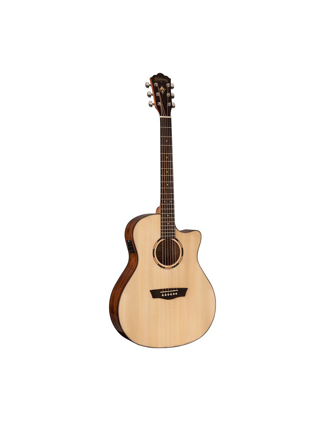 Chitarra Akustik Elettrificata Orchestra Cutaway, Decke aus massivem Sitka-Fichtenholz, Boden und Zargen aus Mahagoni, Fishman Presys II 301T Vorverstärker, Farbe Natur Die Woodline O10 SE ist eine akustische E-Gitarre im Cutaway-Orchesterformat mit massiver Decke und Walnuss-Binding; eine Mischung aus Eleganz, Musikalität und Preis-Leistungs-Verhältnis. Eine Decke aus hochwertigem massivem Sitka-Fichtenholz mit "Cathedral Peak" Scalloped-X Verstärkungen, kombiniert mit Boden und Zargen aus Mahagoni, ergibt eine tonal vielseitige, reiche, robuste und harmonische Gitarre zugleich. Die Walnuss-Binding verleiht einen Hauch von erstklassiger Eleganz, die normalerweise bei handgefertigten Instrumenten zu finden ist. Die Eigenschaften des Graph Tech® NuBone Sattels und der Nut maximieren den Klang und den Charakter der Gitarre. Der Fishman® Presys II 301T Vorverstärker erzeugt einen natürlichen akustischen Klang in Aufführungssituationen. SPEZIFIKATIONEN Form: Orchestra Cutaway Decke: Massive Sitka-Fichte Boden/Zargen: Mahagoni Hals: Satiniertes Mahagoni Truss Rod 2 Wege Griffbrett: Ovangkol Rosette: Washburn Parkett Einlagen: Punkte Verstärkung: Cathedral Peaked Scalloped-X Steg: Ovangkol Nut: Graphtec NuBone Mechaniken: Die-cast Chrom Vorverstärker: Fishman Presys 301T Anzahl der Bünde: 20 Bünde Mensur: 25-5/16” Farbe: Natur Finish: Hochglanz Saiten: D’Addario EXP16