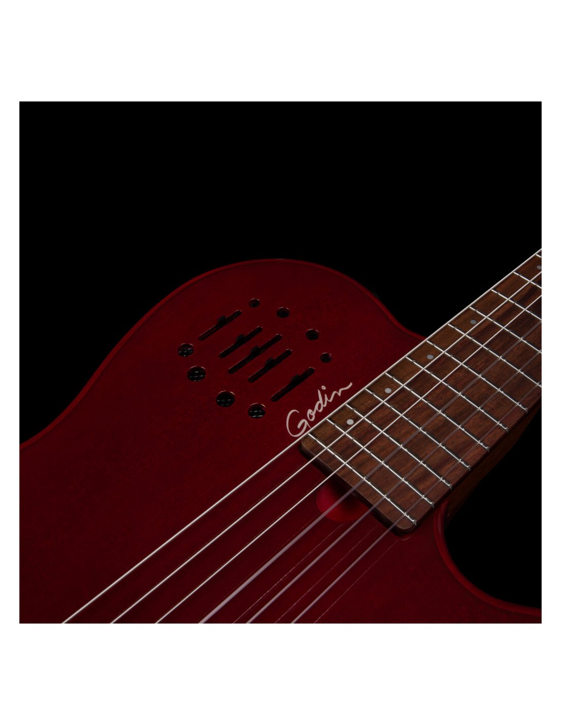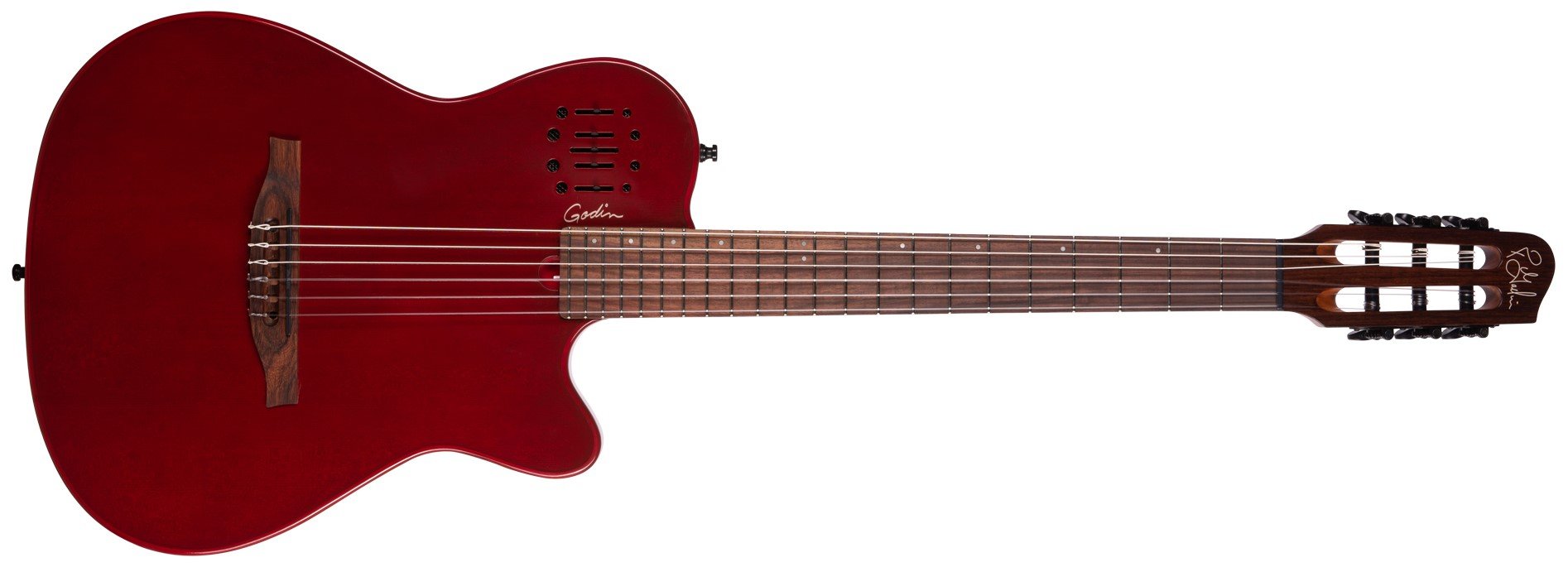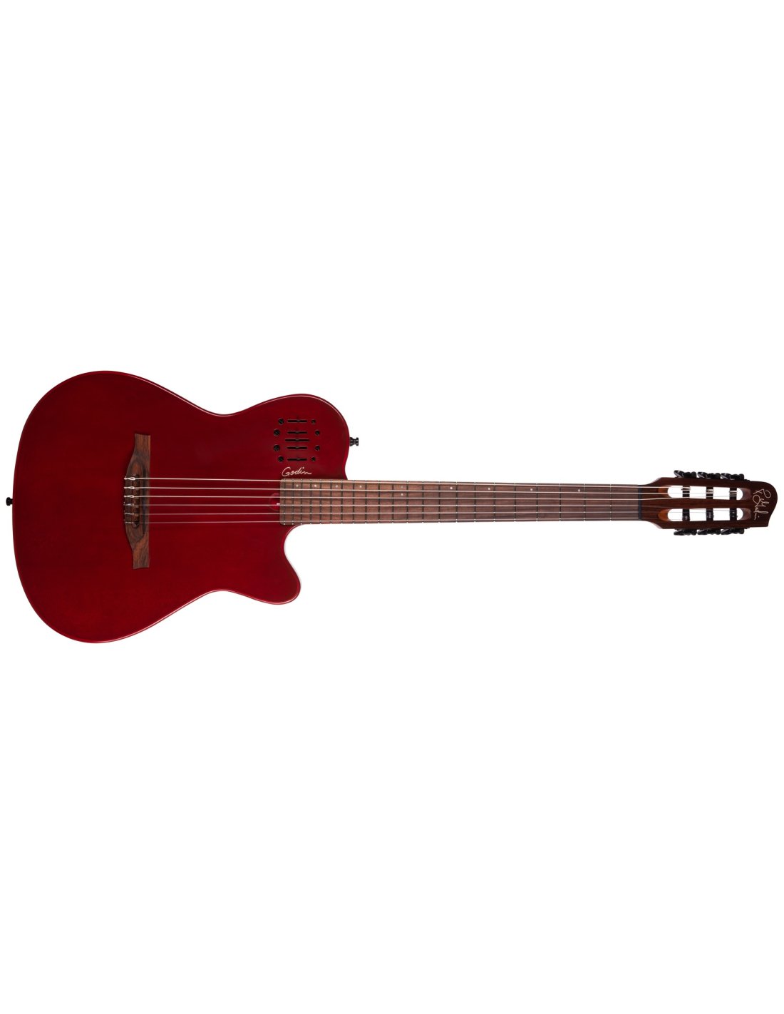 Elektrifizierte klassische Gitarre Godin Multiac Mundial in der Farbe ATZEK RED mit Tasche. Die Godin Multiac Mundial ist eine elektrifizierte klassische Gitarre mit 6 Saiten. Zu den technischen Merkmalen gehören ein Korpus aus Silver Leaf Ahorn und eine massive Zederndecke, ein Hals aus spanischer Zeder, ein Griffbrett aus Palisander mit 22 mittleren Jumbo-Bünden, Custom Godin Dual Source System Tonabnehmer, 2 Körpersensoren, ein Sattelbrücke und hochwertige Mechaniken.
