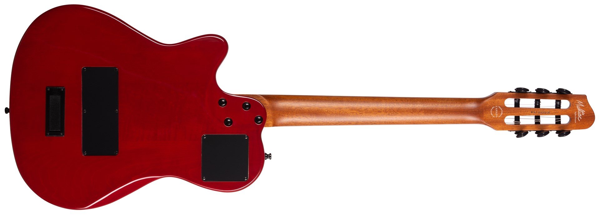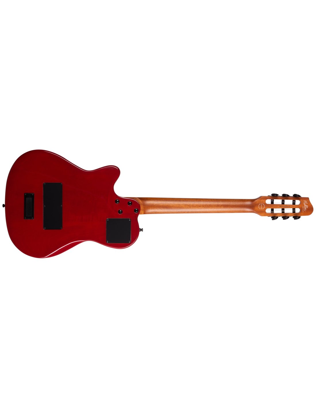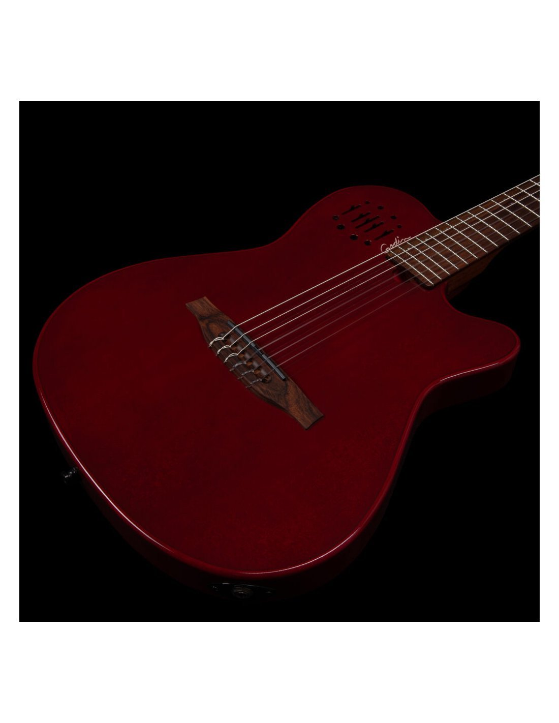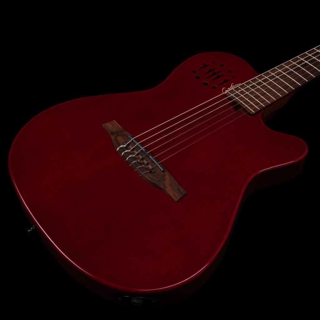 Elektrifizierte klassische Gitarre Godin Multiac Mundial in der Farbe ATZEK RED mit Tasche. Die Godin Multiac Mundial ist eine elektrifizierte klassische Gitarre mit 6 Saiten. Zu den technischen Merkmalen gehören ein Korpus aus Silver Leaf Ahorn und eine massive Zederndecke, ein Hals aus spanischer Zeder, ein Griffbrett aus Palisander mit 22 mittleren Jumbo-Bünden, Custom Godin Dual Source System Tonabnehmer, 2 Körpersensoren, ein Sattelbrücke und hochwertige Mechaniken.