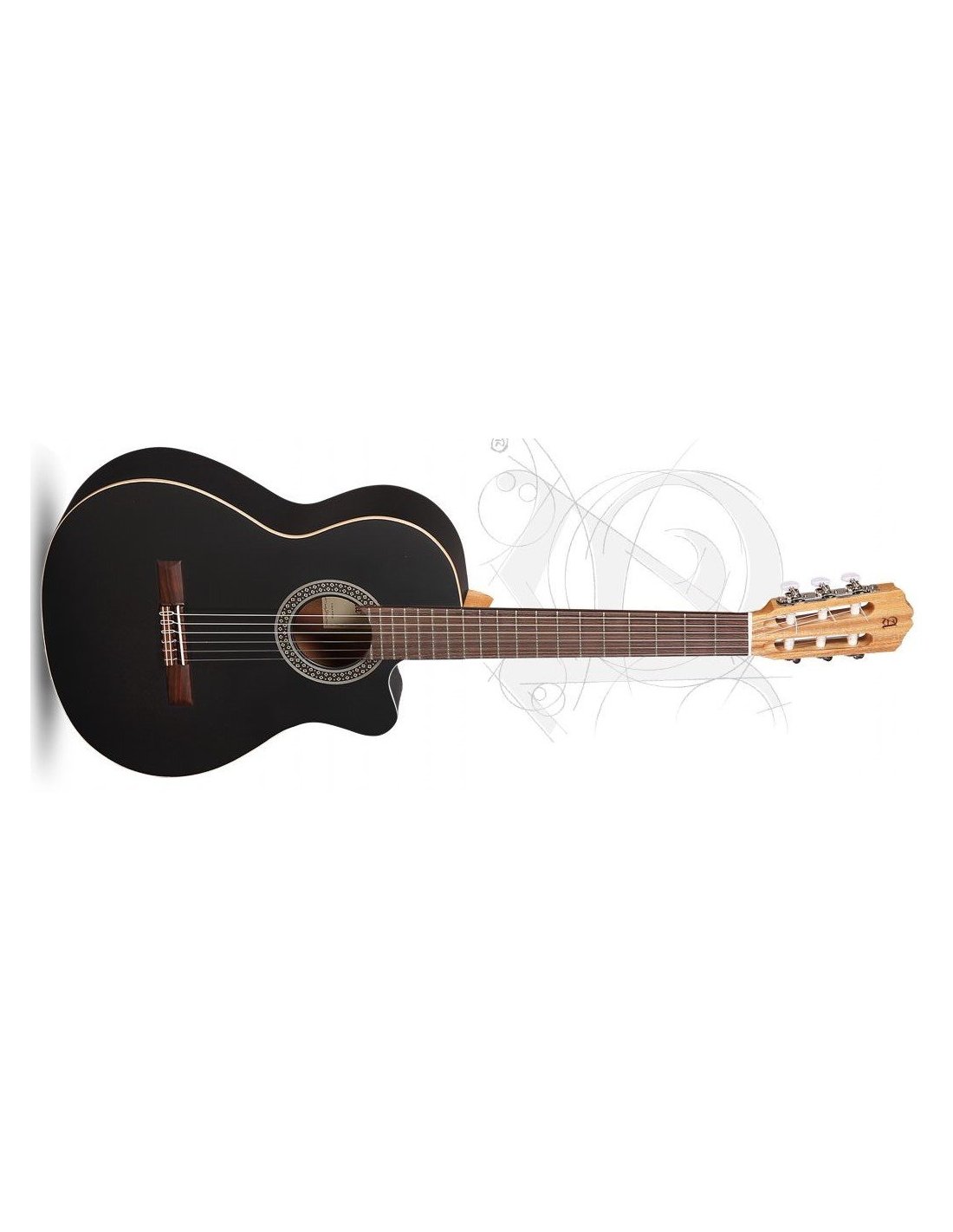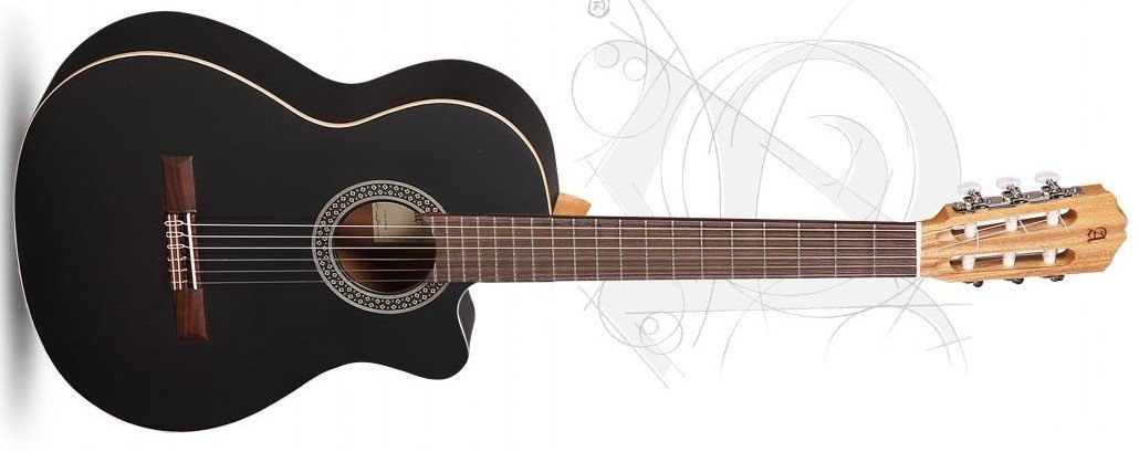 Elektrifizierte klassische Gitarre Alhambra 1C CWEZ in der Farbe Schwarz Satin. Die Alhambra 1C CWEZ ist eine elektrifizierte klassische Gitarre mit 6 Saiten und fehlendem Cutaway. Decke aus massivem Rotzeder. Boden und Zargen aus Mahagoni. Hals aus Mahagoni mit Griffbrett aus Palisander. Fishman Clasica II Elektronik mit Lautstärke-, Bass-, Höhen-, Phasen- und integriertem Tuner.