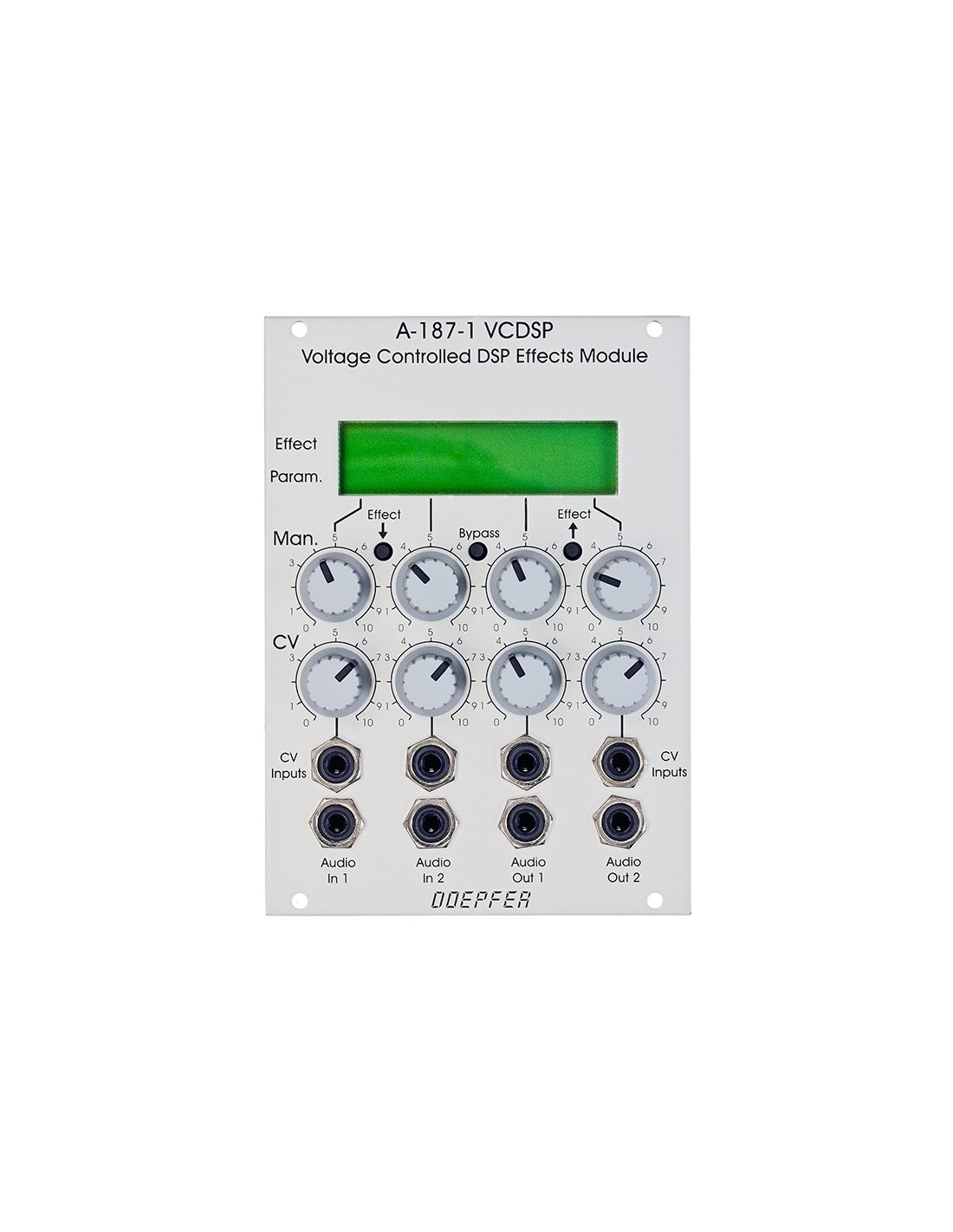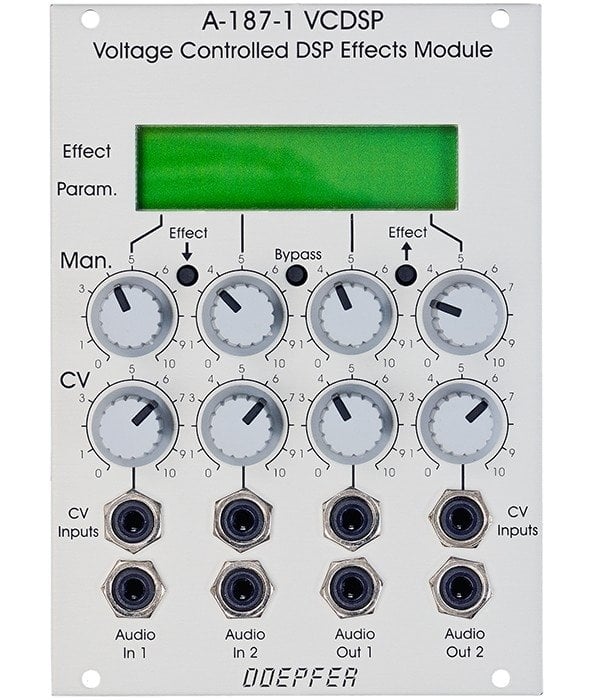 Das A-187-1 Spannungsgesteuerte DSP-Effekte ist ein DSP-basiertes Effektmodul von Doepfer im Eurorack-Format mit 18HP. Es verfügt über zwei Audioeingänge und zwei Ausgänge sowie eine Spannungssteuerung der Parameter der Effekte Delay, Hall, Pitch Shift und Equalizer.