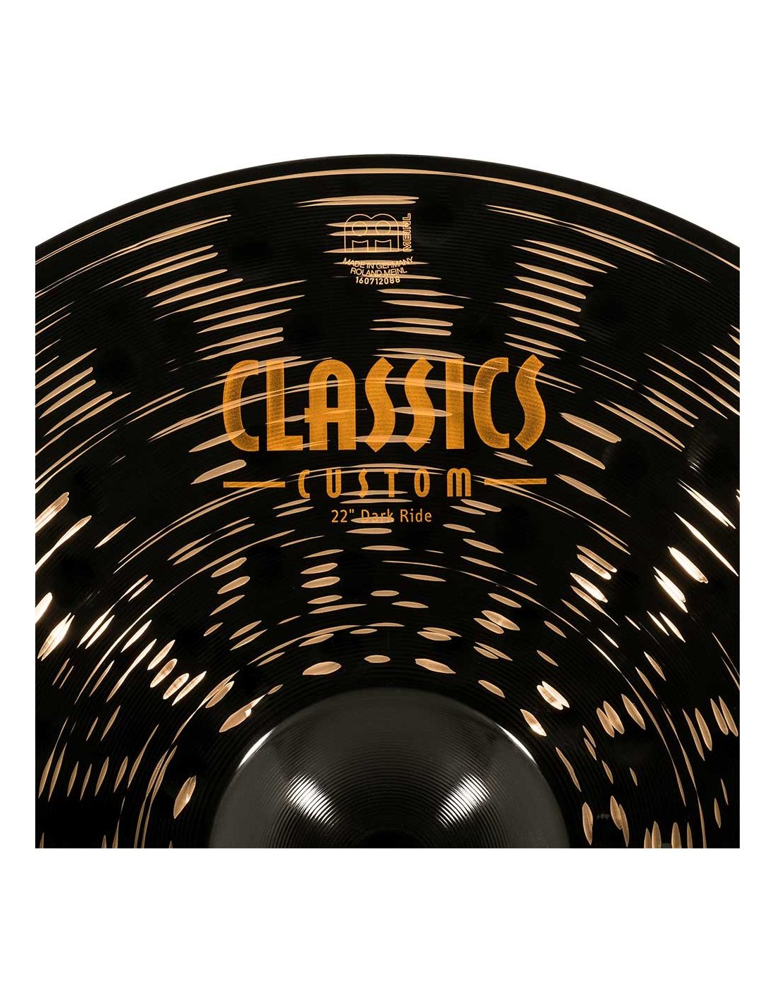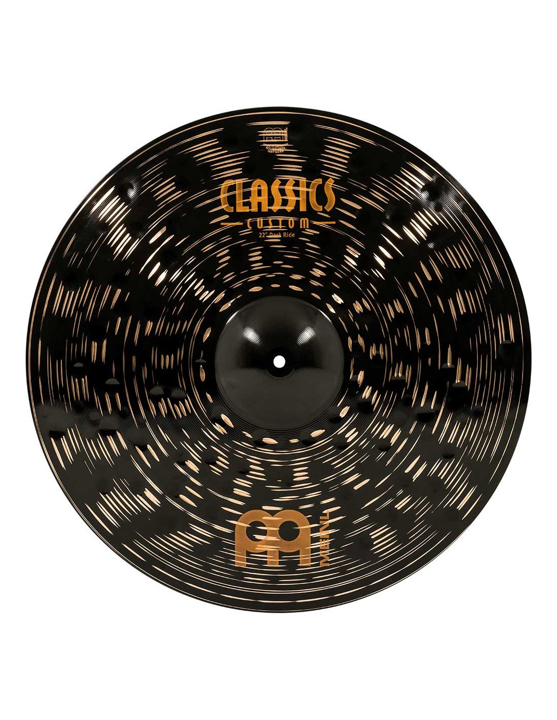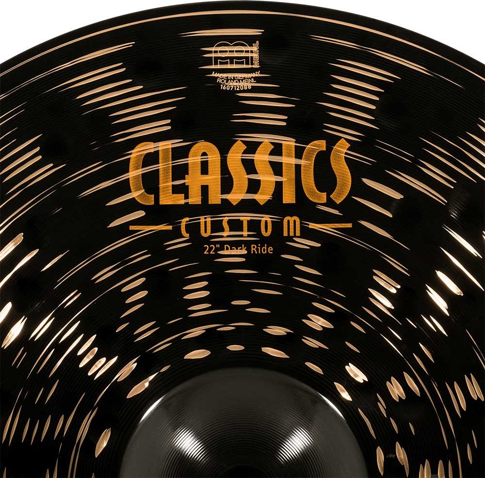 'Ride 22'' Serie Classics Custom Dark. Die Platten der Serie Classics Custom Dark werden mechanisch in Deutschland aus der Legierung B10 hergestellt. Der Prozess umfasst verschiedene Techniken, sowohl Druck- als auch computergestütztes Hämmern. Darüber hinaus haben sie eine glänzende schwarze Oberfläche, die ihnen ein spektakuläres Aussehen und einen besonderen Klang verleiht.