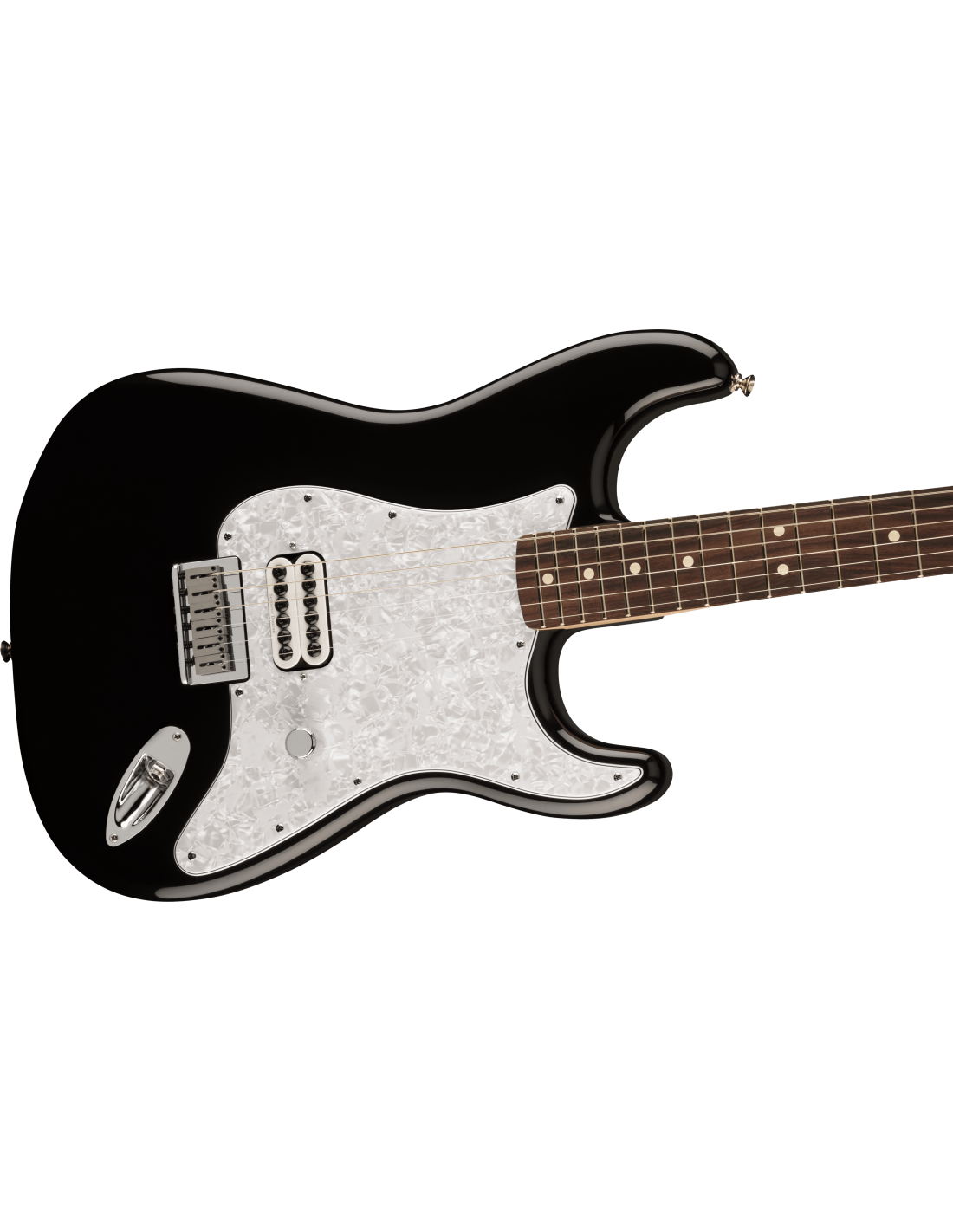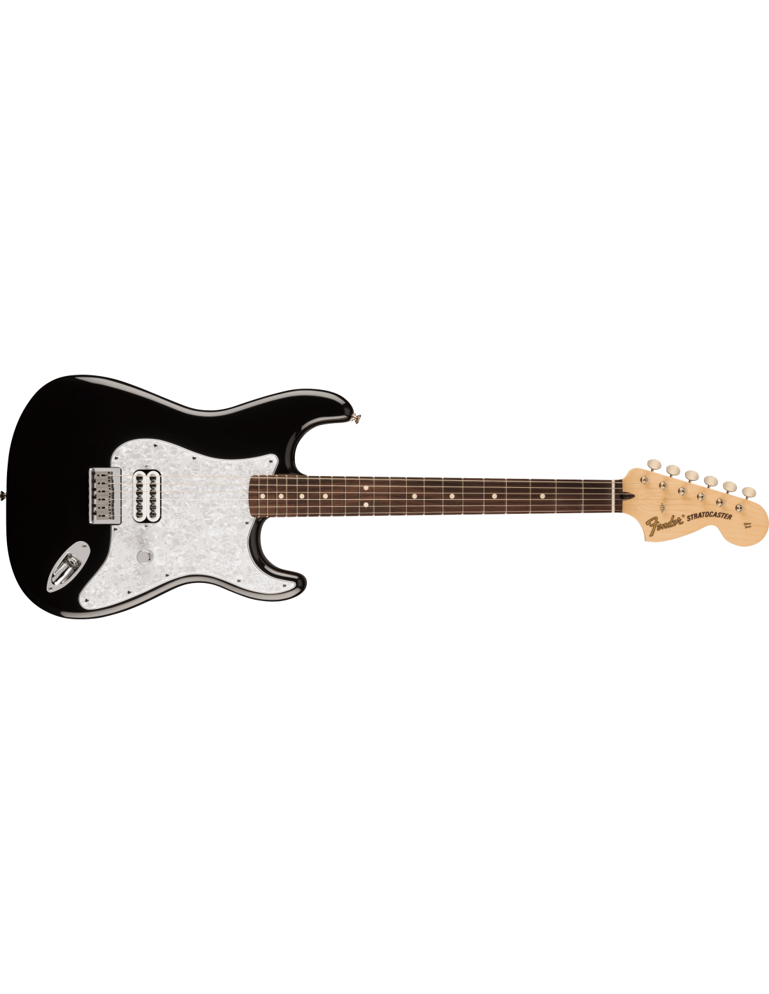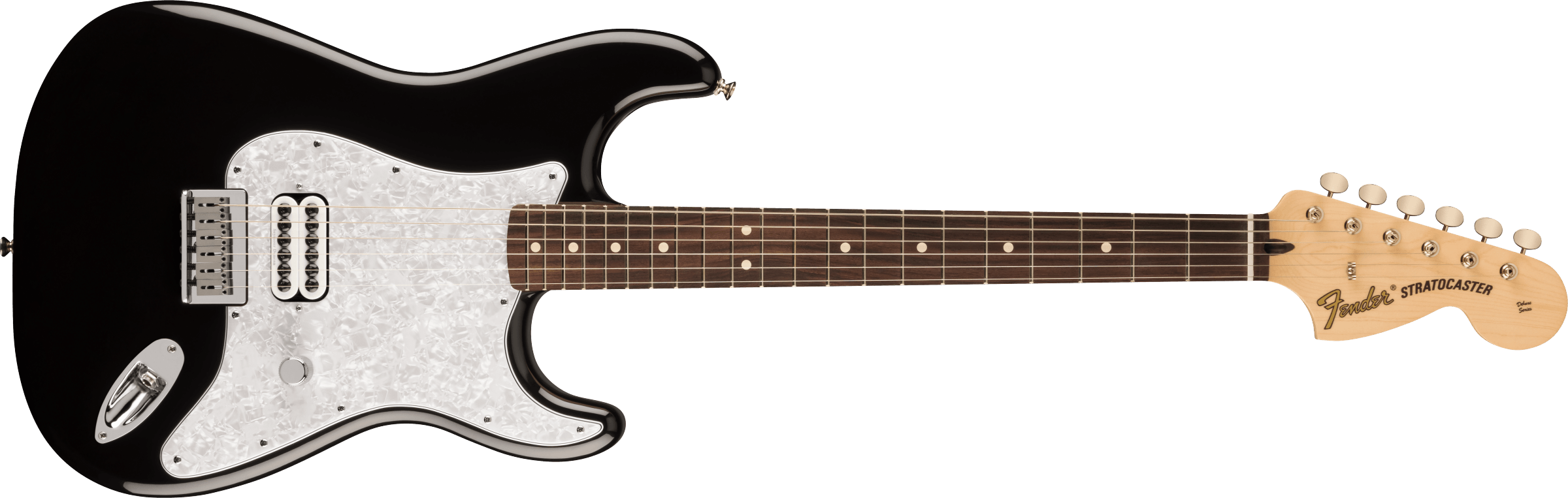 E-Gitarre Fender Stratocaster Tom Delonge, limitierte Auflage, Farbe Schwarz. Die Fender Stratocaster Tom Delonge ist eine E-Gitarre mit 6 Saiten, die die von Tom Delonge von Blink-182 gewünschten Eigenschaften vereint. Sie verfügt über einen Ahornhals mit C-Profil, einer Mensur von 25 1/2”, und ein Palisandergriffbrett mit 21 Medium Jumbo Bünden. Der Korpus besteht aus Erle, mit einem 4-lagigen White Pearloid Schlagbrett. Die Elektronik umfasst einen Seymour Duncan Invader SH-8 Humbucker mit Lautstärkeregler und Treble-Bleed. Hardware aus Nickel/Chrom. Fester Stahlbrücke mit 6 Sätteln aus Druckguss. Fender Vintage-Style Mechaniken. Deluxe Gig-Bag im Lieferumfang enthalten.