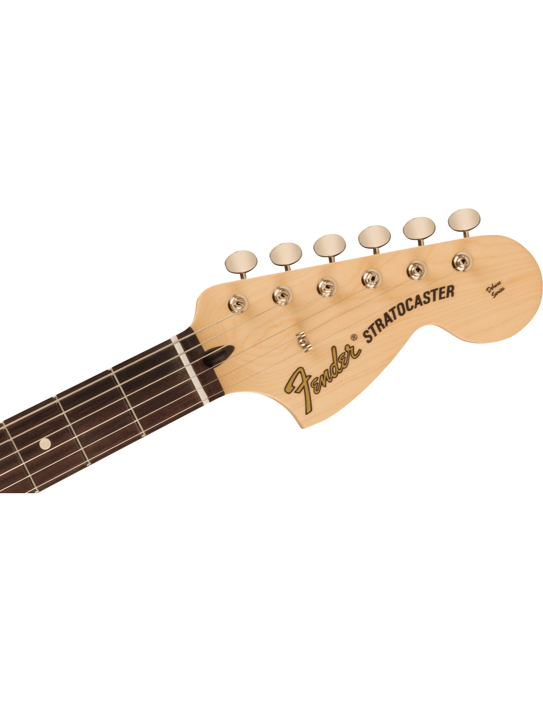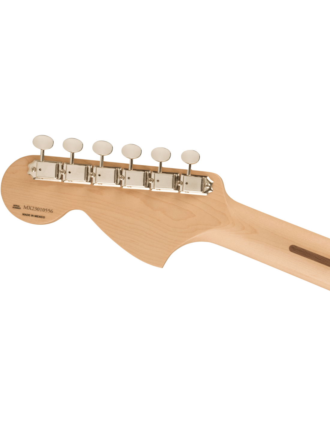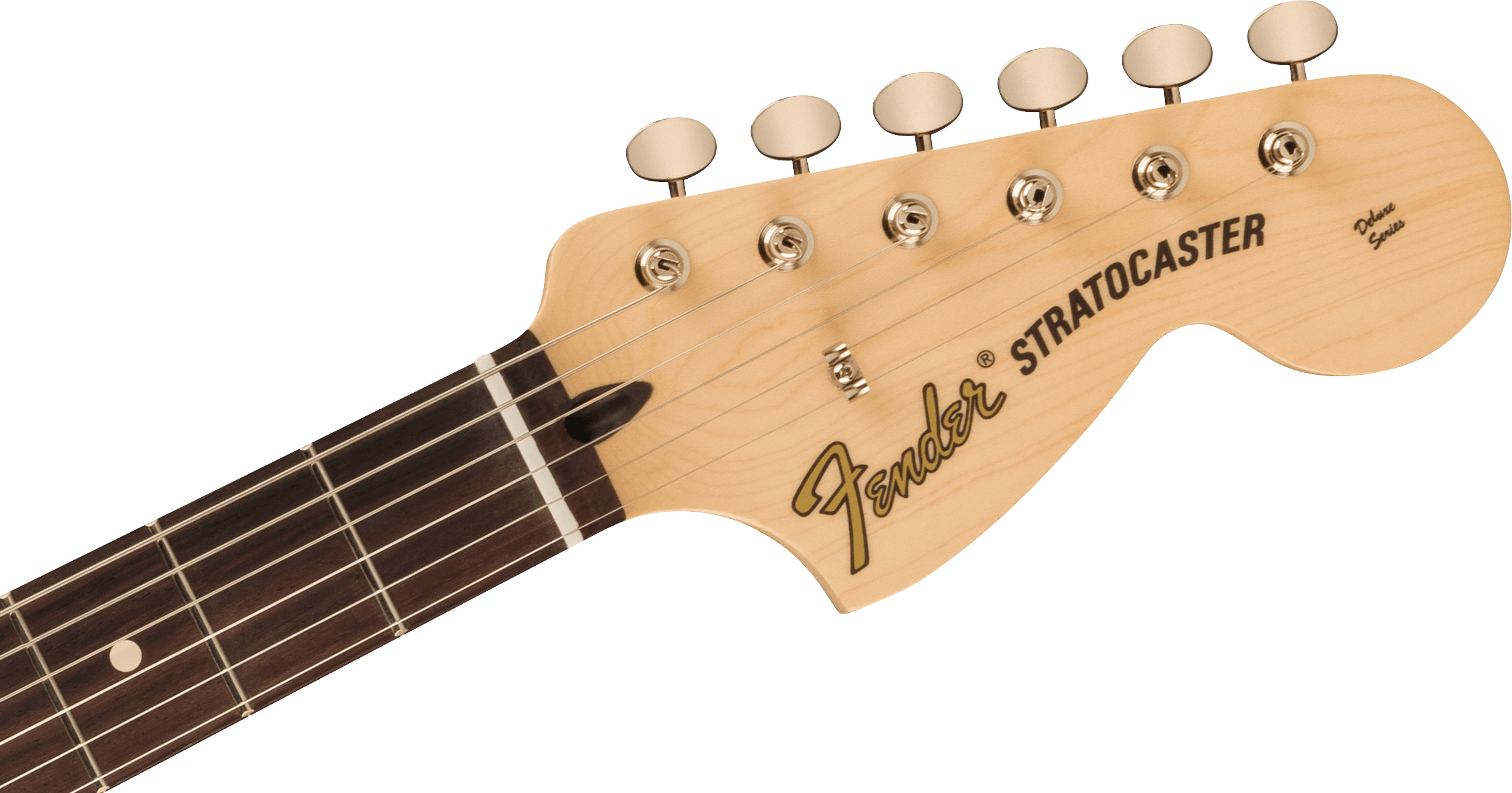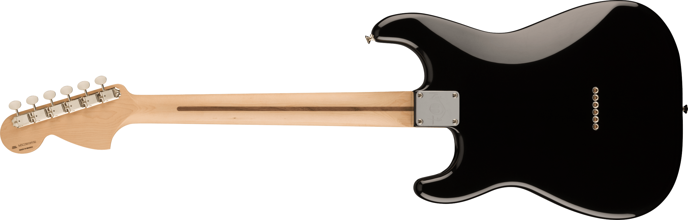 E-Gitarre Fender Stratocaster Tom Delonge, limitierte Auflage, Farbe Schwarz. Die Fender Stratocaster Tom Delonge ist eine E-Gitarre mit 6 Saiten, die die von Tom Delonge von Blink-182 gewünschten Eigenschaften vereint. Sie verfügt über einen Ahornhals mit C-Profil, einer Mensur von 25 1/2”, und ein Palisandergriffbrett mit 21 Medium Jumbo Bünden. Der Korpus besteht aus Erle, mit einem 4-lagigen White Pearloid Schlagbrett. Die Elektronik umfasst einen Seymour Duncan Invader SH-8 Humbucker mit Lautstärkeregler und Treble-Bleed. Hardware aus Nickel/Chrom. Fester Stahlbrücke mit 6 Sätteln aus Druckguss. Fender Vintage-Style Mechaniken. Deluxe Gig-Bag im Lieferumfang enthalten.