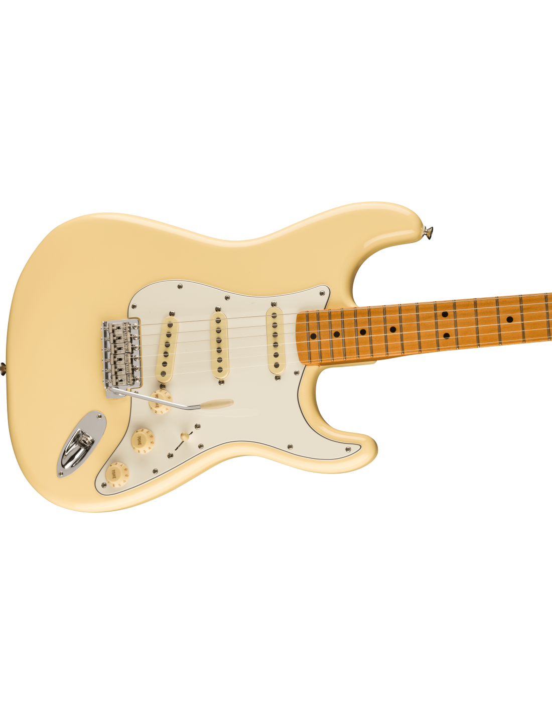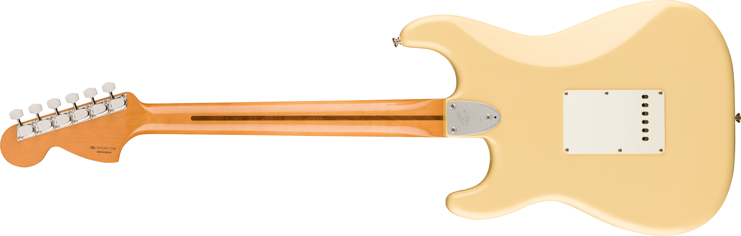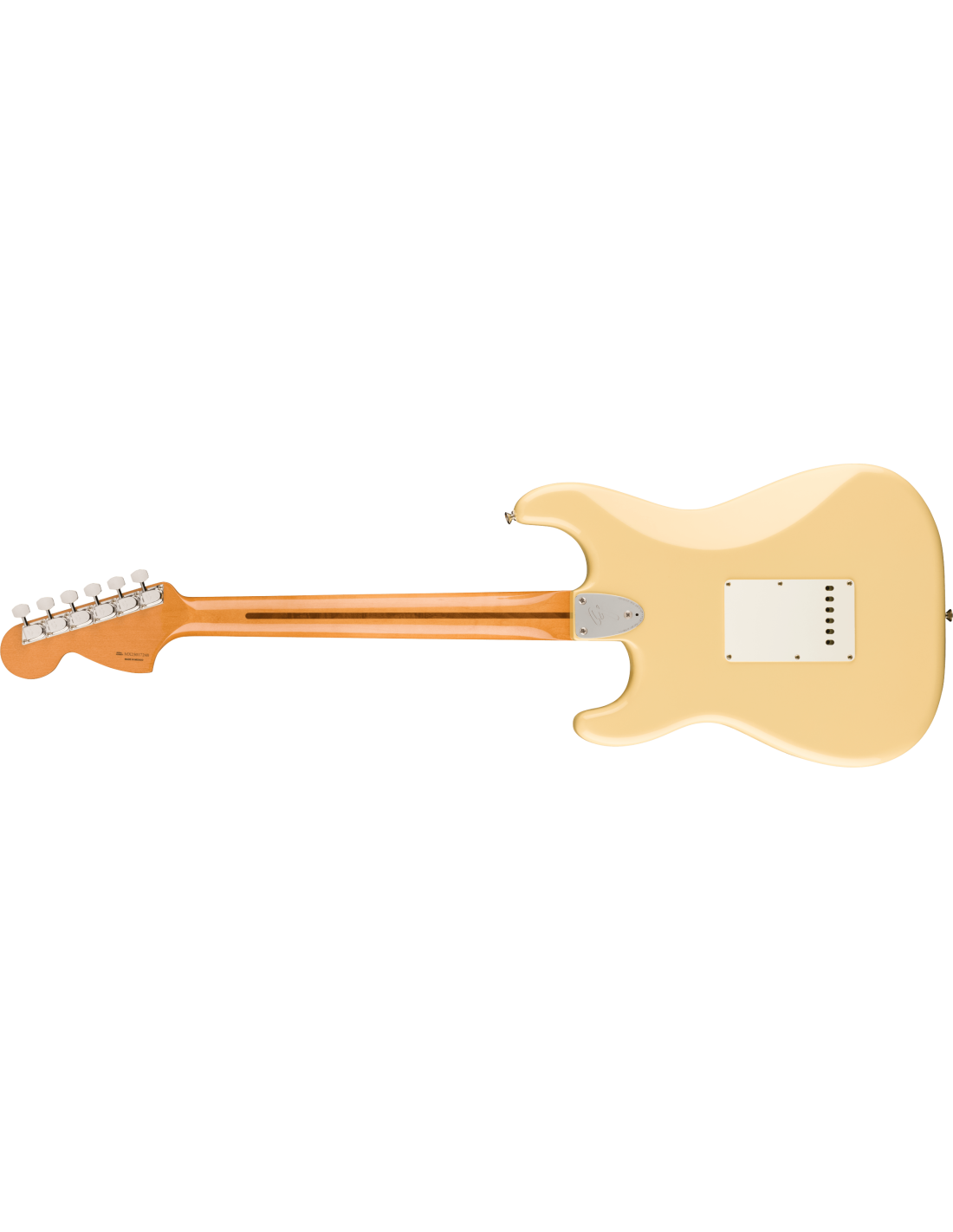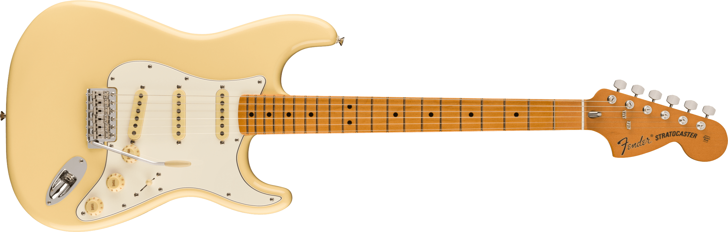 FENDER VINTERA II 70S STRAT MN VWT ist eine Solid Body E-Gitarre der Fender Vintera II 70s Stratocaster Serie, hergestellt in Mexiko, mit einem Korpus aus Erle, einem Ahornhals im '70 U Shape-Profil mit großem Fender '70 Kopf, einem Ahorngriffbrett mit 7,25" Radius, 21 Vintage Tall Bünden und schwarzen Dots, einem Sattel aus Knochen, verchromter Hardware, Fender American Vintage Style F Stamped Mechaniken und einem synchronisierten Vintage-Style Tremolo mit 6 Stahl-Sätteln. Die Elektronik mit SSS-Konfiguration besteht aus 3 Vintage-Style '70s Single-Coil Strat Tonabnehmern mit Lautstärke-, Klang- und 5-Wege-Tonabnehmer-Schaltern. Inklusive Fender Deluxe Gig Bag