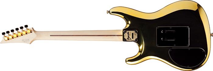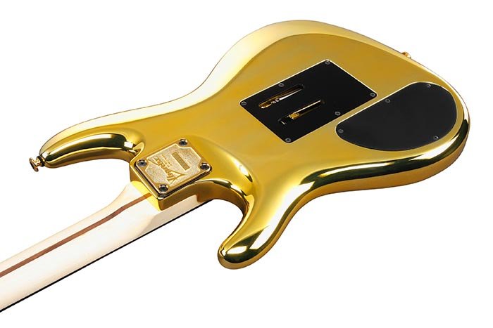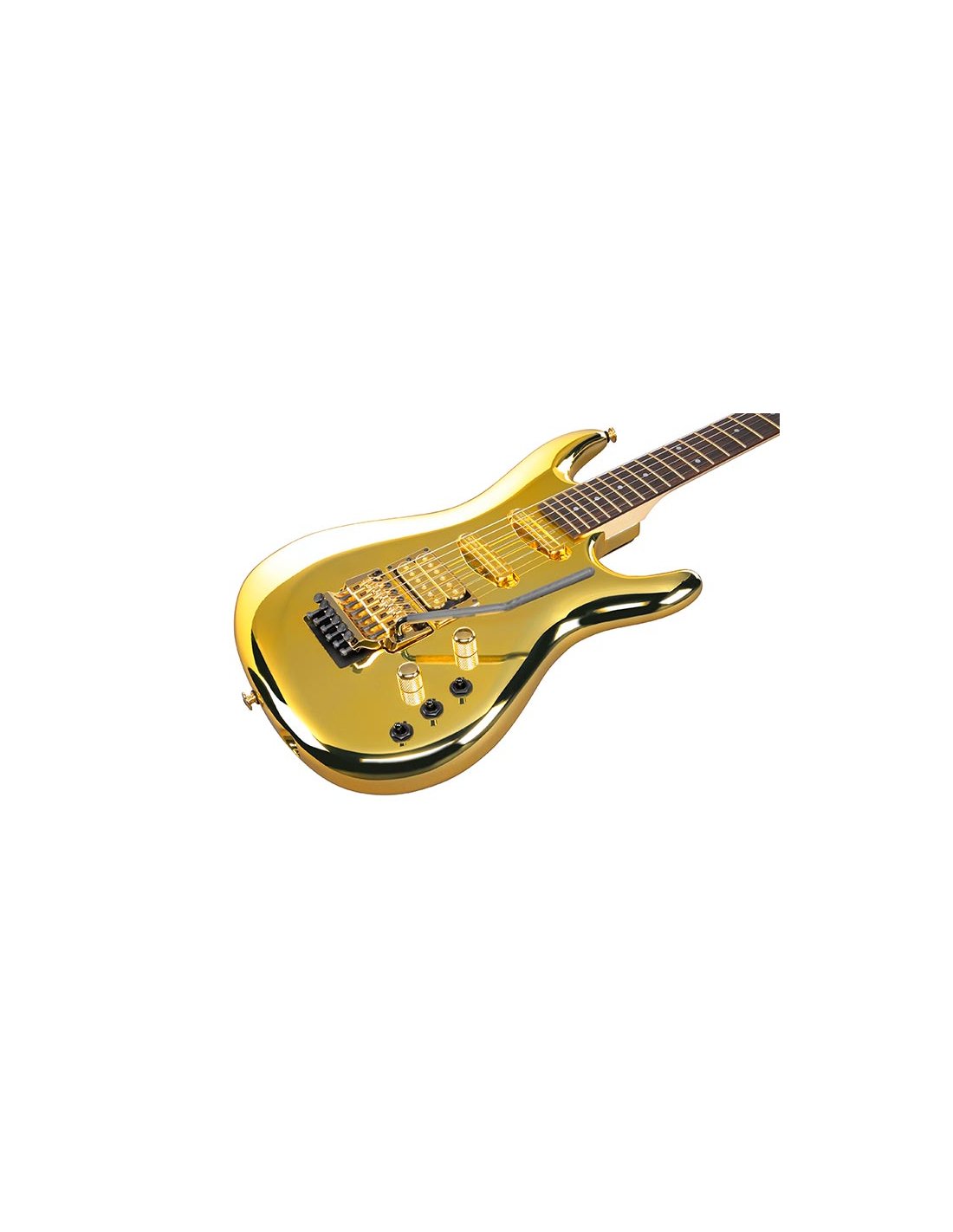 IBANEZ JS2GD ist eine E-Gitarre der Solid Body Linie Ibanez Joe Satriani Signature mit einem Korpus aus Erle, einem JS One Piece Ahornhals, einem Palisandergriffbrett mit 22 Jescar EVOgold-Bünden mit Prestige-Behandlung und Perlmutteinlagen, einem Prestige-Sattel, goldener Hardware, Gotoh 510 Mechaniken und einem Edge Tremolo mit Ultralite Arm. Die HSS-Elektronik besteht aus 2 Di Marzio Satch Track Single Coil Pickups in der Mitte und am Hals sowie einem Di Marzio FRED Humbucker am Steg mit Lautstärkereglern mit Hochpassfilter push/pull, Ton mit Coil Tap push/pull und speziellen Reglern für jeden Pickup.