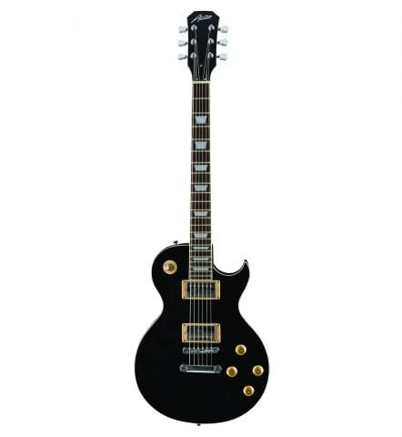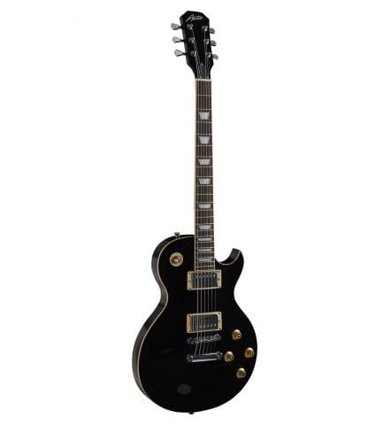 Korpus aus Mahagoni Arch Top Leimholzgriff aus Mahagoni Einlagen aus Perlmutt Griffbrett aus Techwood Sattel PPS 2 Humbucker 2 Tone- und 2 Lautstärkeregler 3-Wege-Schalter Tune-O-Matic-Brücke Vintage-Stil Mechaniken Binding aus ABS am Korpus und Griff Daddario Saiten Schwarze Lackierung