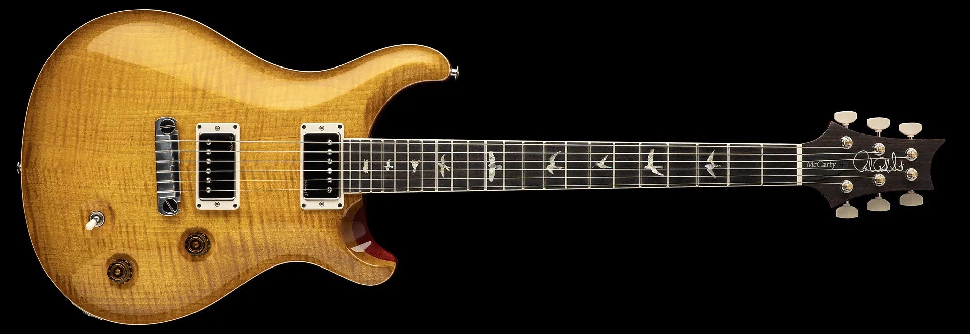 PRS CUSTOM 24-08 10 TOP MC CARTY SUNBURST ist eine E-Gitarre mit solidem Korpus, Modell Custom 24-08 10 Top mit Korpus aus Mahagoni und Fichtendecke 10 in Hochglanz-Nitro-Finish, einteiliger Mahagonihals mit dünnem Profil, Palisandergriffbrett mit 10" Radius, 24 Bünden und Birds-Inlays, PRS Double-Acting Truss Rod, PRS Sattel aus Knochen, Nickel-Hardware, PRS Phase III Locking Mechaniken mit Wing-Buttons und PRS Patented Tremolo Gen III Bridge. Die Elektronik in HH-Konfiguration besteht aus 2 PRS 85/15 Humbucker-Pickups am Steg und am Hals mit Master Volume, Master Tone, 3-Wege Toggle Pickup Switch, 2 Mini-Toggle Coil-Split Switch und 3-Wege Pickup-Wahlschalter. Inklusive PRS Hardshell Case