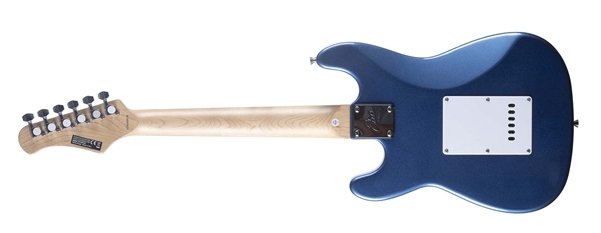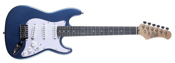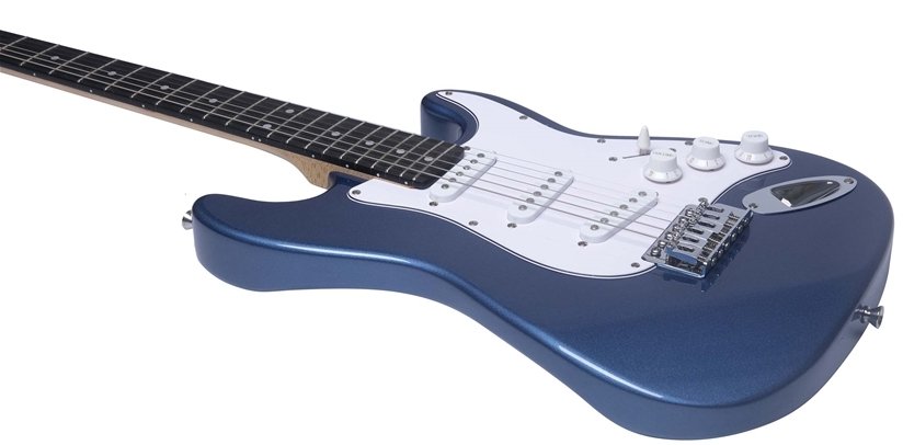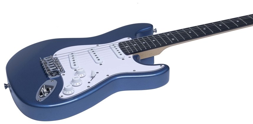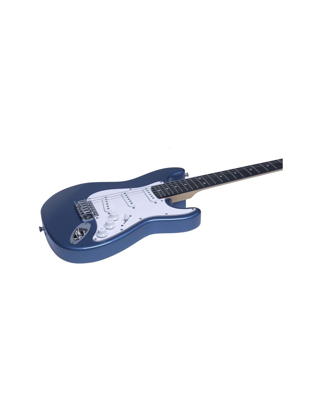 EKO ST-100 3/4 METALLIC BLUE ist eine E-Gitarre im Strat-Stil mit 3/4-Skala aus der Serie Eko "Tribute 100", mit einem Korpus aus Pappel, einem Ahornhals mit Satin-Finish im Eko Low C-Profil, einem Palisandergriffbrett mit 14" Radius und 21 Bünden, einem Sattel von 42 mm, Eko Die Cast Mechaniken, verchromtem Hardware und einem Eko Stratoid Tremolo-Bridge. Die Elektronik besteht aus einem Set von 3 Eko Standard Single Coil Pickups, mit Lautstärkeregler, 2 Tone-Reglern und einem 3-Wege-Pickup-Wahlschalter.