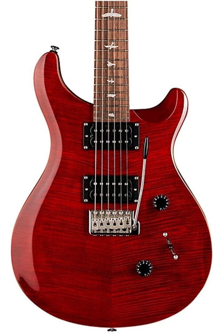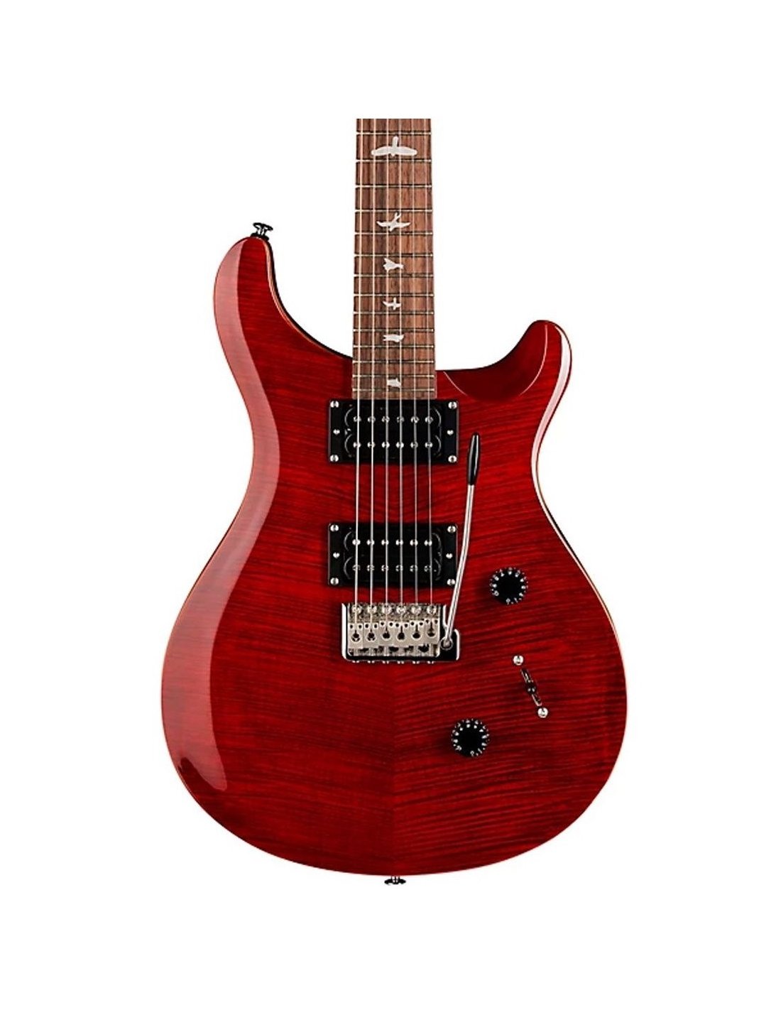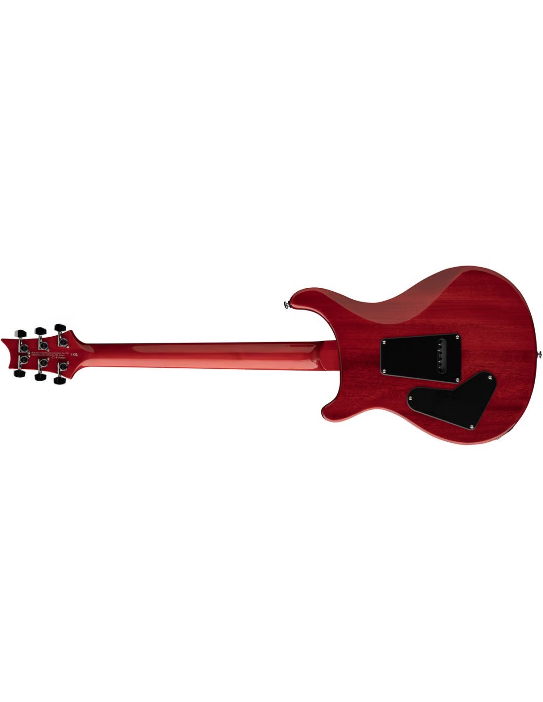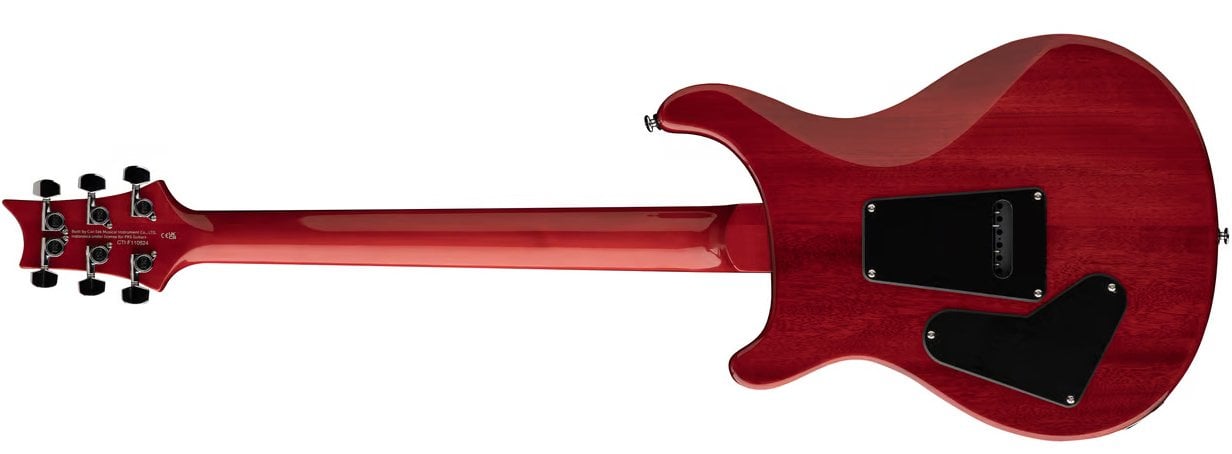 PRS SE CUSTOM 24 RUBY ist eine Solid-Body-E-Gitarre, Modell Limited Edition SE Custom 24 mit einem Korpus aus Mahagoni und einer Decke aus Ahorn mit geflammter Ahornfurnier, einem mehrschichtigen Ahornhals im Wide Thin-Profil, einem Palisandergriffbrett mit 10" Radius, 24 Bünden und Birds-Inlays, PRS Double-Acting Truss Rod, PRS Sattel aus Knochen, Nickel-Hardware, PRS Designed Tuners und PRS Patented Tremolo-Brücke. Die Elektronik mit HH-Konfiguration besteht aus 2 PRS 85/15 "S" Humbucker-Pickups am Steg und am Hals mit Master Volume-Regler, Master Tone-Regler push/pull und 3-Wege Toggle Pickup Switch. Inklusive PRS Gigbag