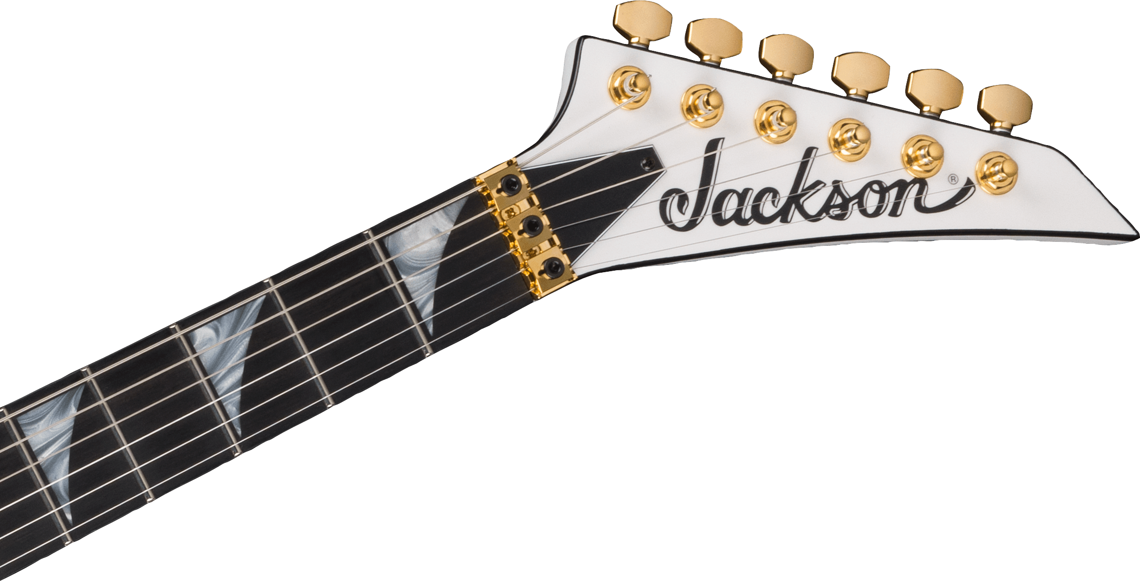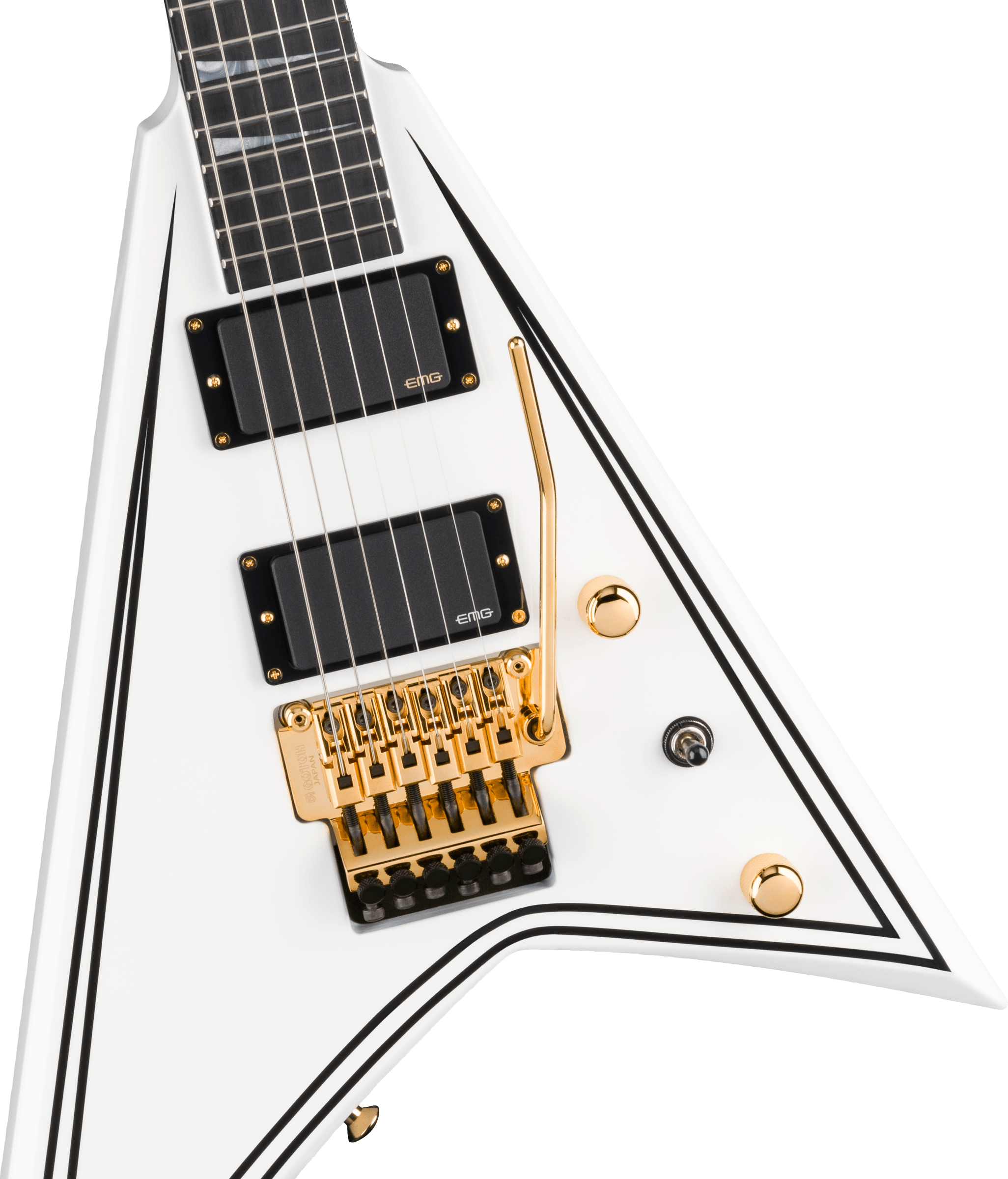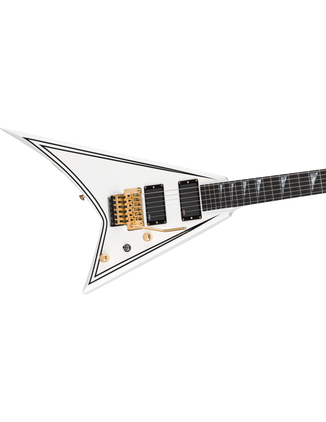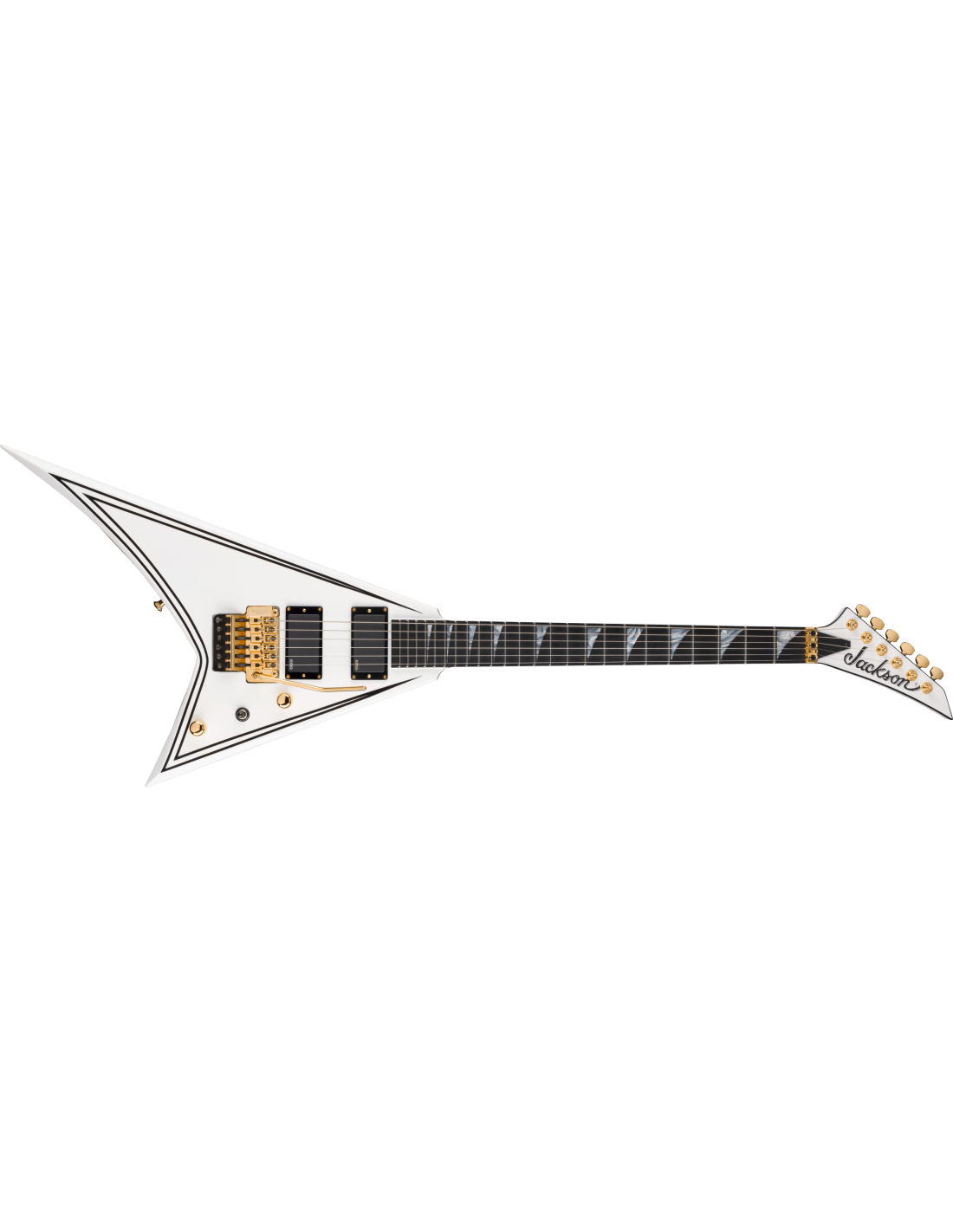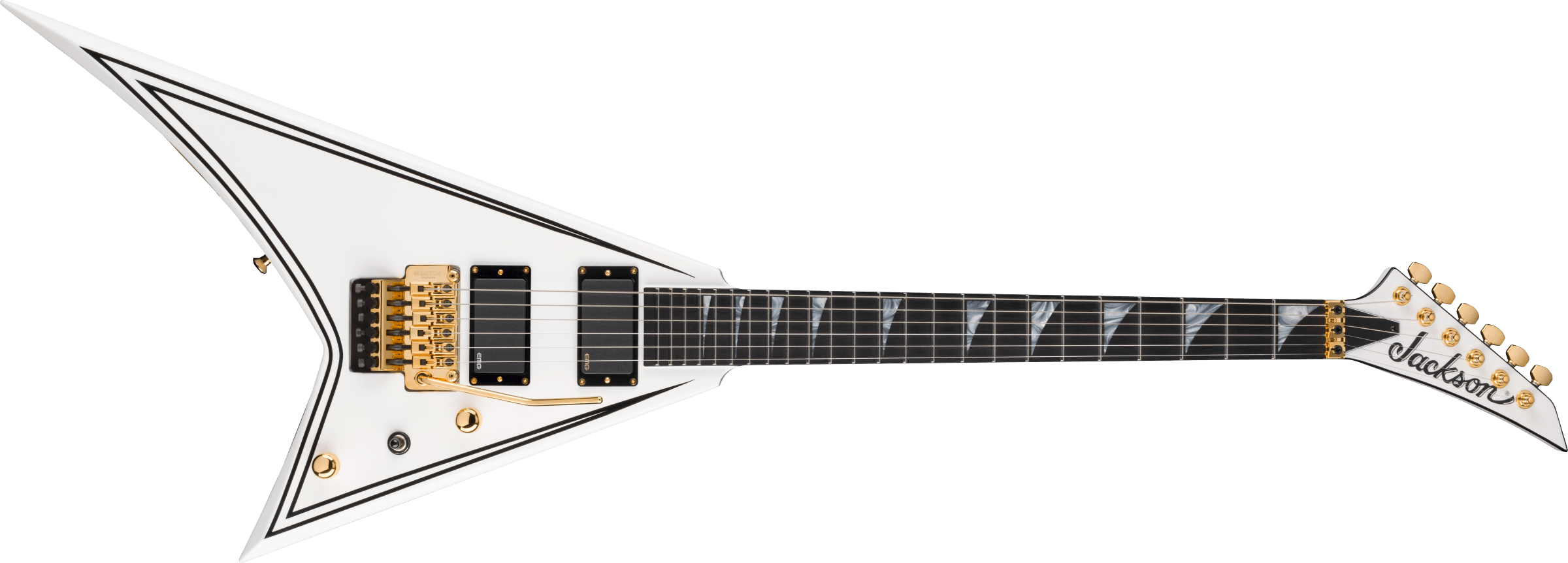 JACKSON MJ SRS RR24 MG WEISS MIT SCHWARZEN PINSTRIPES + CASE ist eine Solid Body E-Gitarre, Serie MJ (Made in Japan), Modell Rhoads RR24MG mit einem Korpus aus Alder (Erle) und Hochglanz-Finish, durchgehender Hals aus 3-teiligem Ahorn mit Graphitverstärkungen, Griffbrett aus Ebenholz mit einem compound Radius von 12"-16" und 24 Jumbo-Bünden, Pearloid Sharkfin Einlagen mit seitlichen Luminlay-Bundmarkierungen, Floyd Rose Original Locking Sattel, Gold-Hardware, Gotoh Sealed Die-Cast Mechaniken und Gotoh GE1996T Series Double-Locking Tremolo (versenkt). Die aktive Elektronik in HH-Konfiguration besteht aus 2 EMG 81 Humbucker am Steg und EMG 85 am Hals, Master Volume-Regler, Master Tone-Regler und einem 3-Wege Pickup-Wahlschalter. Inklusive Jackson Foam Core Case