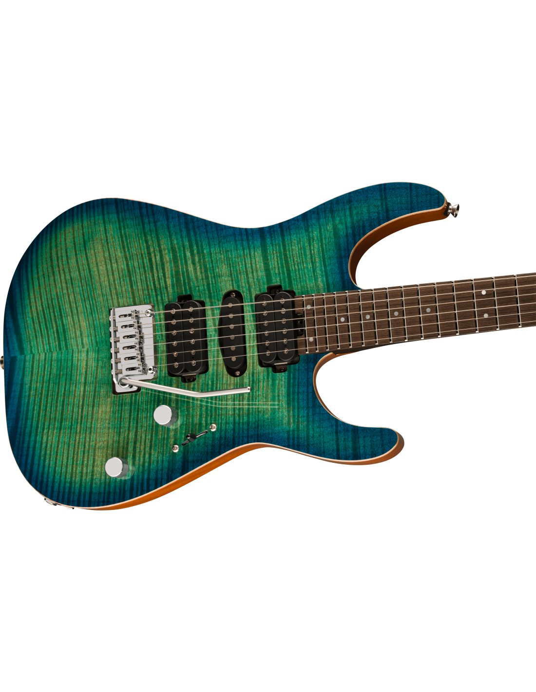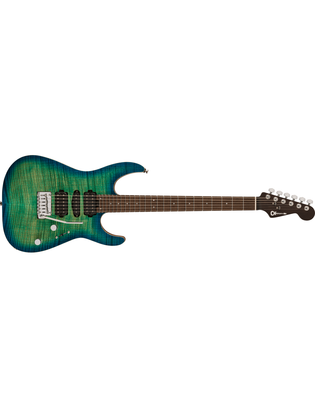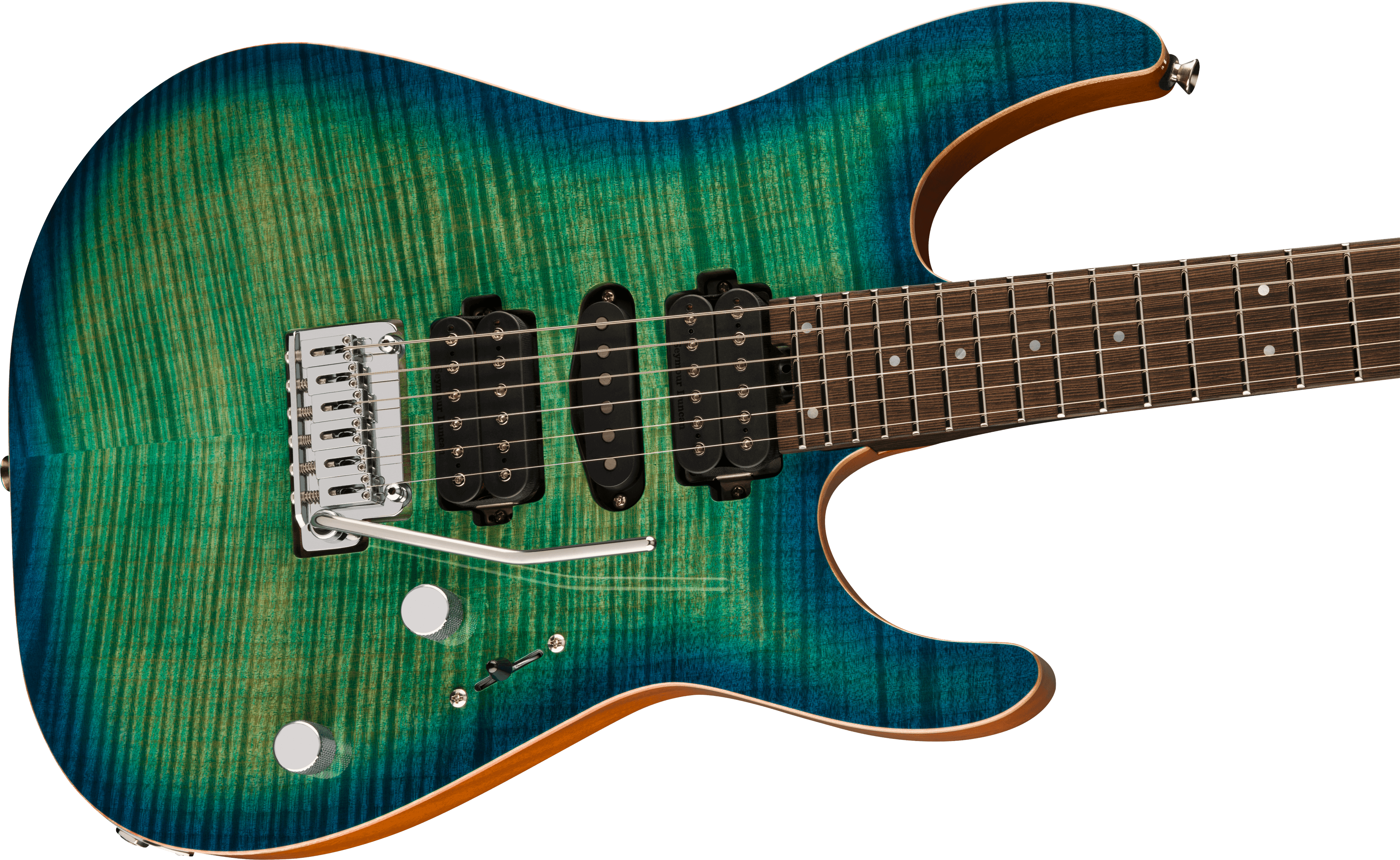 CHARVEL MJ DK24 HSH CARRIBEAN BURST W/CASE ist eine Solid Body E-Gitarre im Dinky-Format, Serie MJ DK24 mit einem Korpus aus glänzendem Mahagoni, einem Wenge-Hals mit Speed Neck-Profil und abgerundeten Kanten sowie einer Graphitverstärkung, einem Wenge-Griffbrett mit einem kompositen Radius von 12"-16" mit 24 Jumbo-Bünden und Perl-Dots-Inlays, einem Graph Tech TUSQ XL Sattel, verchromtem Hardware, Charvel-Branded Druckguss-Mechaniken und einem Gotoh Custom 510 Tremolo. Die Elektronik in HSH-Konfiguration besteht aus 1 Seymour Duncan Full Shred TB-10 Humbucker am Steg, 1 Seymour Duncan Custom Flat Strat SSL-6 Single-Coil in der Mitte und 1 Seymour Duncan Alnico II Pro APH-1N Humbucker am Hals, 500K EVH Bourns Potentiometer, Lautstärke- und Toneinstellungen sowie einem 5-Wege-Pickup-Wahlschalter. Inklusive Charvel Multi-Fit Hardshell Gig Bag