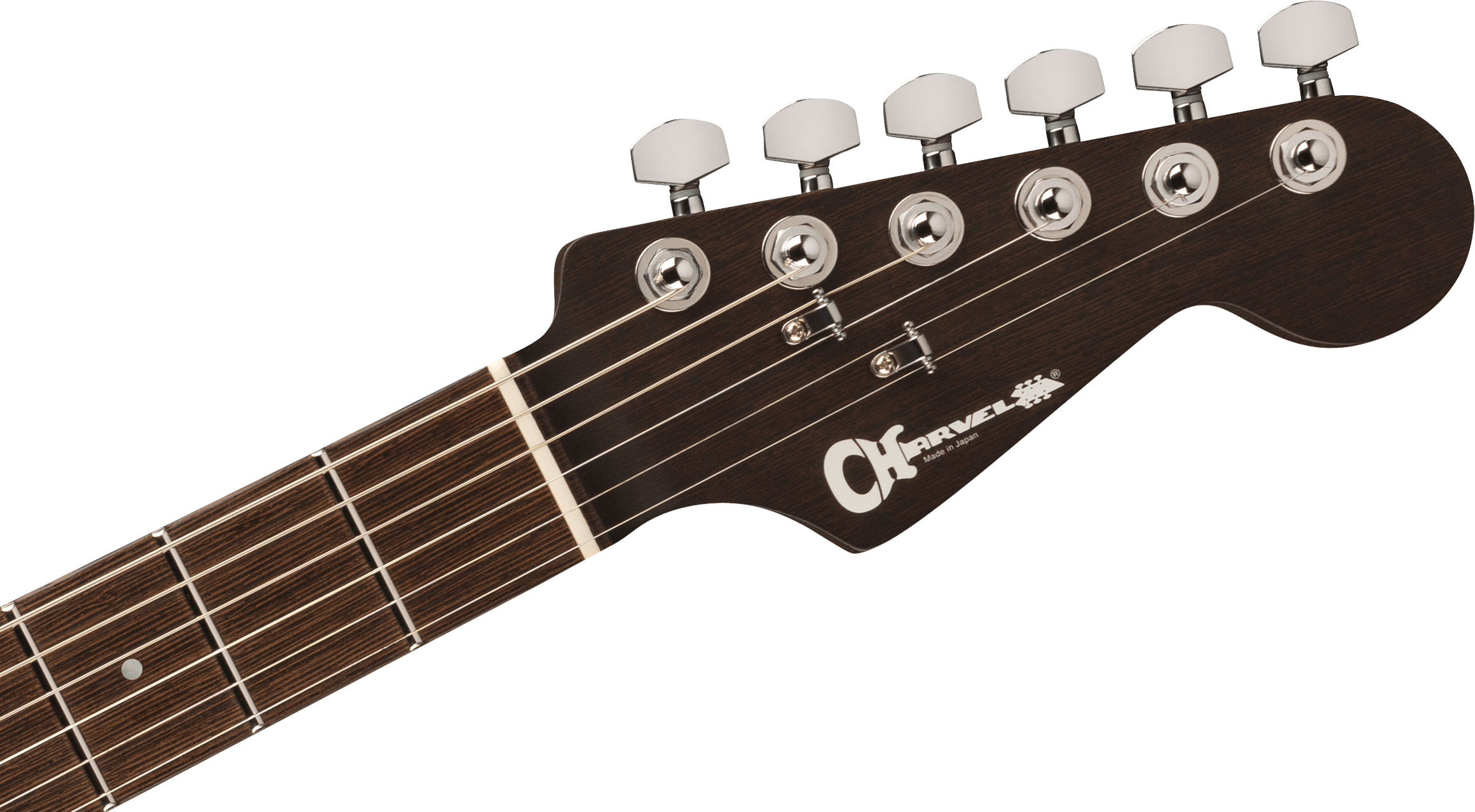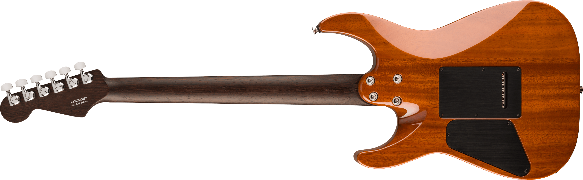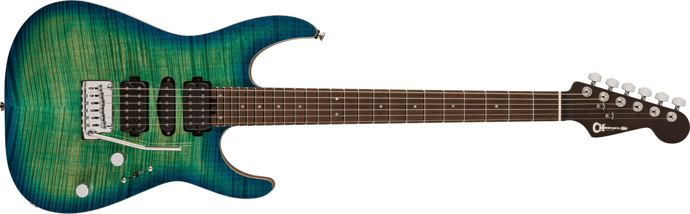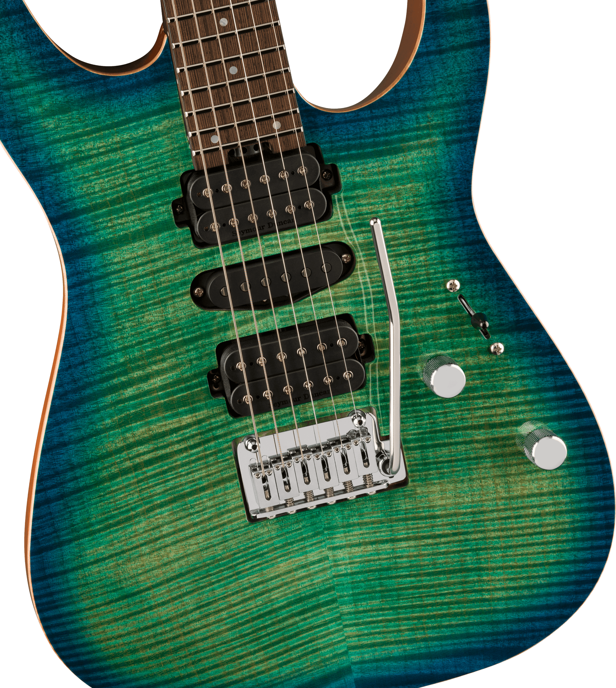 CHARVEL MJ DK24 HSH CARRIBEAN BURST W/CASE ist eine Solid Body E-Gitarre im Dinky-Format, Serie MJ DK24 mit einem Korpus aus glänzendem Mahagoni, einem Wenge-Hals mit Speed Neck-Profil und abgerundeten Kanten sowie einer Graphitverstärkung, einem Wenge-Griffbrett mit einem kompositen Radius von 12"-16" mit 24 Jumbo-Bünden und Perl-Dots-Inlays, einem Graph Tech TUSQ XL Sattel, verchromtem Hardware, Charvel-Branded Druckguss-Mechaniken und einem Gotoh Custom 510 Tremolo. Die Elektronik in HSH-Konfiguration besteht aus 1 Seymour Duncan Full Shred TB-10 Humbucker am Steg, 1 Seymour Duncan Custom Flat Strat SSL-6 Single-Coil in der Mitte und 1 Seymour Duncan Alnico II Pro APH-1N Humbucker am Hals, 500K EVH Bourns Potentiometer, Lautstärke- und Toneinstellungen sowie einem 5-Wege-Pickup-Wahlschalter. Inklusive Charvel Multi-Fit Hardshell Gig Bag