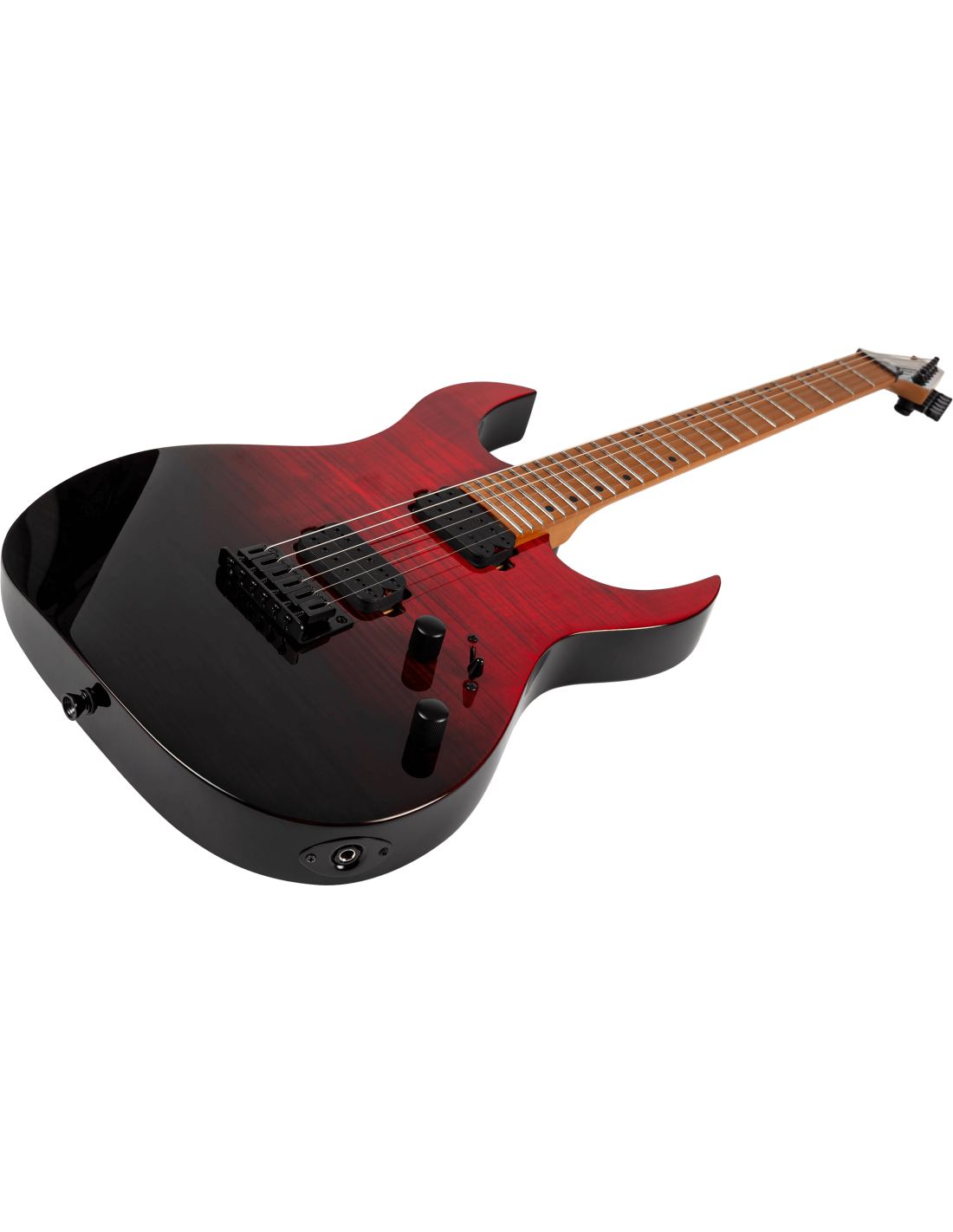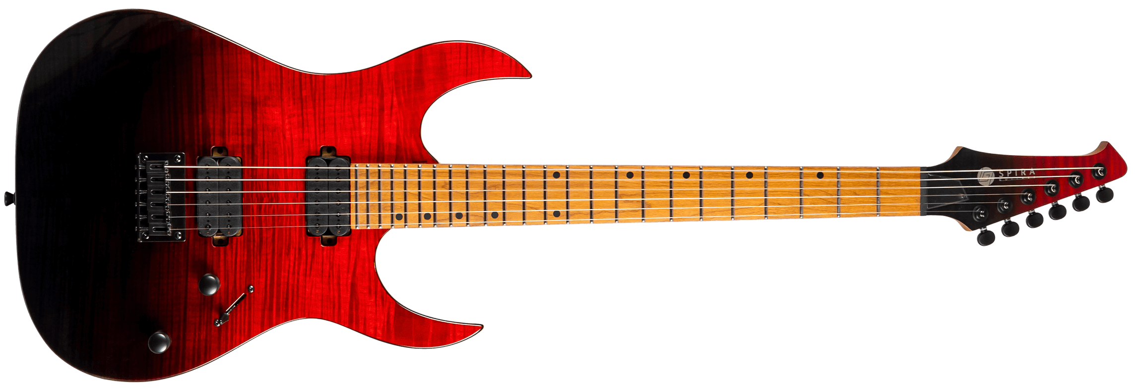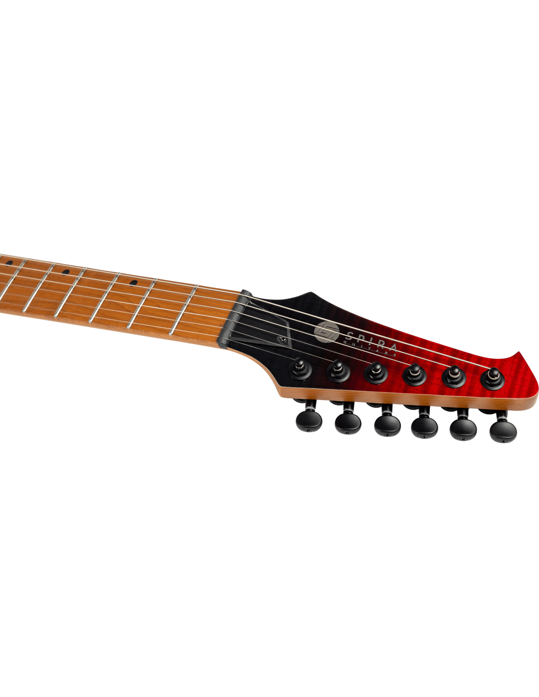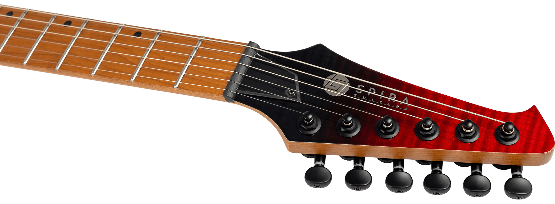 SPIRA S-450 TRD HH TRANSPARENT RED ist eine Solid Body E-Gitarre, Serie S-450 mit einem Korpus aus geröstetem Pappelholz und einer Decke aus geflammtem Ahorn, einem Hals aus kanadischem geröstetem Ahorn im Modern D-Profil, einem gerösteten Ahorn-Griffbrett mit einem Radius von 14" und 24 Jumbo-Bünden sowie schwarzen Punkt-Inlays, einem Sattel aus synthetischem Knochen, schwarzem Hardware, einem Double Action Truss Rod, einer Reverse Kopfplatte, Locking Black Mechaniken und einem festen Steg. Die Elektronik in HH-Konfiguration besteht aus 2 Humbucker-Spira Villain Custom Made Ceramic Magnet-Pickups mit Lautstärke- und Tone-Regler sowie einem 3-Wege-Pickup-Wahlschalter.