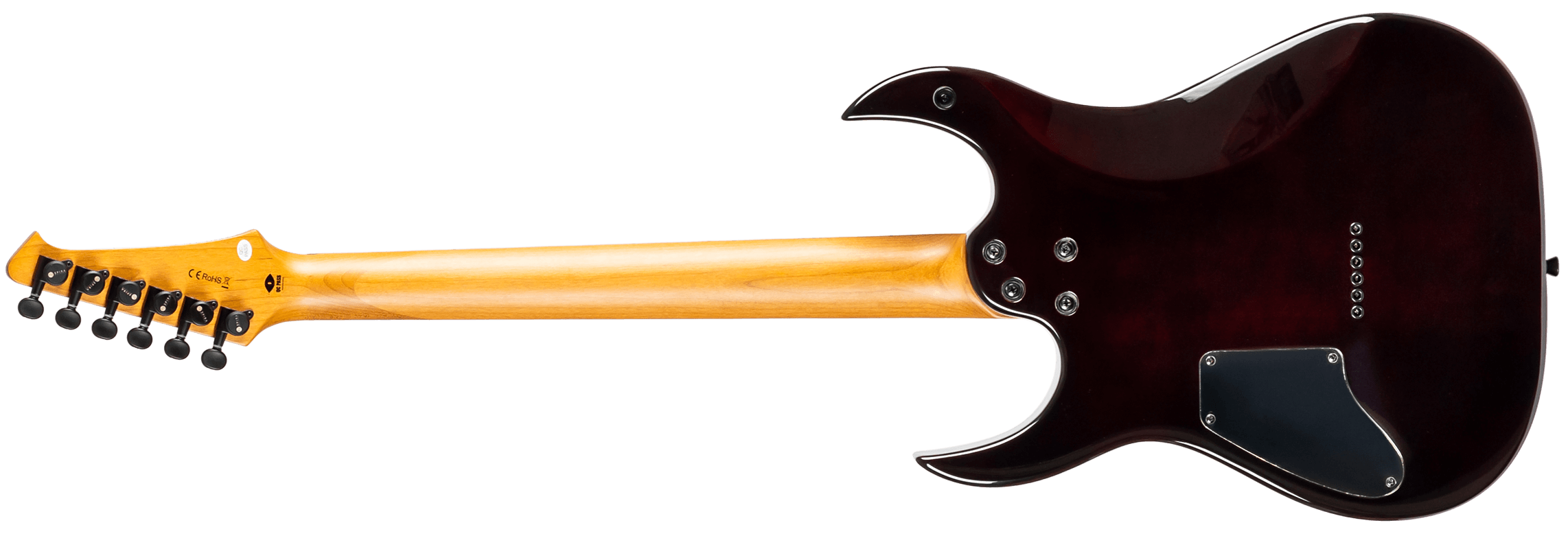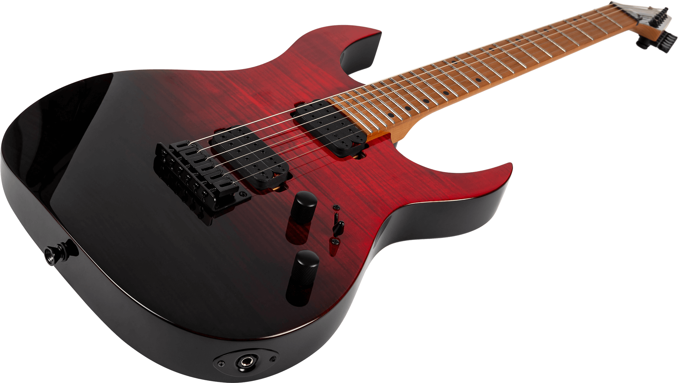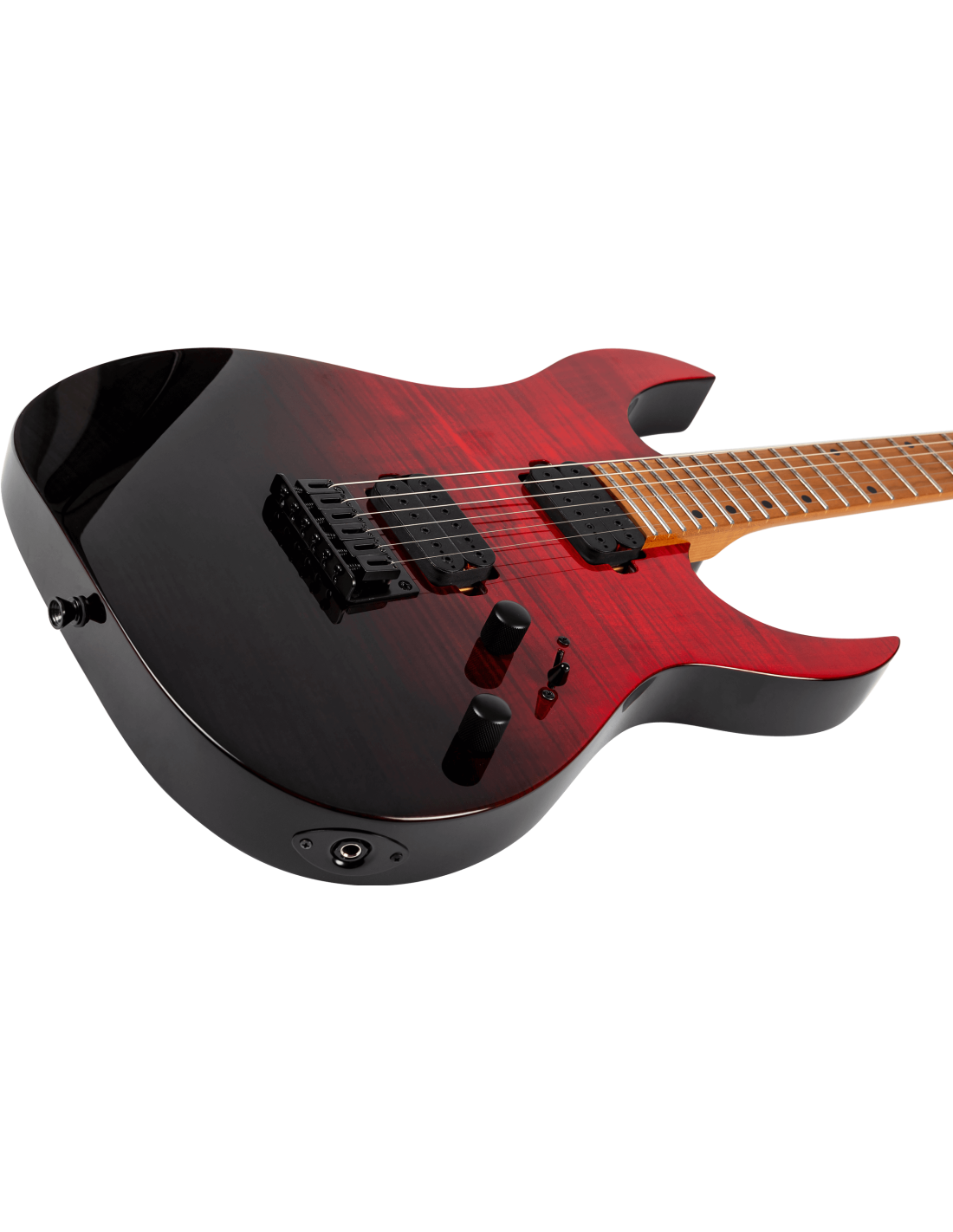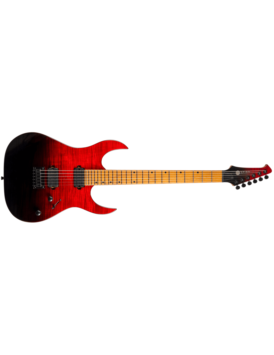 SPIRA S-450 TRD HH TRANSPARENT RED ist eine Solid Body E-Gitarre, Serie S-450 mit einem Korpus aus geröstetem Pappelholz und einer Decke aus geflammtem Ahorn, einem Hals aus kanadischem geröstetem Ahorn im Modern D-Profil, einem gerösteten Ahorn-Griffbrett mit einem Radius von 14" und 24 Jumbo-Bünden sowie schwarzen Punkt-Inlays, einem Sattel aus synthetischem Knochen, schwarzem Hardware, einem Double Action Truss Rod, einer Reverse Kopfplatte, Locking Black Mechaniken und einem festen Steg. Die Elektronik in HH-Konfiguration besteht aus 2 Humbucker-Spira Villain Custom Made Ceramic Magnet-Pickups mit Lautstärke- und Tone-Regler sowie einem 3-Wege-Pickup-Wahlschalter.