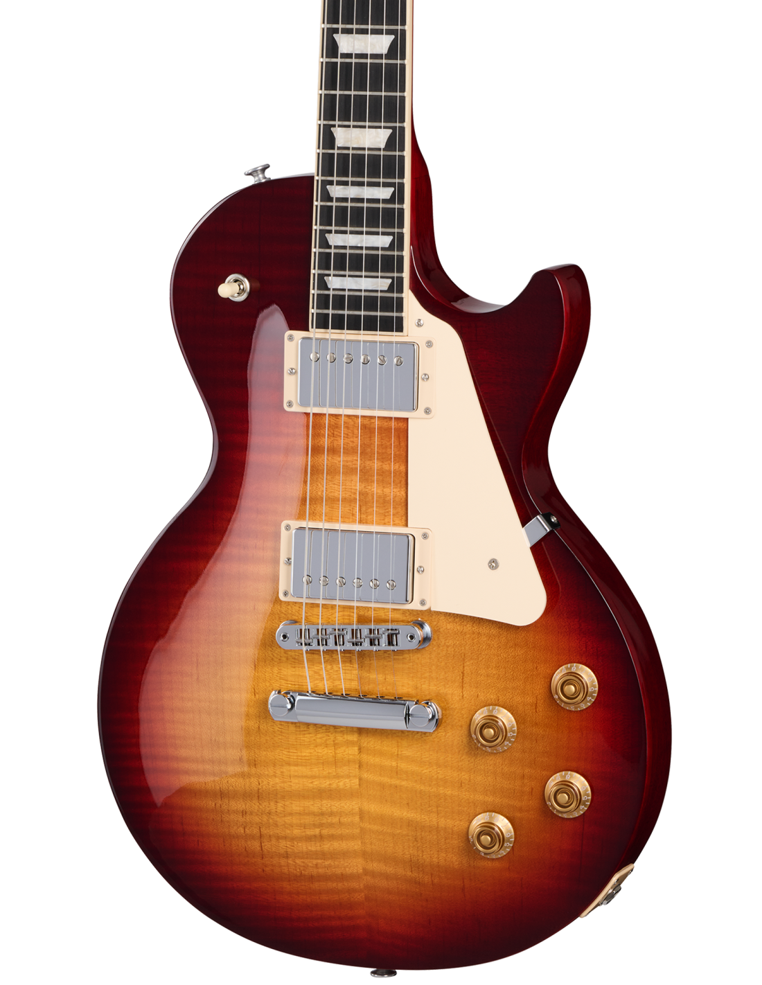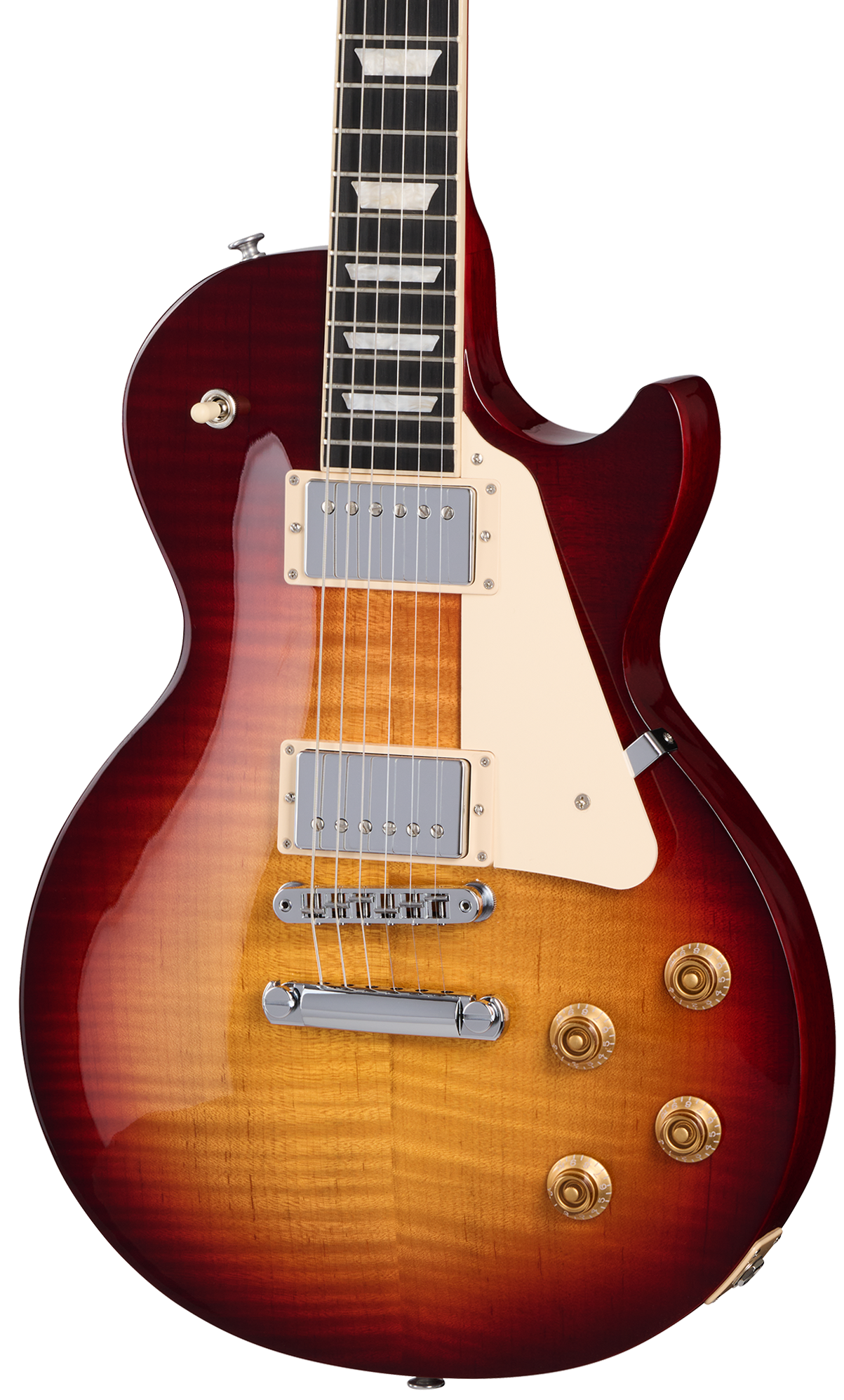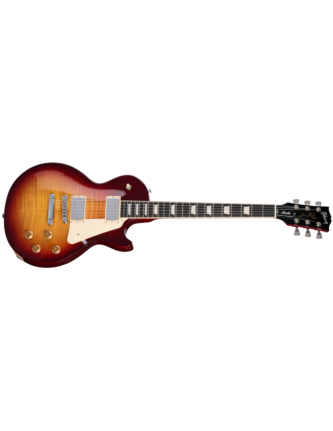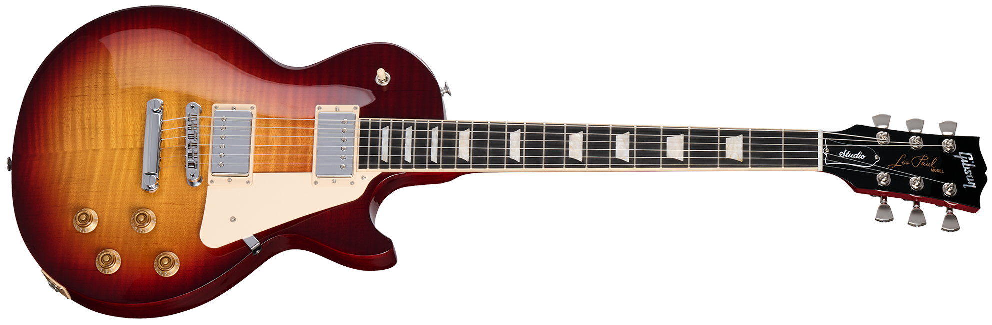 GIBSON LES PAUL STUDIO SESSION BOURBON BURST ist eine E-Gitarre im Solid Body-Design, Modell Gibson Les Paul Studio Session, mit einem Korpus aus Mahagoni Ultra Modern weight-relieved und einer Decke aus geflammtem AA-Ahorn, einem Mahagonihals mit SlimTaper-Profil, einem Ebenholzgriffbrett mit 12" Radius und 22 Medium-Jumbo-Bünden sowie Acrylic Trapezoid Einlagen, einem Graph Tech Sattel von 43mm, Chrom-Hardware, Grover Rotomatic Mechaniken mit Keystone-Stimmwirbeln und einem Aluminium Nashville Tune-O-Matic Steg mit Aluminium Stop Bar. Die Elektronik in HH-Konfiguration besteht aus 2 Gibson Classic '57 Humbucker-Pickups, mit 2 Master Volume-Reglern mit Push/Pull (Coil Tap), 2 Master Tone-Reglern mit Push/Pull (Phasenumkehrung und True Bypass) und einem 3-Wege-Pickup-Wahlschalter. Inklusive ist das Gibson Soft Shell Case, ein Gibson USA Gurt und ein Gibson Zubehörkit.