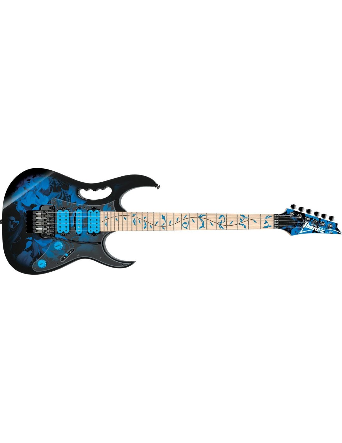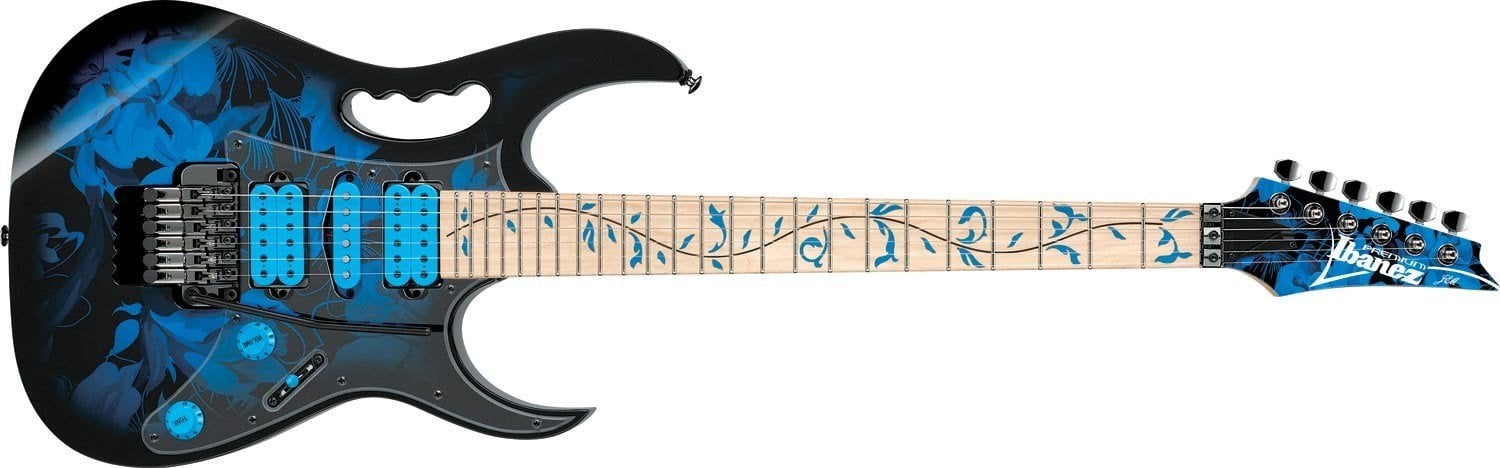 E-Gitarre Ibanez JEM77P-FBFP Farbe FLOREAL BLUE. Die Ibanez JEM77P-FBFP ist eine E-Gitarre mit 6 Saiten. Die technischen Merkmale umfassen einen Korpus aus amerikanischem Erle, einen Wizard 5pc Hals aus Ahorn und Walnuss, ein Palisandergriffbrett mit Einlage "Tree of Life", Radius 400mm, 24 Jumbo-Bünde, Edge II Tremolo-Brücke, DiMarzio Gravity Storm Humbucker (Hals), DiMarzio Evolution Single Coil (Mitte) und DiMarzio Gravity Storm Humbucker (Steg). Tasche im Lieferumfang enthalten.