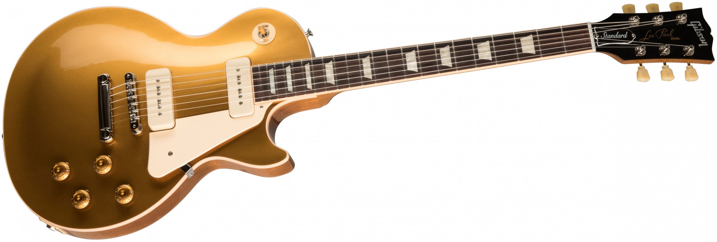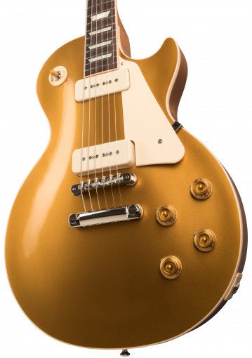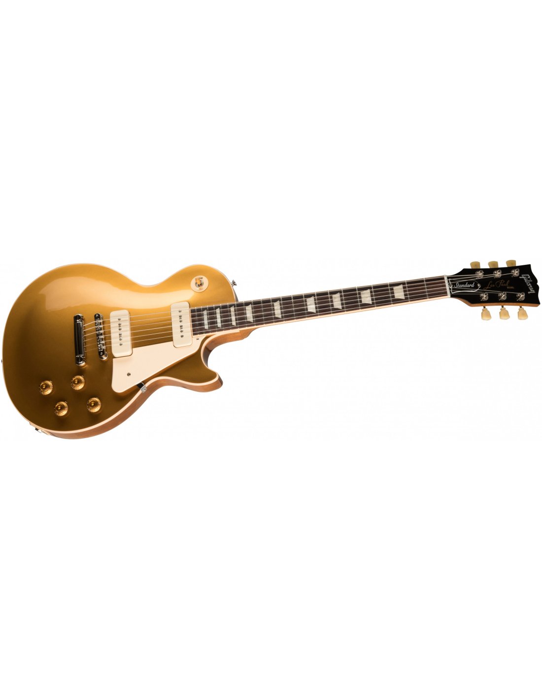 Chitarra Elettrica Gibson Les Paul Standard '50s P90 colore GOLD TOP. La Gibson Les Paul Standard '50s Gold Top P90 è una chitarra elettrica a 6 corde, prodotta negli Stati Uniti. Le caratteristiche tecniche includono corpo in mogano massello senza alcun weigh relief con top in acero, manico in mogano arrotondato stile anni '50, tastiera in palissandro con 22 tasti e classici intarsi Trapezoid, due pickup BurstBucker 61R e BurstBucker 61T Humbucker, ponte ABR-1 Tune-O-Matic, cordiera Stop Bar in alluminio, meccaniche Grover Rotomatics e manopole invecchiate dorate.
