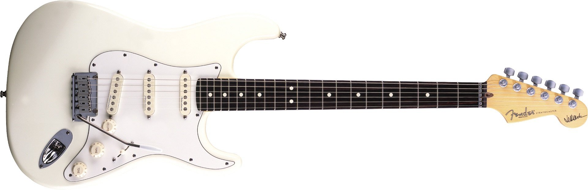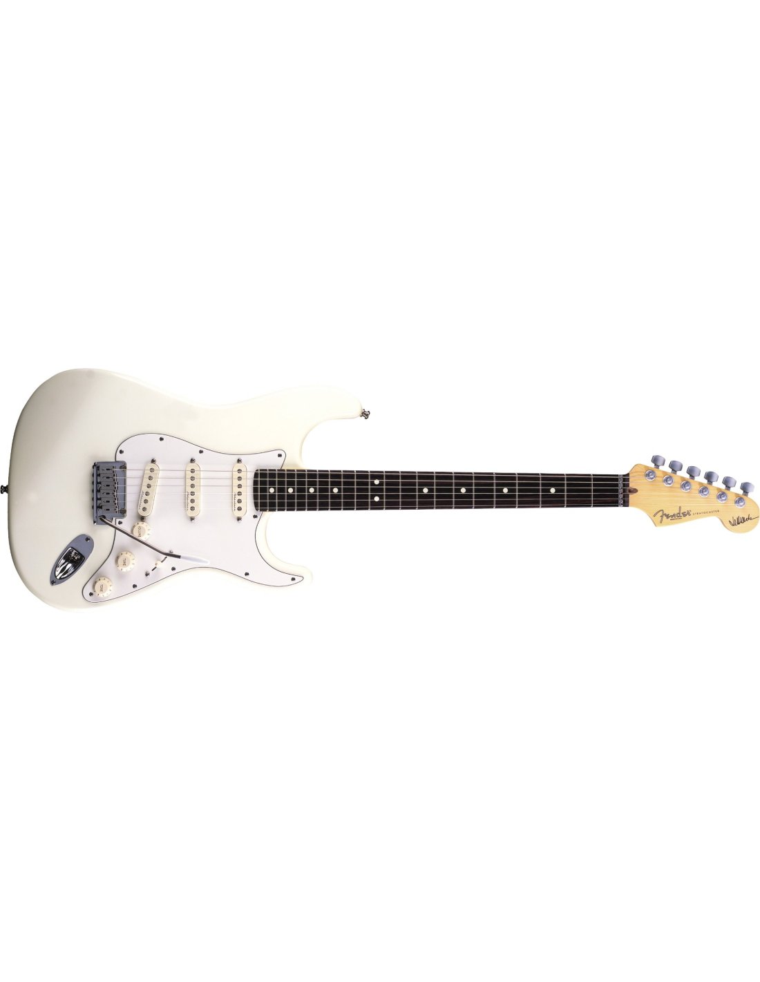 FENDER STRATOCASTER JEFF BECK OLYMPIC WHITE è una chitarra elettrica solid body Fender Stratocaster Jeff Beck Signature con corpo in ontano, manico in acero profilo C Shape, tastiera in palissandro a raggio Modern 9,5" con 22 tasti Medium Jumbo in acciaio ed intarsi dot avorio, capotasto LSR Roller, hardware cromato, Truss Rod Bi-Flex, meccaniche Deluxe Staggered Cast/Sealed Locking e ponte Tremolo sincronizzato 2-Punti con sellette in acciaio. L'elettronica a configurazine SSS consiste in 3 pickup Single Coil Fender Hot Noiseless Single-Coil Strat con controlli di volume, tono e selettore pick up a 5 vie. Include Fender Vintage Tweed Case.
