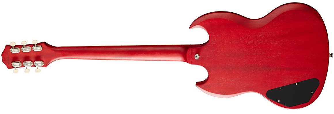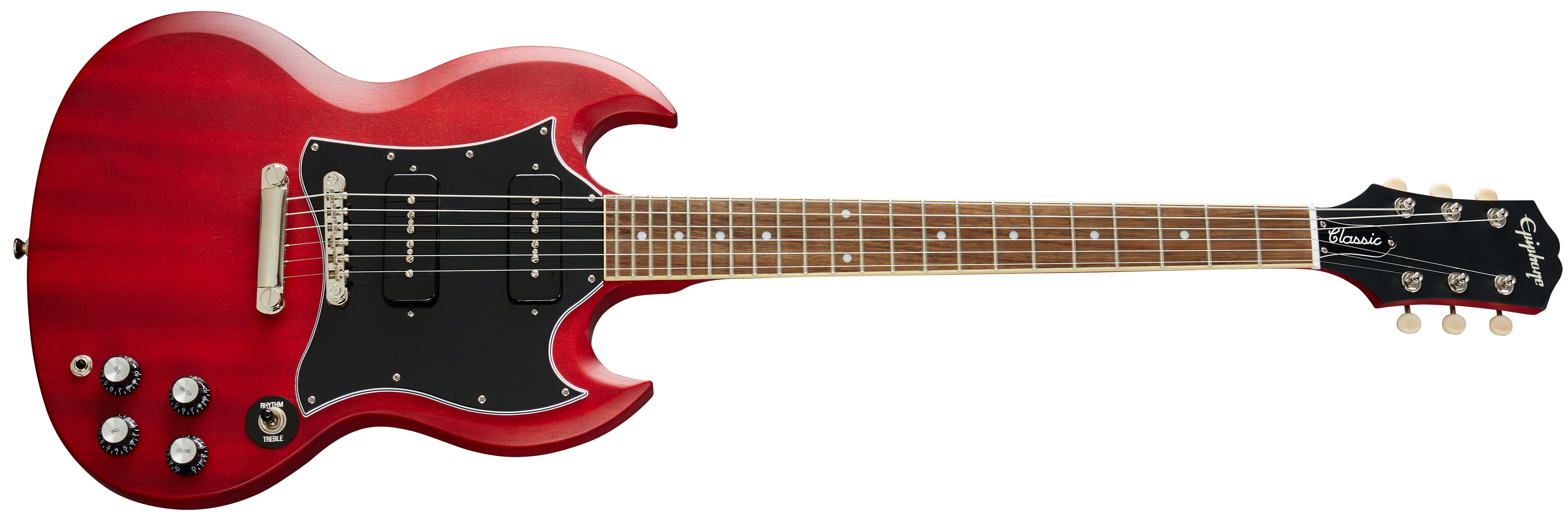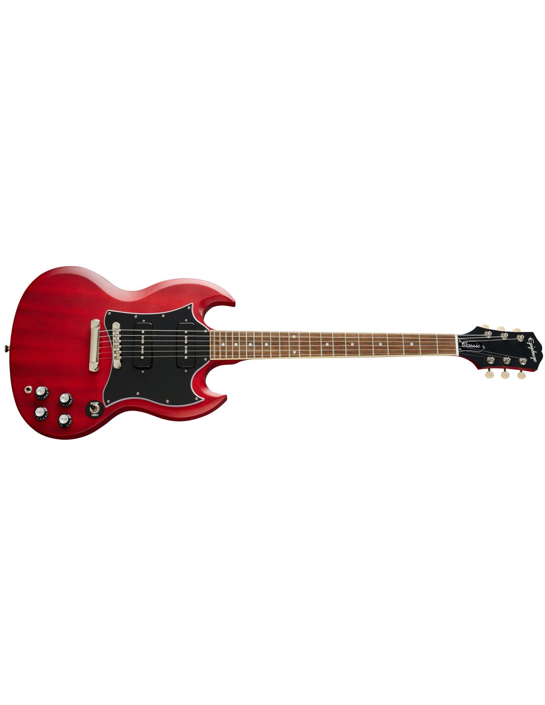 EPIPHONE SG CLASSIC WORN P-90S WC ist eine E-Gitarre der Serie SG Classic Worn P-90s mit einem Korpus aus Mahagoni mit Worn-Finish, einem Mahagonihals im 60s SlimTaper-Profil, einem Griffbrett aus indischem Lorbeer mit einem Radius von 12" und 22 Medium Jumbo-Bünden sowie Dots-Inlays, einem Graph Tech-Sattel, Nickel-Hardware, Epiphone Deluxe-Mechaniken mit Elfenbeinreglern und einer Epiphone LockTone ABR-Brücke mit Epiphone LockTone Stopbar. Die Elektronik besteht aus 2 Epiphone P-90 PRO Soapbar-Pickups, mit 2 Lautstärkereglern, 2 Tone-Reglern und einem 3-Wege-Pickup-Wahlschalter.