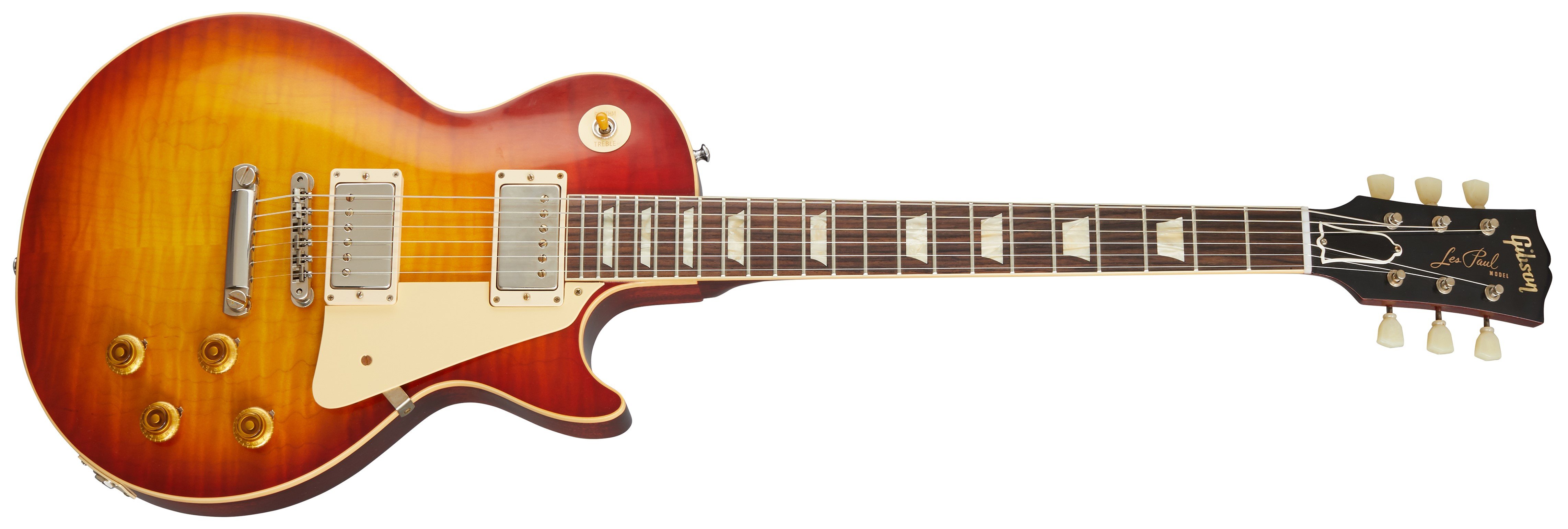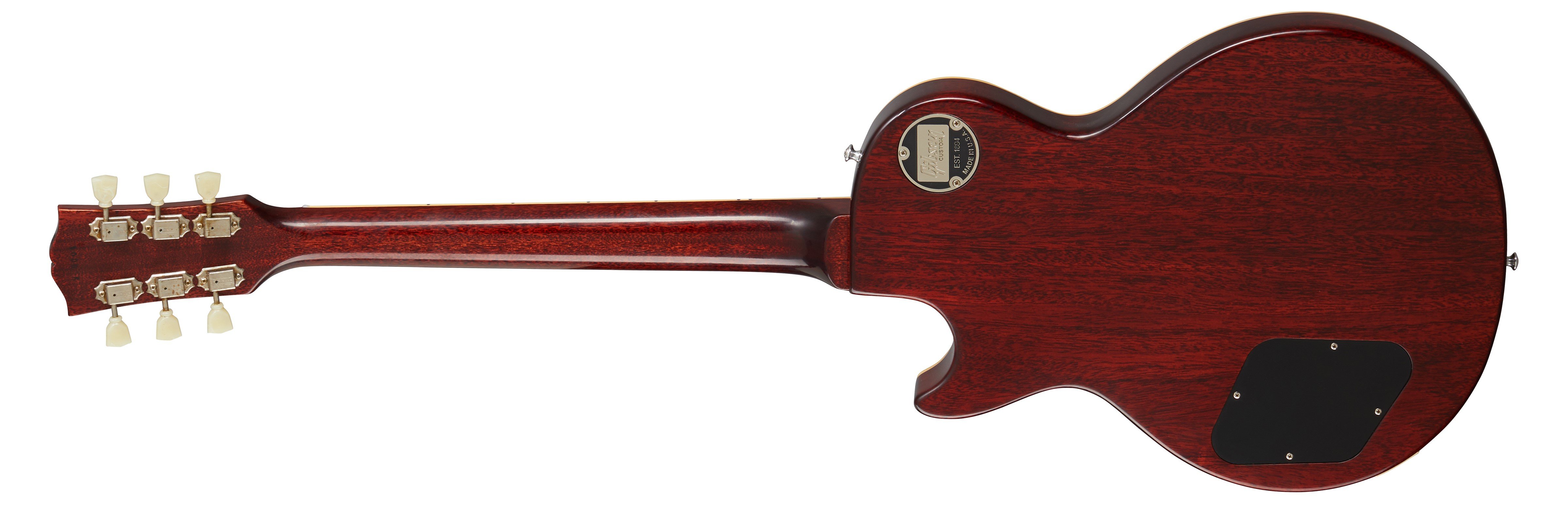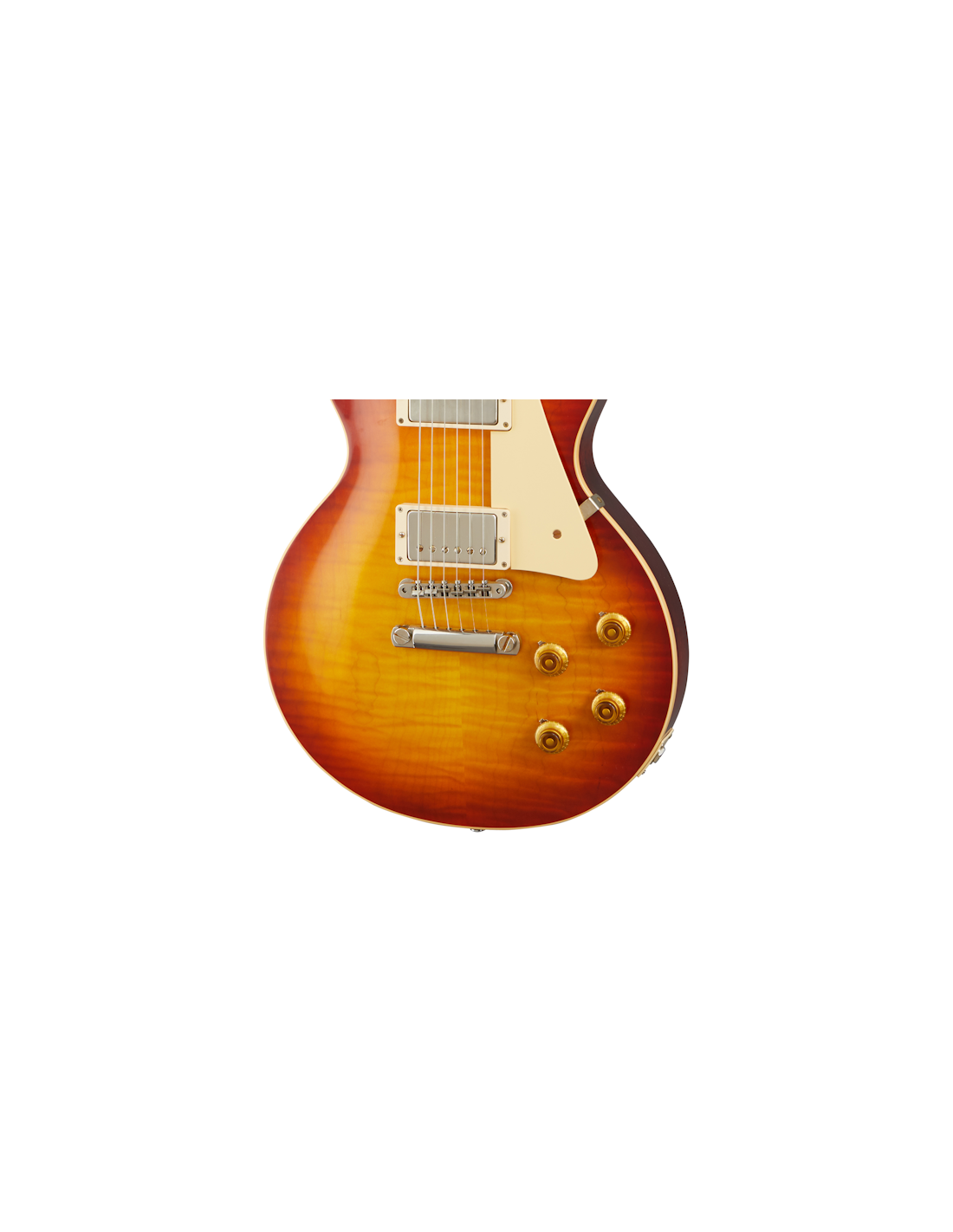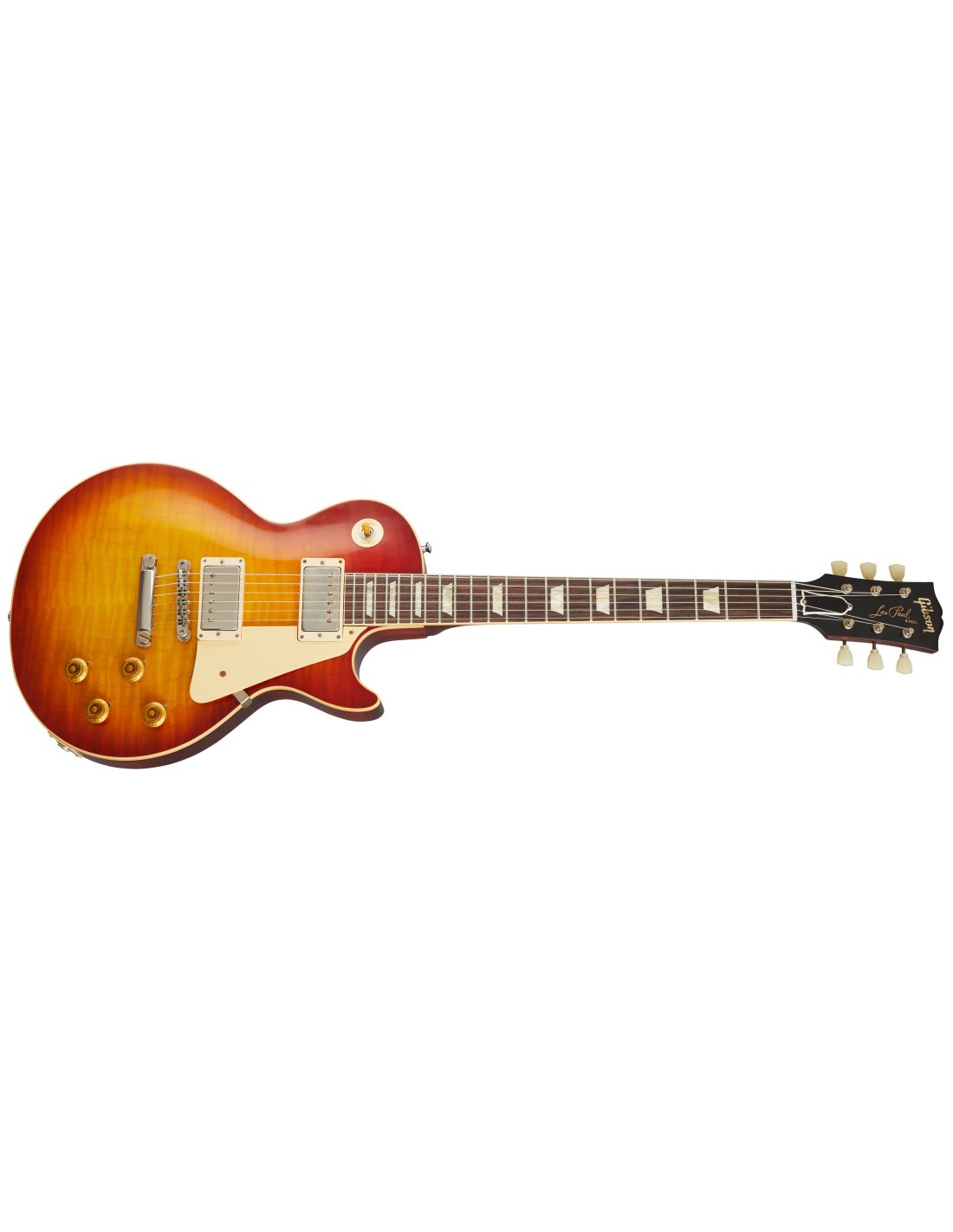 GIBSON 1959 LES PAUL STANDARD REISSUE WASHED CHERRY BURST ist eine E-Gitarre mit solidem Korpus, Modell Gibson Custom 1959 Les Paul Standard Reissue, mit einem Korpus aus massivem Mahagoni, ausgewählt nach Gewicht, und einer Decke aus geflammtem Ahorn mit VOS-Finish, einem Mahagonihals mit dem Profil Authentic '59 Medium "C", einem Griffbrett aus indischem Palisander mit 12" Radius, 22 Historic Medium Jumbo Bünden und trapezförmigen Einlagen aus gealtertem Celluloid, einem Sattel aus Nylon, vernickeltem Hardware, Kluson Single Line-Single Ring Mechaniken aus Nickel und einem Gibson ABR-1 Tune-O-Matic No-Wire mit Lightweight Aluminum Stop Bar. Die Elektronik mit HH-Konfiguration besteht aus 2 Gibson CustomBucker Alnico III Tonabnehmern am Steg und am Hals mit CTS-Potis, Papier-Öl-Kondensatoren, 2 Master Volume-Reglern, 2 Master Tone-Reglern und einem 3-Wege-Tonabnehmer-Wahlschalter. Inklusive Gibson Brown Lifton 5-Latch Case und Gibson-Zertifikat zur Echtheit.