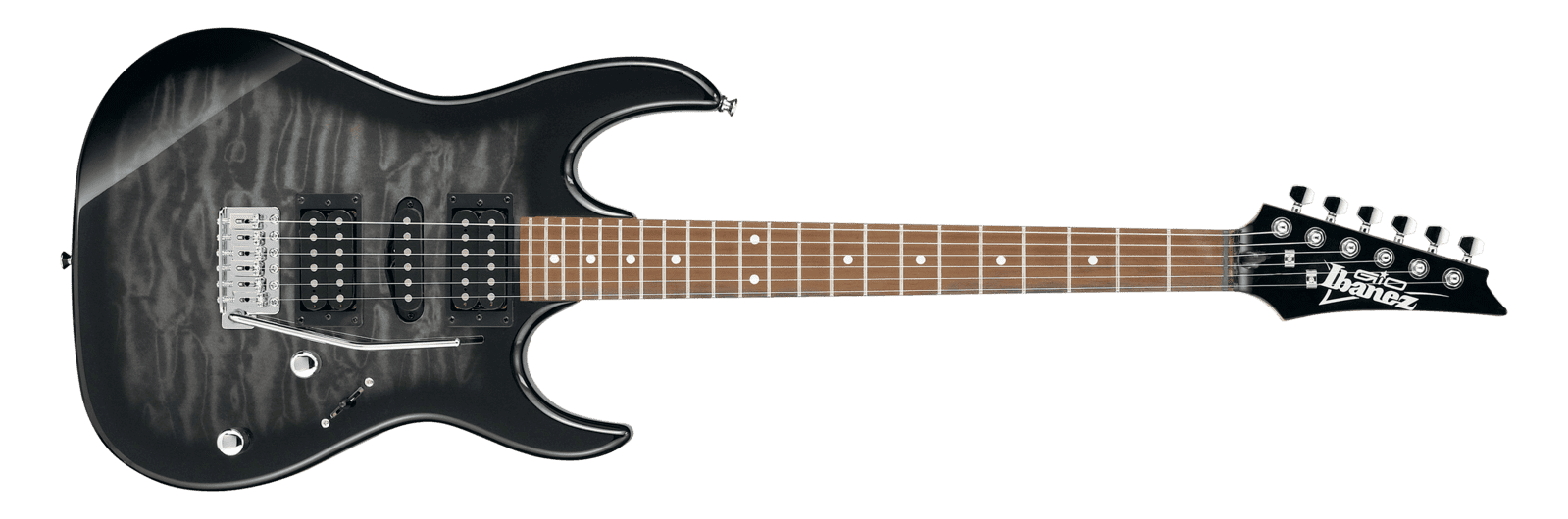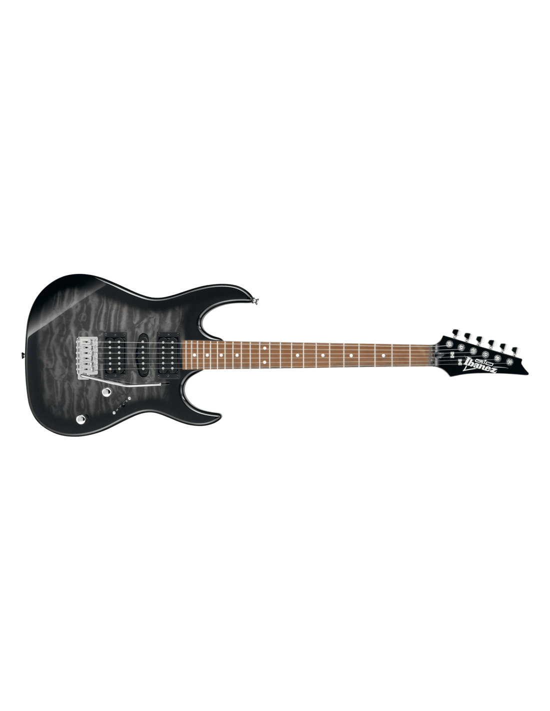 IBANEZ GRX70QA-TKS ist eine E-Gitarre Solid Body der Ibanez Gio-Serie mit einem Korpus aus Pappel, einer Decke aus geflammtem Ahorn, einem GRX-Hals aus Ahorn, einem Purpleheart-Griffbrett mit 22 Medium Jumbo-Stahltasten und weißen Dot-Inlays, einem Kunststoff-Sattel, verchromtem Hardware, gegossenen Mechaniken und einem T106 Tremolo-Bridge mit Hebel. Die HSH-Konfiguration der Elektronik besteht aus 2 passiven/keramischen Ibanez Infinity R Humbuckern am Steg und am Hals sowie einem Ibanez RS Single Coil in der Mitte mit Lautstärke- und Toneinstellungen und einem 5-Wege-Pickup-Wahlschalter.