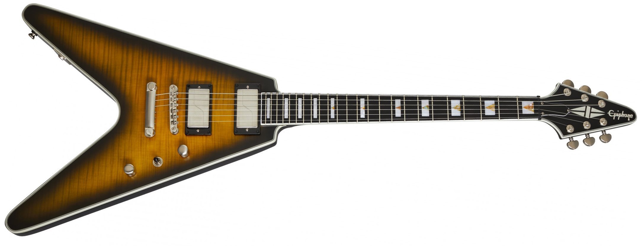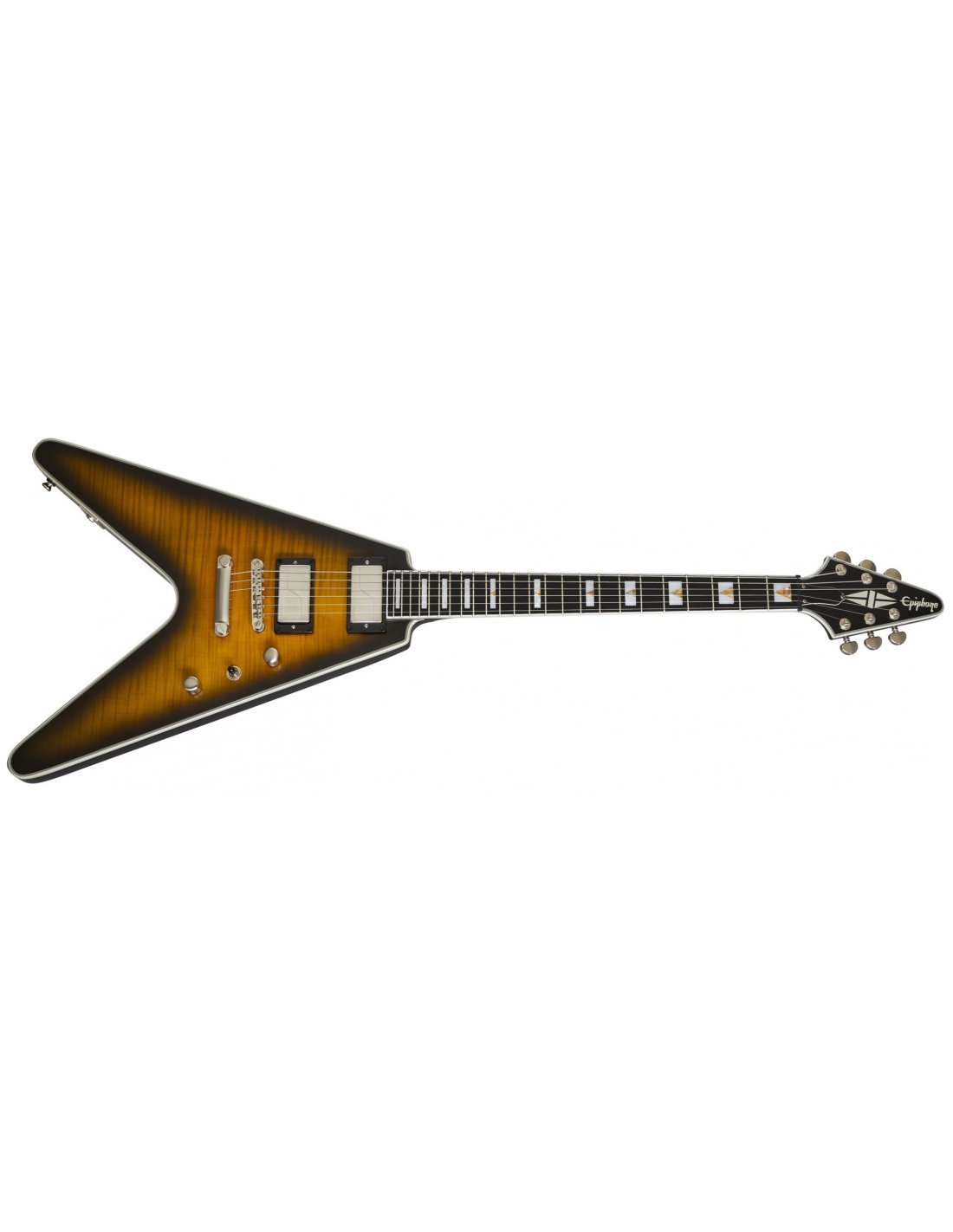 E-Gitarre Epiphone Flying V Prophecy Farbe YELLOW TIGER AGED GLOSS. Die Epiphone Flying V Prophecy ist eine E-Gitarre mit 6 Saiten. Die technischen Merkmale umfassen einen Korpus aus Mahagoni mit einer Decke aus geflammtem Ahorn, einen Mahagonihals mit asymmetrischem SlimTaper-Profil und geformtem Halsfuß, ein Griffbrett aus Ebenholz mit 24 Jumbo-Bünden, Fishman Fluence Tonabnehmer, eine Epiphone LockTone Tune-O-Matic-Brücke und -Saitenhalter für mehr Sustain, einen Graph Tech NuBone-Sattel, der den harmonischen Gehalt und die Stimmstabilität erhöht, mehrschichtige Bindungen und Grover locking Rotomatic Mechaniken.