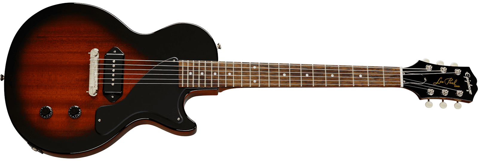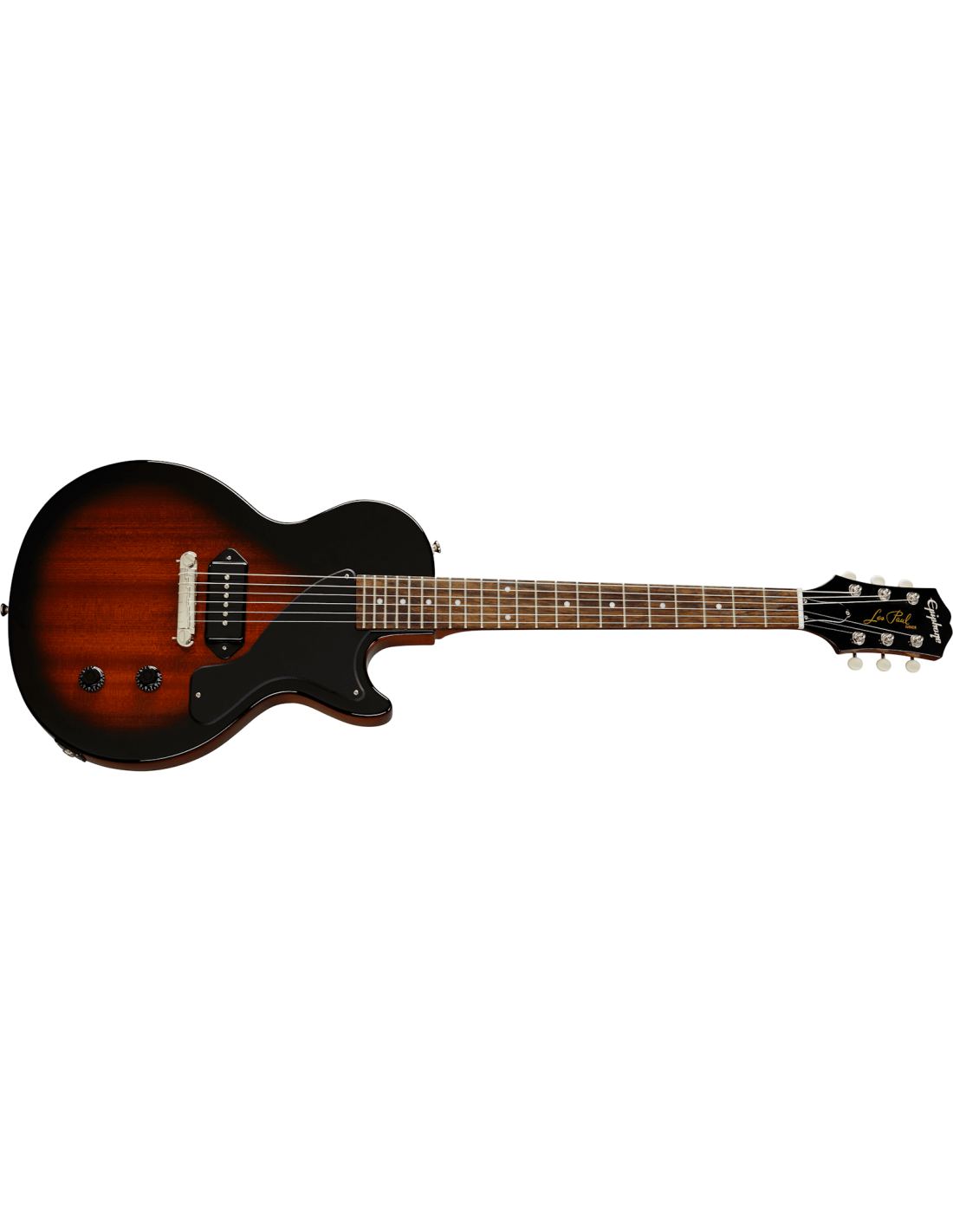 Elektrische Gitarre Epiphone Les Paul Junior in Vintage Tobacco Sunburst. Die Epiphone Les Paul Junior ist eine 6-saitige elektrische Gitarre. Die technischen Merkmale umfassen: Korpus aus Mahagoni, Mahagonihals mit Vintage 50s-Profil. Griffbrett aus indischem Lorbeer mit einem Radius von 12" und 22 Medium Jumbo Bünden. Der Pickup am Steg ist ein P-90 PRO Dogear, mit einem Lautstärke- und Tonregler. Vernickeltes Hardware, mit Lightning Bar WrapAround Steg und Deluxe Vintage Mechaniken.