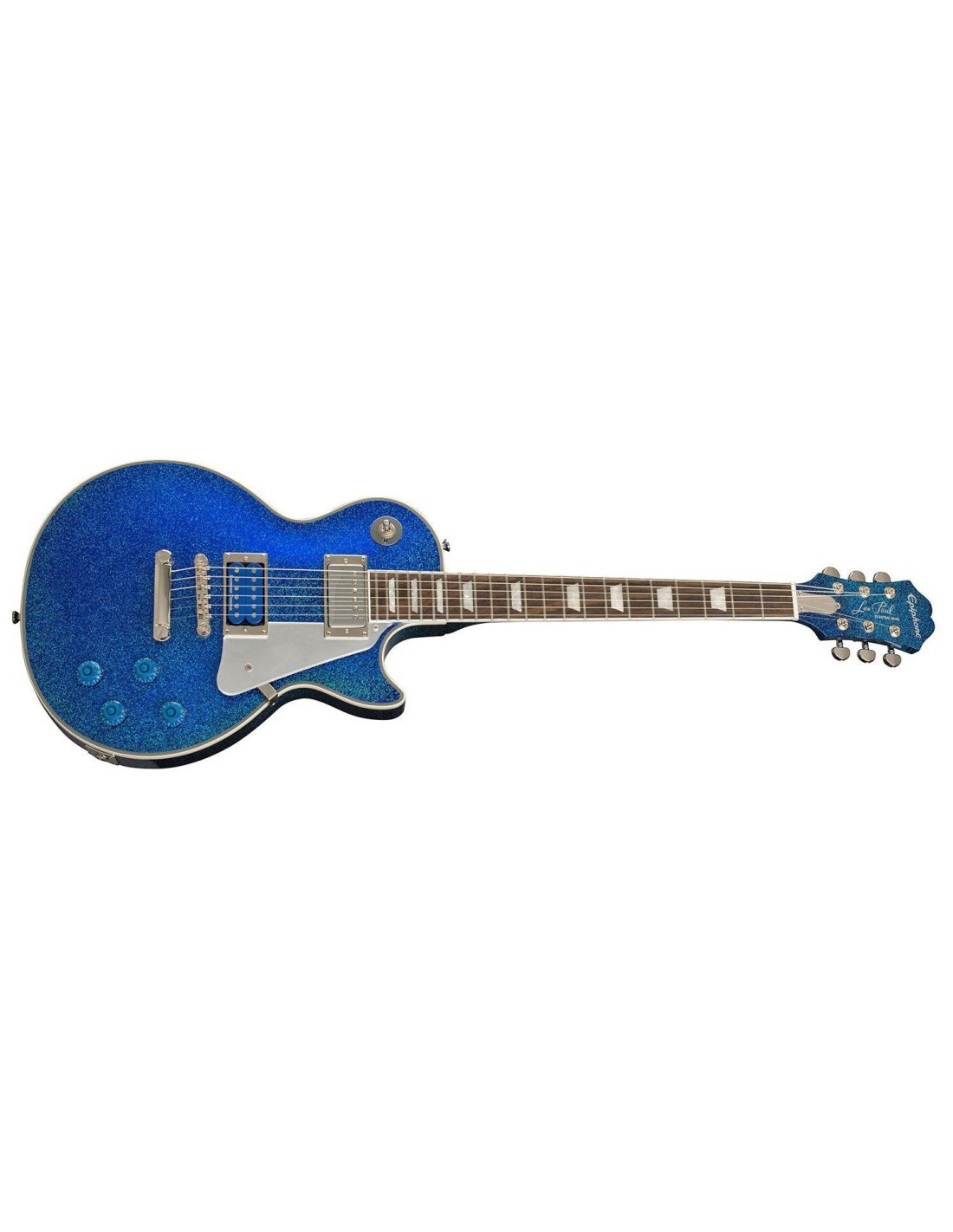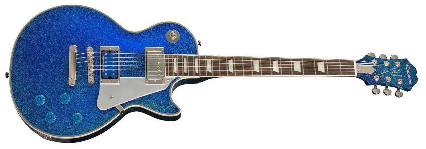 E-Gitarre Epiphone Tommy Thayer Les Paul Farbe ELECTRIC BLUE. Die Epiphone Tommy Thayer Les Paul ist eine E-Gitarre mit 6 Saiten, die in Zusammenarbeit mit dem Gitarristen Tommy Thayers von Kiss entwickelt wurde. Zu den technischen Merkmalen gehören ein Korpus aus Mahagoni mit einer Decke aus Ahorn, ein Mahagonihals mit 60er Slim Taper-Profil, ein Griffbrett aus indischem Lorbeer mit 22 Bünden und trapezförmigen Einlagen, Seymour Duncan SH-4 JB Humbucker-Pickups mit einer Nickelabdeckung am Hals und blauen Spulen am Steg, Epiphone LockTone Tune-O-Matic-Brücke und -Saitenhalter, Grover Rotomatic-Mechaniken und verchromte Hardware.