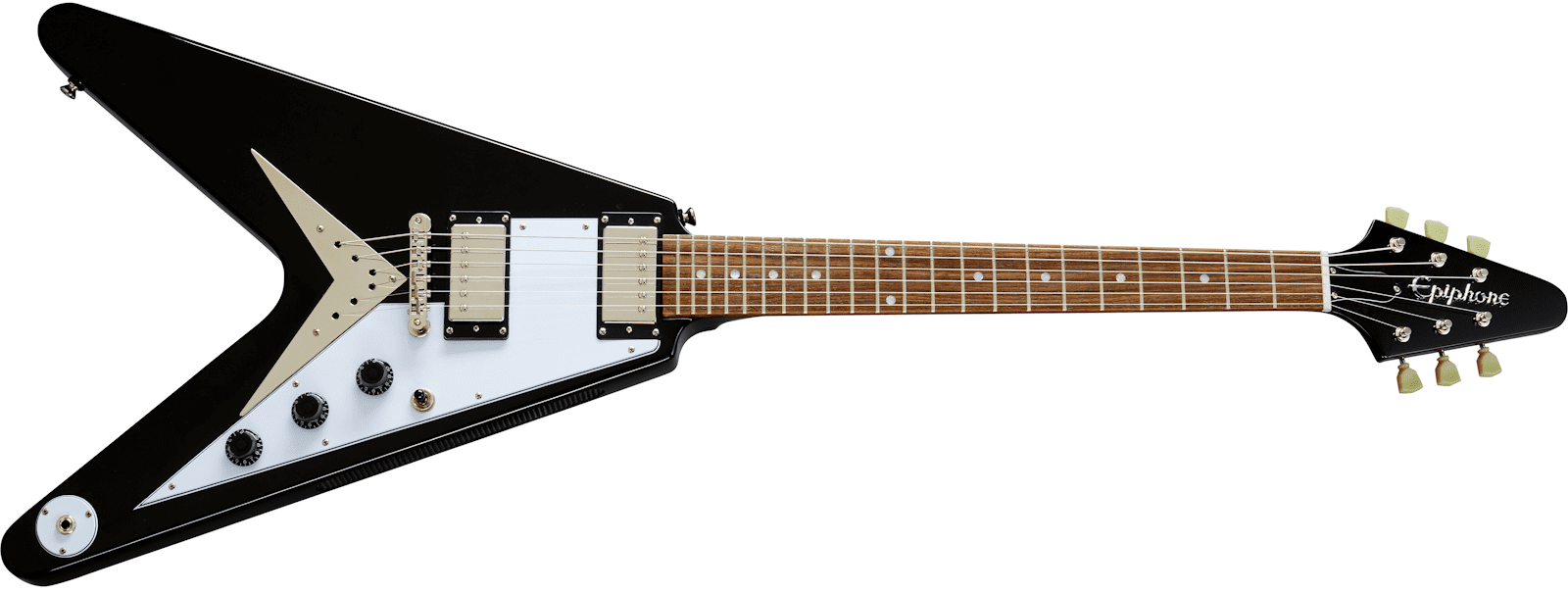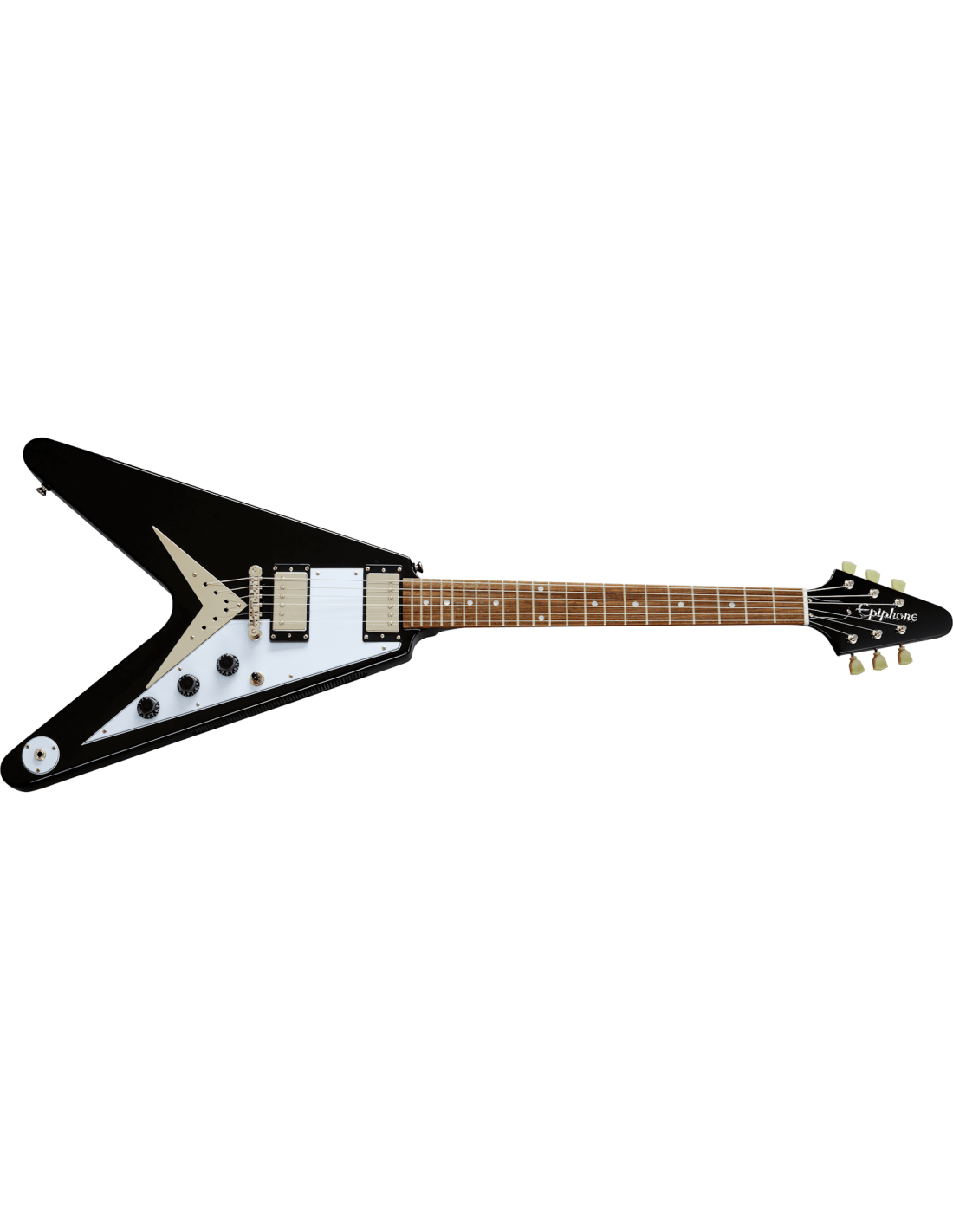 Elektrische Gitarre Epiphone Flying V, Farbe Ebenholz. Die Epiphone Flying V ist eine elektrische Gitarre mit 6 Saiten. Die technischen Merkmale umfassen: Mahagoni-Hals mit SlimTaper C-Profil, Griffbrett aus indischem Lorbeer, Radius 12", 22 Medium Jumbo-Bünde. Korpus aus Mahagoni mit weißem, vierlagigem Schlagbrett. Die Elektronik besteht aus einem ProBucker3 am Steg und einem Probucker2 am Hals. Zwei Lautstärkeregler und ein Master Tone. Vernickeltes Hardware, mit LockTone Tune-O-Matic-Brücke und FlyingV-Saitenhalter. Epiphone Vintage Deluxe Mechaniken.