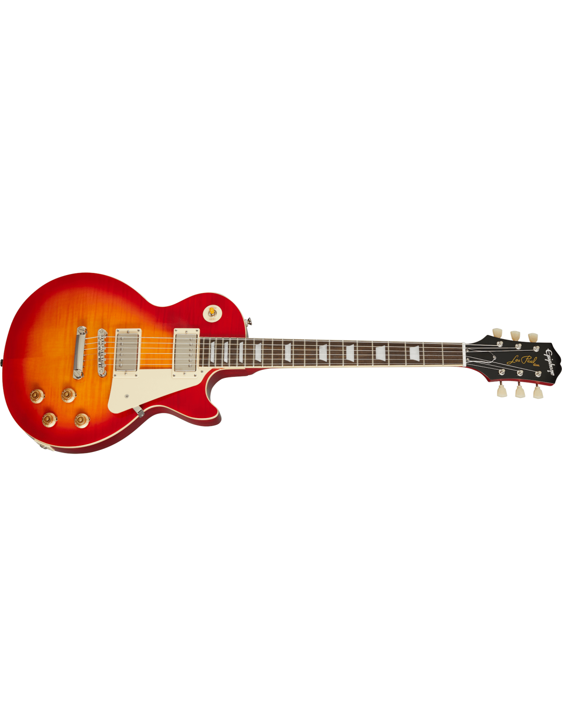 E-Gitarre Epiphone 1959 Les Paul Standard in der Farbe Aged Dark Cherry. Die Epiphone 1959 Les Paul Standard ist eine E-Gitarre mit 6 Saiten. Entwickelt in Zusammenarbeit mit dem Custom Shop von Gibson, verfügt sie über folgende technische Merkmale: Korpus aus Mahagoni mit gewölbter Decke aus AAA-gefülltem Ahorn. Hals aus Mahagoni mit Profil 1959. Griffbrett aus indischem Lorbeer mit Radius 12" und 22 Medium Jumbo Bünden. Gibson BurstBucker 2 am Hals und BurstBucker 3 am Steg. Die Elektronik besteht aus zwei Lautstärkereglern und zwei Toneinstellungen, mit einem 3-Wege-Pickup-Wahlschalter. Vernickeltes Hardware mit ABR-1-Brücke und Stop Bar. Vintage-Mechaniken. Aged-Finish.