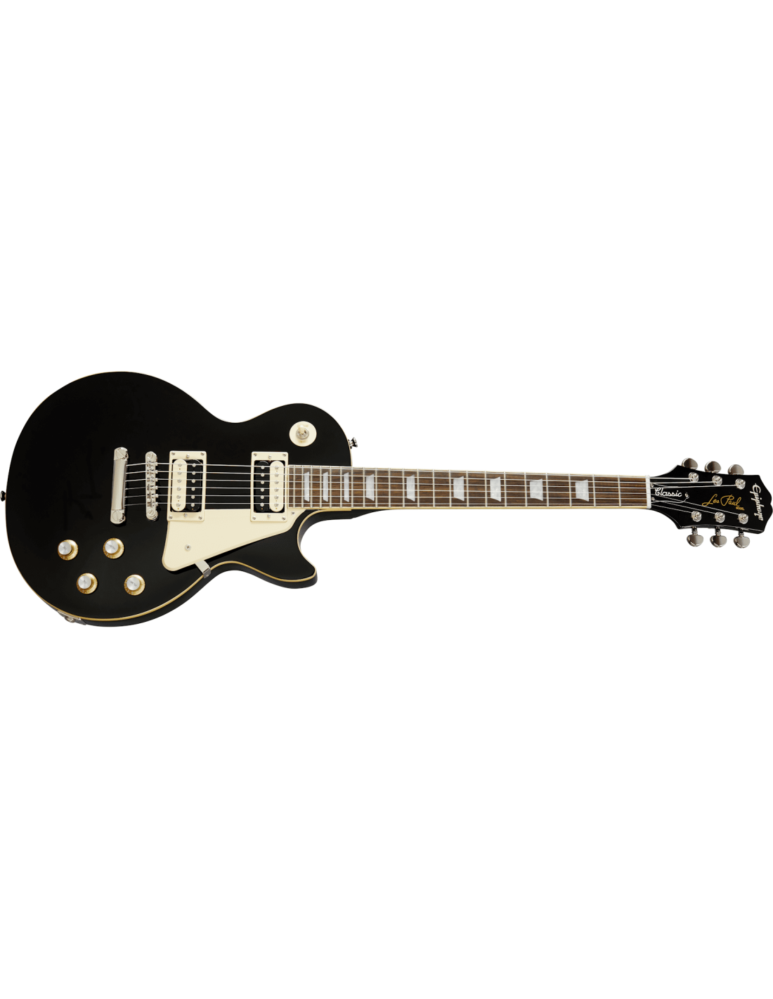 Die EPIPHONE LES PAUL CLASSIC EBONY ist eine E-Gitarre mit 6 Saiten. Die technischen Merkmale umfassen: Mahagoni-Hals. Griffbrett mit einem Radius von 12'', 22 Medium Jumbo Bünde, Sattel 43mm Graph Tech. Die Elektronik besteht aus 2 Alnico Classic PRO Humbuckern, die in Single Coil umschaltbar sind, einem 3-Wege-Schalter, 2 Tone-Reglern und 2 Volume-Reglern, einem Locktone Tune-o-matic Steg, vernickelten Grover Rotomatic Mechaniken.