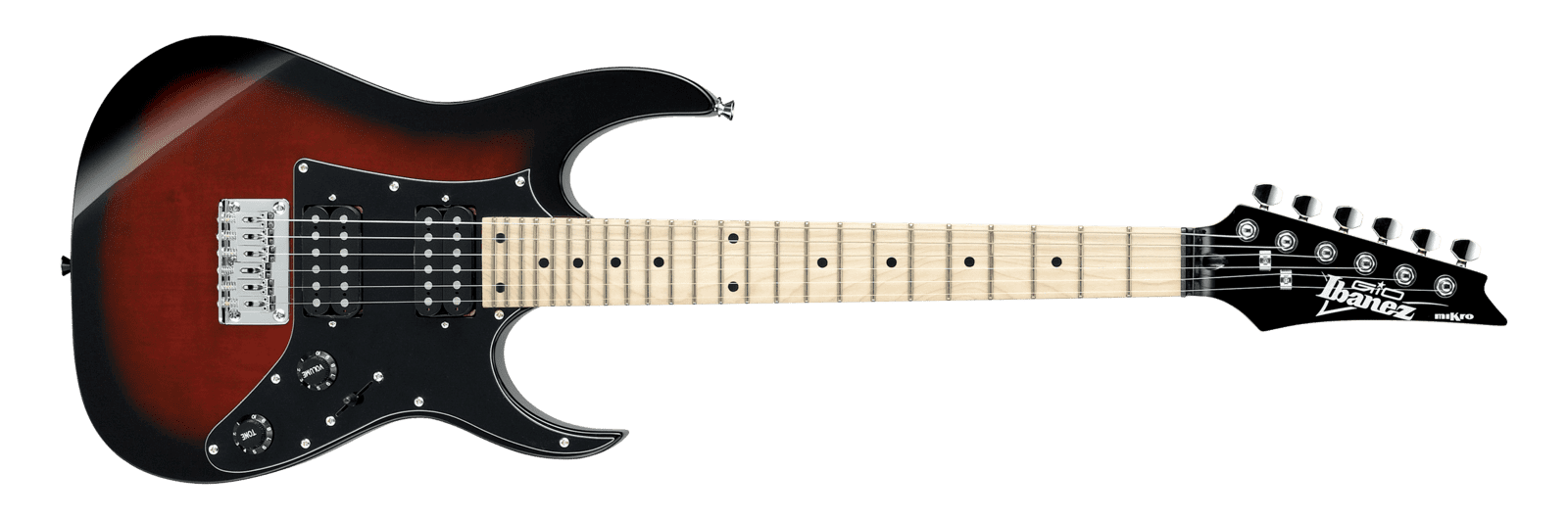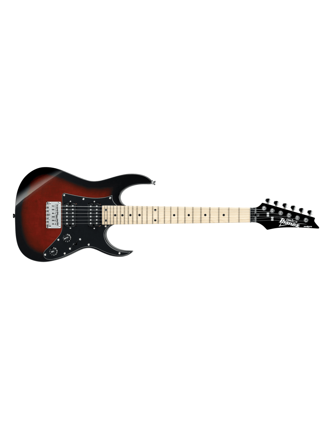 E-Gitarre Ibanez GRGM21-M in der Farbe Walnuss Sunburst. Die Ibanez GRGM21-M ist eine 6-saitige E-Gitarre der GRG Mikro-Serie mit kurzer Mensur (22"). Der Hals ist aus Ahorn, mit einem Ahorn-Griffbrett, 24 Bünden und Medium-Bünden. Der Korpus besteht aus Pappel mit schwarzem Schlagbrett. Die Elektronik besteht aus zwei Ibanez Infinity Humbuckern, einem 5-Wege-Schalter, Lautstärke- und Tone-Reglern. Verchromte Hardware, F106-Brücke.