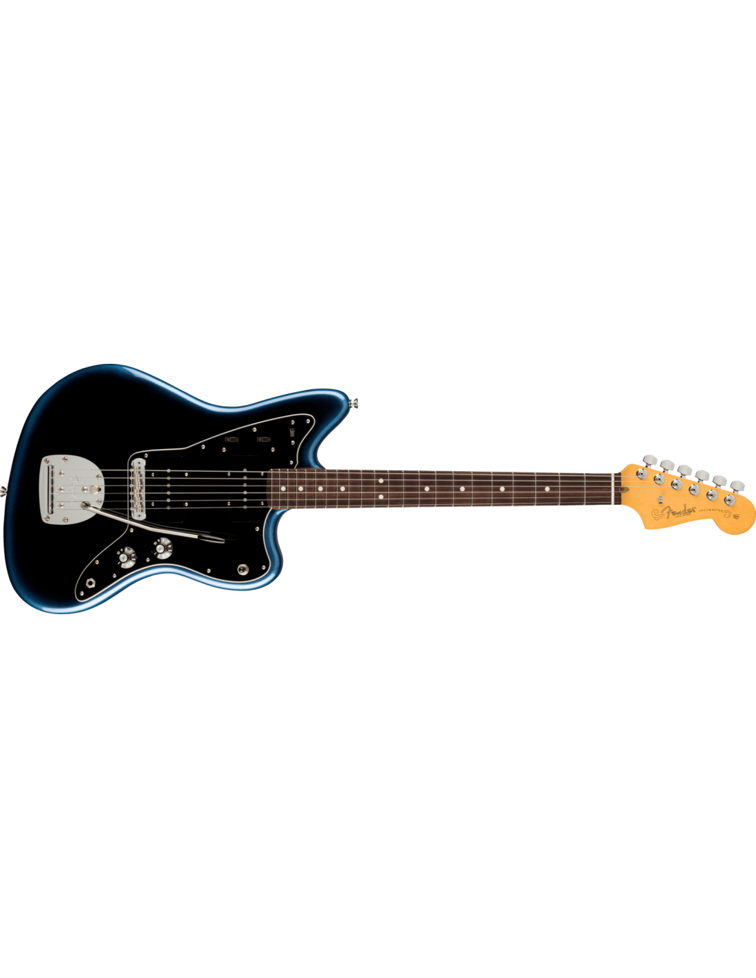 E-Gitarre FenderAmerican Professional II Jazzmaster RW, Farbe Dark Night. Die Fender American Professional II Jazzmaster RW ist eine E-Gitarre mit 6 Saiten. Korpus aus Erle, mit einem neuen, sculptierten Halsfuß für einen besseren Zugang zu den höheren Bünden. Hals aus Ahorn mit "Deep C"-Profil, satiniert mit "Super-Natural"-Finish. Griffbrett aus Palisander, Radius 9,5" mit abgerundeten und geschliffenen Kanten. 22 Bünde mit "narrow-tall"-Profil, schmal und hoch. Neuer Panorama Tremolo-Vibrato-Bridge mit Mustang-Sätteln aus Messing. 2 V-Mod II Jazzmaster Single Coil-Pickups, mit Coil-Tap für den Steg-Pickup und wählbarem Doppelkreis Lead/Rhythm. Inklusive Deluxe-Hartschalenkoffer.