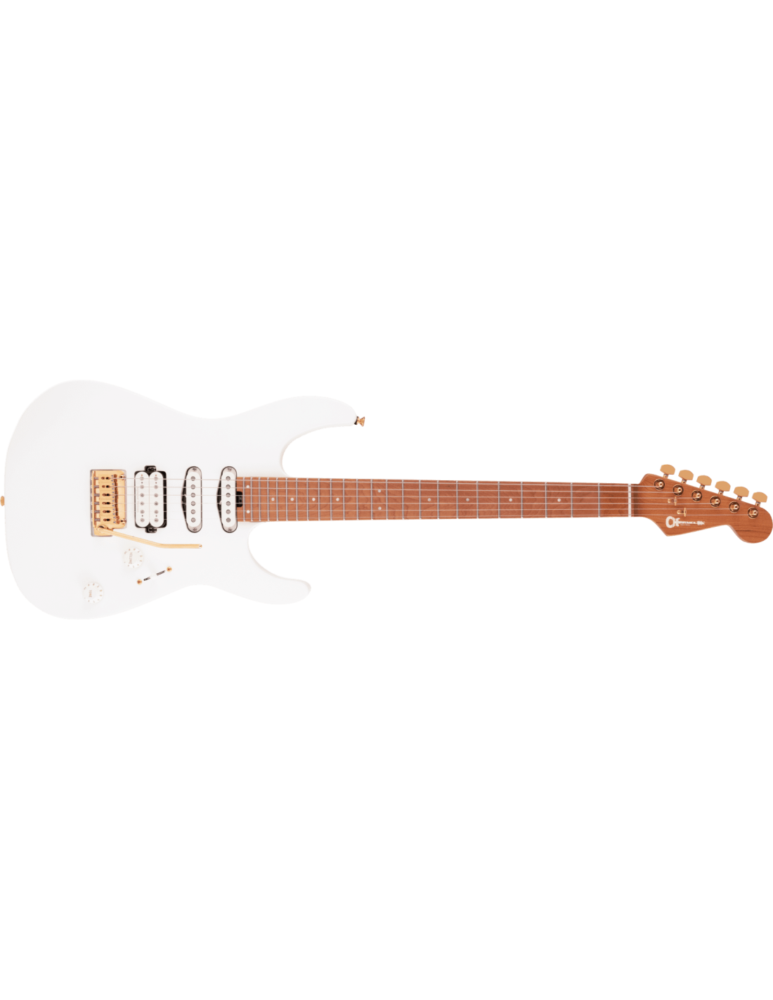 CHARVEL PRO MOD DK24 HSS 2PT CM SNOW WHITE. Die CHARVEL PRO MOD DK24 HSS 2PT CM SNOW WHITE ist eine E-Gitarre mit 6 Saiten. Die technischen Merkmale umfassen: einen bolt-on Hals aus karamellisiertem Ahorn, verstärkt mit Graphit. Griffbrett mit Radius 12"-16'', 24 Jumbo-Bünde, Graph Tech TUSQ XL Sattel und Luminlay Seitenmarkierungen. Dinky-Korpus aus Erle. Die Elektronik besteht aus einem Seymour Duncan Custom Full Shred SH-10B Pickup am Steg, einem Seymour Duncan Custom Full Shred SH-10B Pickup in der Mitte und einem Seymour Duncan Custom Flat Strat SS-6 RWRP Single-Coil Pickup am Hals, mit Volume- und Tone-Reglern sowie einem Alter Switch für insgesamt 5 Kombinationen. Verchromte Hardware mit Gotoh T1802 Vibrato und verchromten, gegossenen Mechaniken mit Charvel-Logo und Locking-Mechaniken.
