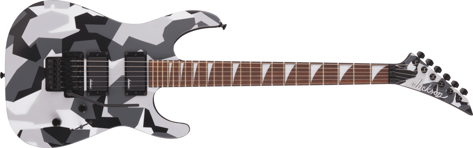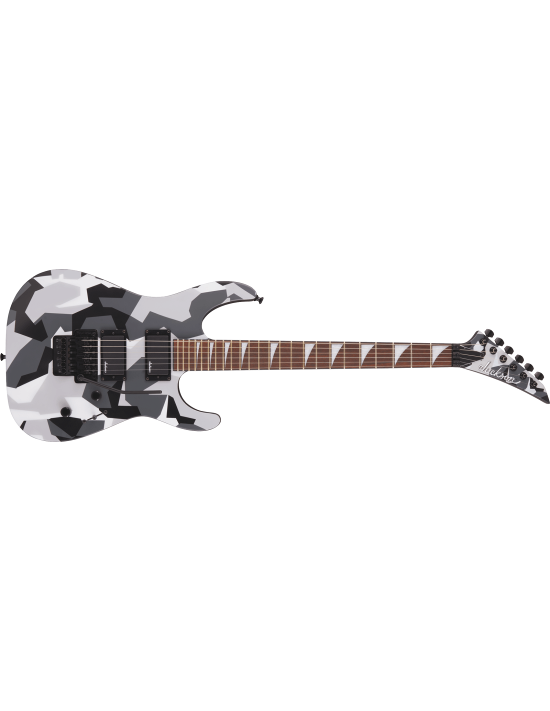Chitarra Elettrica Jackson SL DX colore Tiger Jungle. La Jackson SL DX è una chitarra elettrica a 6 corde. Costruzione Neck Through Body, con manico e sezione centrale del corpo in Acero. Tastiera in Laurel, 24 tasti Jumbo e Compound Radius 12"-16". Il corpo in stile Soloist è in Pioppo. L'elettronica consiste in 2 pickup Jackson High Output Humbucker, gestiti dai controlli di Volume e Tono e da un selettore a 3 posizioni. L'hardware nero comprende il ponte vibrato Floyd Rose Special.