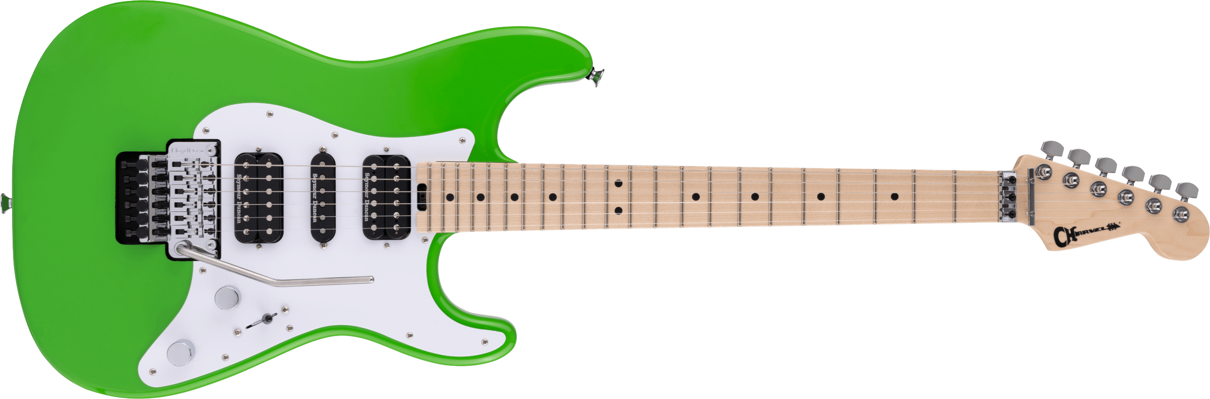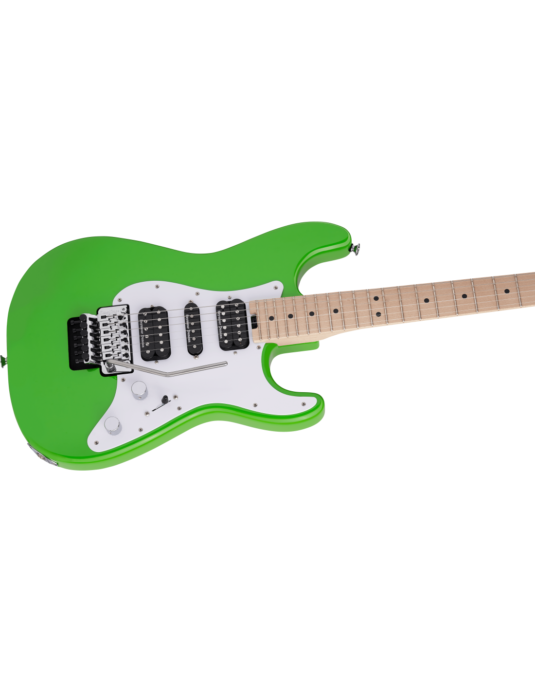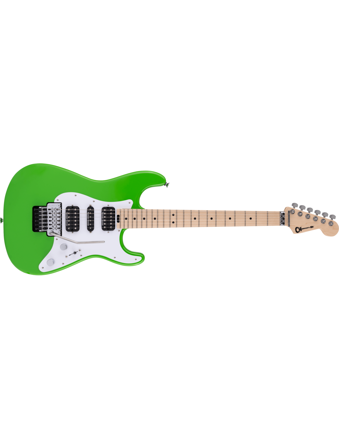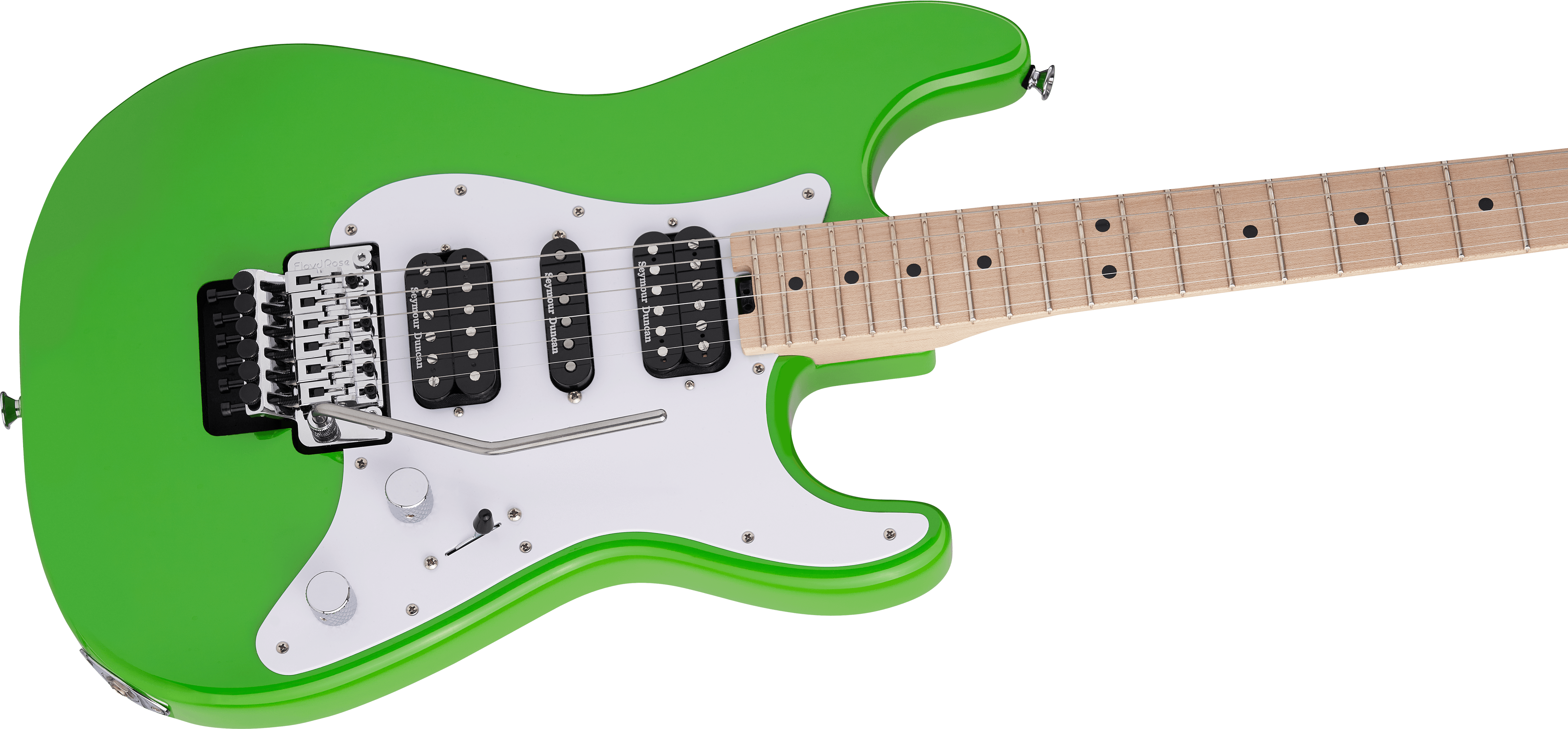 CHARVEL PRO MOD SO CAL STYLE 3 HSH FR SLIME GREEN ist eine E-Gitarre mit solidem Korpus, Modell Pro-Mod So-Cal Style 1 HSH FR M, mit einem Korpus aus Erle (Alder) in Hochglanz, einem Ahornhals mit Speed Neck-Profil und abgerundeten Kanten, einem Ahorngriffbrett mit Compound-Radius von 12" / 16" und 22 Jumbo-Bünden, Black Dot Einlagen und schwarzen Seitenmarkierungen, Dual Action Truss Rod Wheel, Floyd Rose 1000 Series Locking Sattel, Fender Stratocaster lizenziertes Kopfstück, verchromte Hardware, Charvel-Drehmechaniken mit Floyd Rose Retainer Bar und Floyd Rose 1000 Series Double-Locking Tremolo. Die Elektronik in HSH-Konfiguration besteht aus 1 Seymour Duncan Distortion TB-6 Humbucker am Steg, 1 Seymour Duncan Custom Flat Strat SSL-6 Single Coil in der Mitte und 1 Seymour Duncan Distortion SH-6N Humbucker am Hals, mit Master Volume-Regler, Master Tone "No Load"-Regler und einem 5-Wege-Pickup-Wahlschalter.