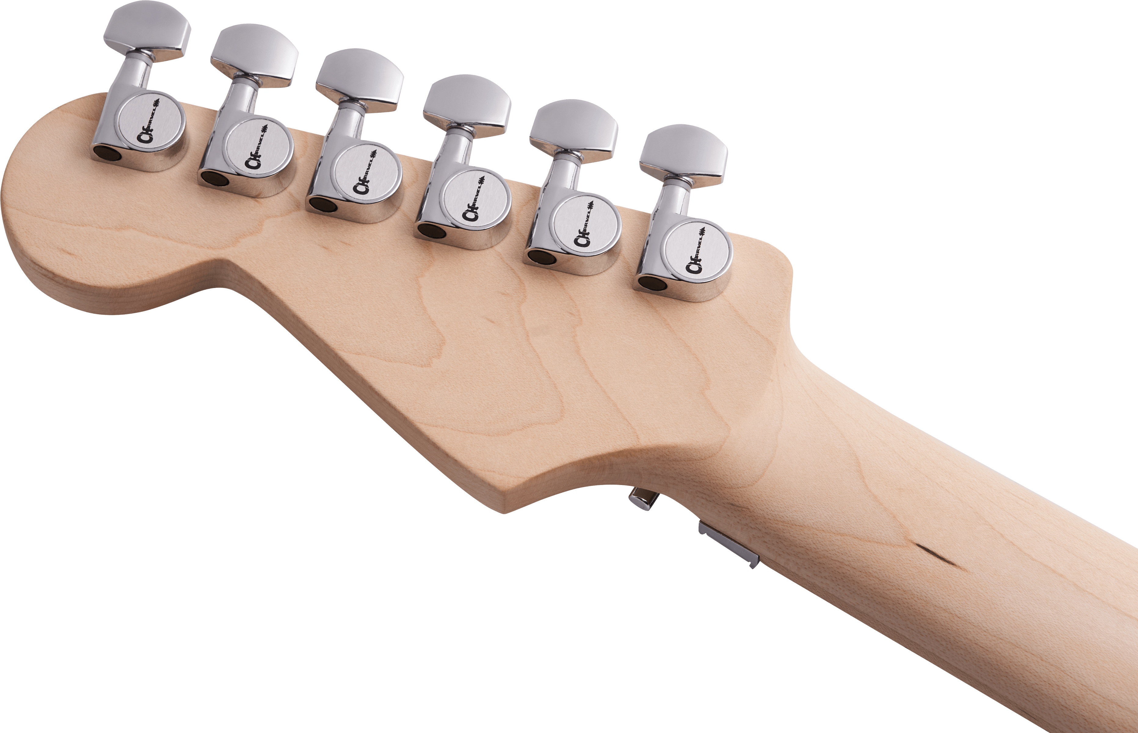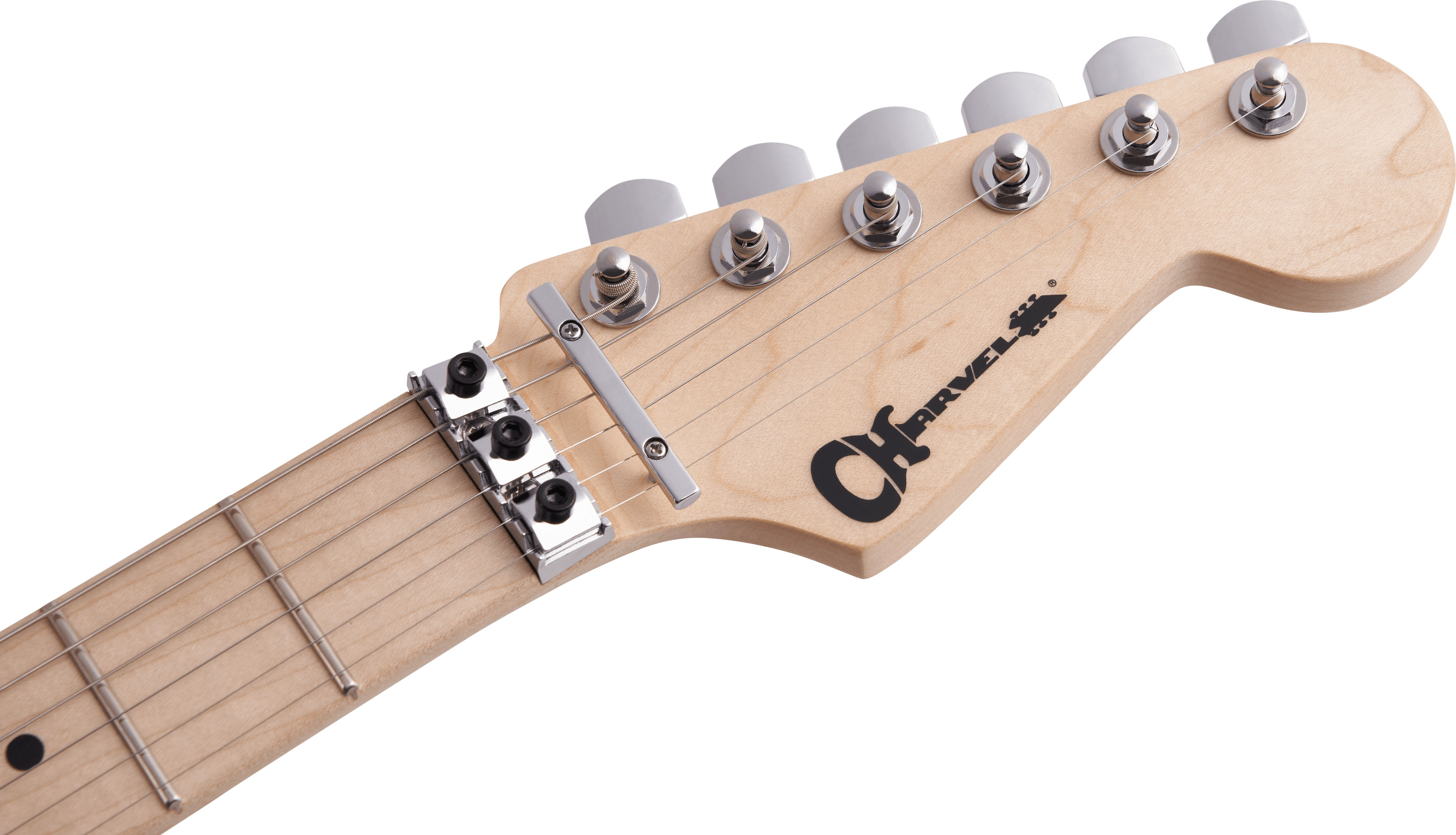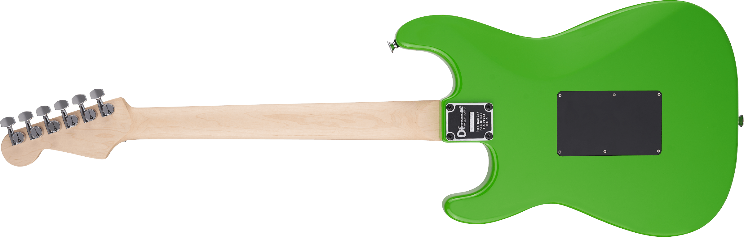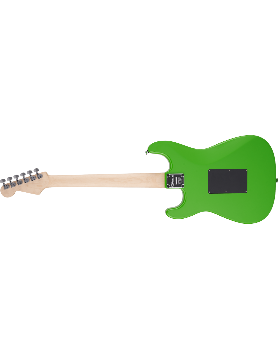 CHARVEL PRO MOD SO CAL STYLE 3 HSH FR SLIME GREEN ist eine E-Gitarre mit solidem Korpus, Modell Pro-Mod So-Cal Style 1 HSH FR M, mit einem Korpus aus Erle (Alder) in Hochglanz, einem Ahornhals mit Speed Neck-Profil und abgerundeten Kanten, einem Ahorngriffbrett mit Compound-Radius von 12" / 16" und 22 Jumbo-Bünden, Black Dot Einlagen und schwarzen Seitenmarkierungen, Dual Action Truss Rod Wheel, Floyd Rose 1000 Series Locking Sattel, Fender Stratocaster lizenziertes Kopfstück, verchromte Hardware, Charvel-Drehmechaniken mit Floyd Rose Retainer Bar und Floyd Rose 1000 Series Double-Locking Tremolo. Die Elektronik in HSH-Konfiguration besteht aus 1 Seymour Duncan Distortion TB-6 Humbucker am Steg, 1 Seymour Duncan Custom Flat Strat SSL-6 Single Coil in der Mitte und 1 Seymour Duncan Distortion SH-6N Humbucker am Hals, mit Master Volume-Regler, Master Tone "No Load"-Regler und einem 5-Wege-Pickup-Wahlschalter.