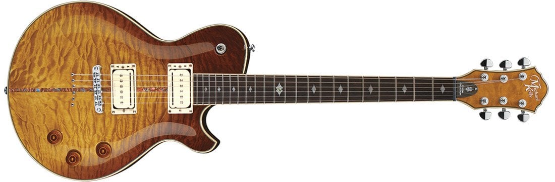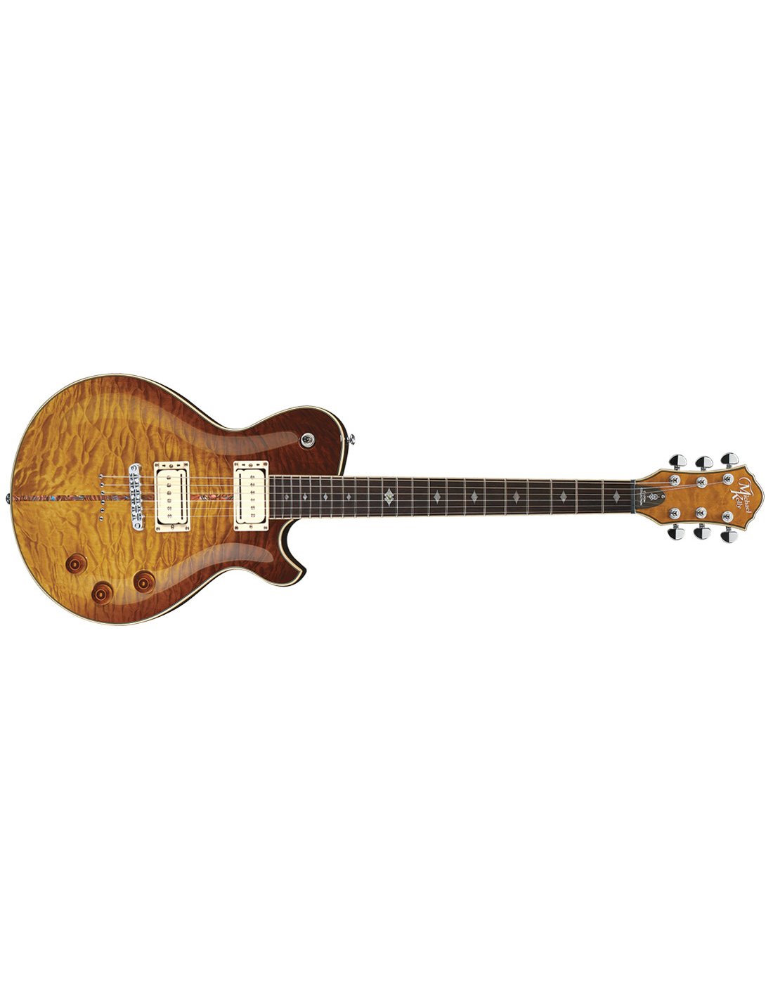 Korpus aus Mahagoni - Decke aus geflammtem Ahorn - Binding creme - Hals verleimt aus Mahagoni - Griffbrett aus Pau Ferro mit Radius 12'' - Mensur 24,75'' - 22 Medium Jumbo Bünde - Pickup Seymour Duncan P-Rails - Mechaniken Grover - verchromte Hardware - Saiten D'Addario EXL120 (.009-.042)