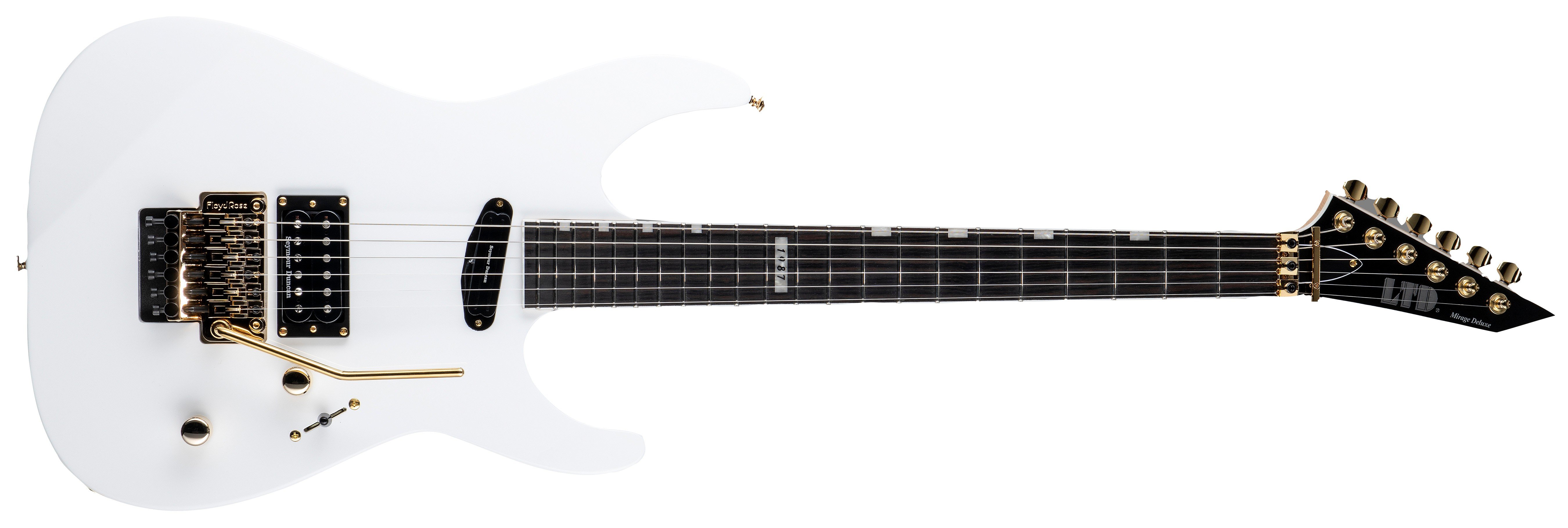 Bolt-on Konstruktion - Maßstab 25,5” - Korpus aus Erle - 3-teiliges Ahorn-Hals mit „Extra Thin U“-Profil - Macassar-Ebenholz-Griffbrett mit 22 Extra Jumbo - Radius 14” - 43 mm Locking Sattel - Goldene Hardware - Floyd Rose 1000 Tremolo - LTD Mechaniken - Seymour Duncan Distortion/Hot Rail Pickup - D'Addario XL120 Saiten (.009/.011/.016/.024/.032/.042)