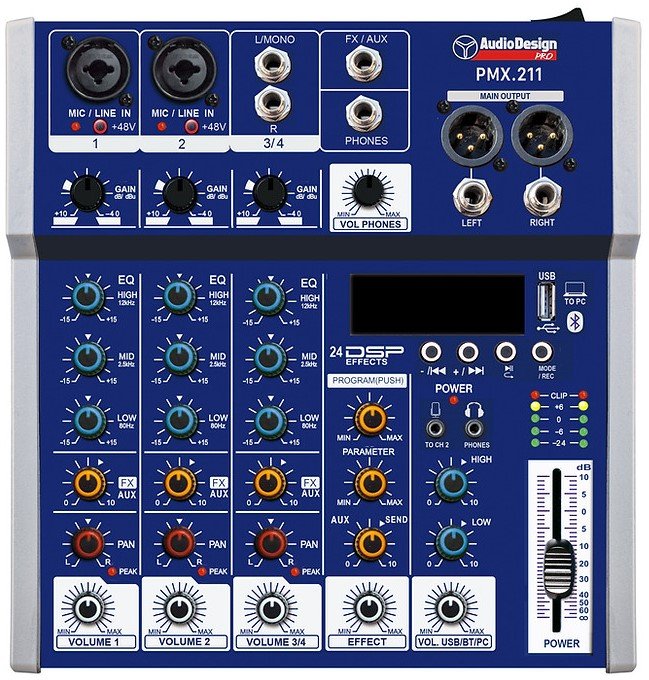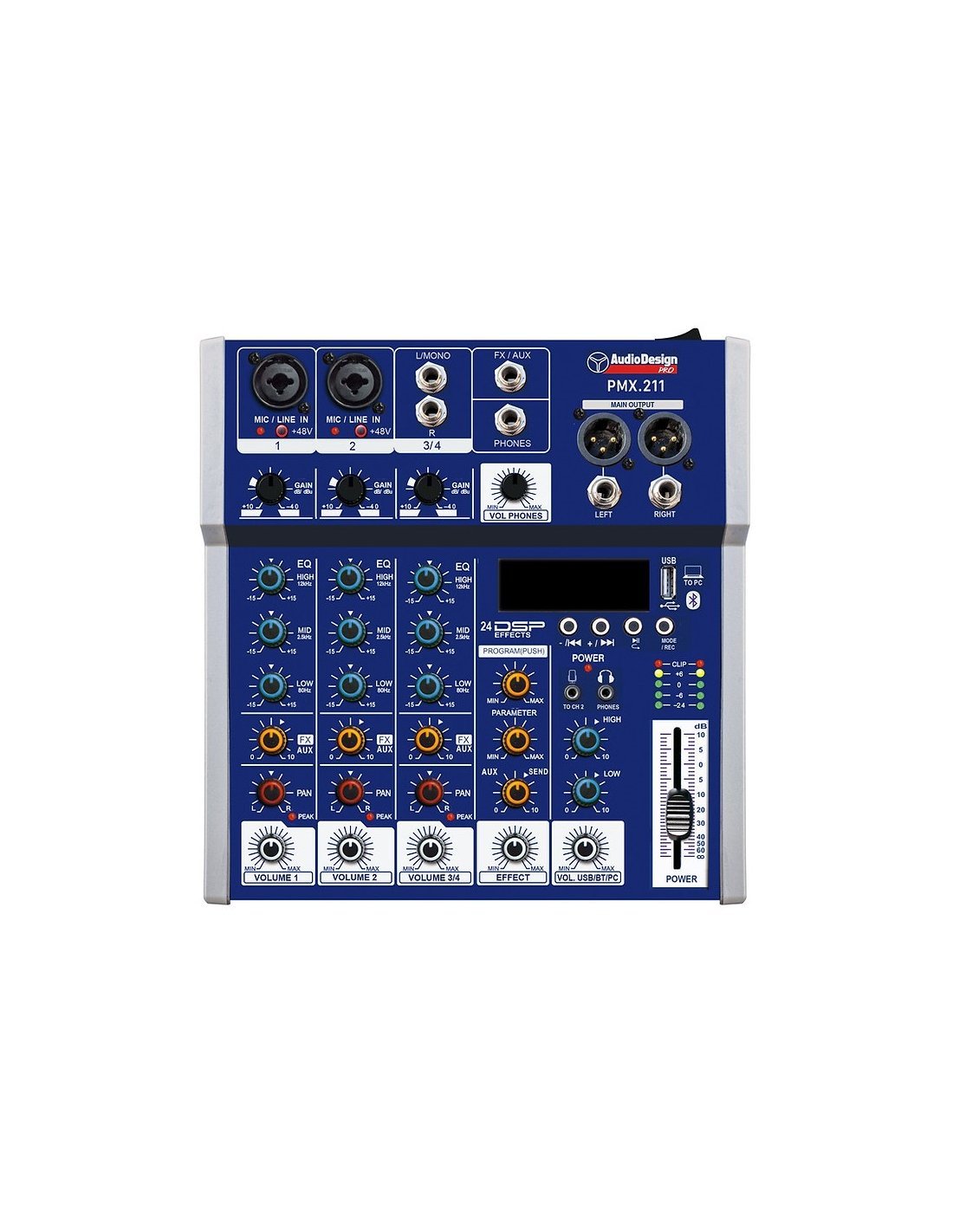 AUDIODESIGN PMX 211 ist ein analoger Mixer mit 2 Mono-Kanälen und 1 Stereo-Kanal, mit USB/BT-Implementierung mit Class-compliant USB für Plug-and-Play-Unterstützung auf Mac, PC, Smartphone. Die technischen Merkmale umfassen einen integrierten DSP mit 24 Effekten und 4 Arten von Hall, Mono-Kanäle mit Combo-XLR/TRS-Anschlüssen mit Phantomspeisung +48V, 3-Band-EQ auf jedem Kanal Bass/Mid/Treb, Gain-Regelung auf jedem Kanal (+10,-40 dB), FX-Steuerung zur Anpassung des Effektpegels auf jedem Kanal, Stereo-Main-Ausgang (balancierte XLR und unbalancierte Klinke), FX/Aux-Ausgang (unbalancierte Klinke) mit Pegelanpassung, Stereo-Kopfhörerausgang (Stereo-Klinke) mit Pegelanpassung, Mikrofoneingang Klinke 3,5 mm (parallel zu Ch 2)