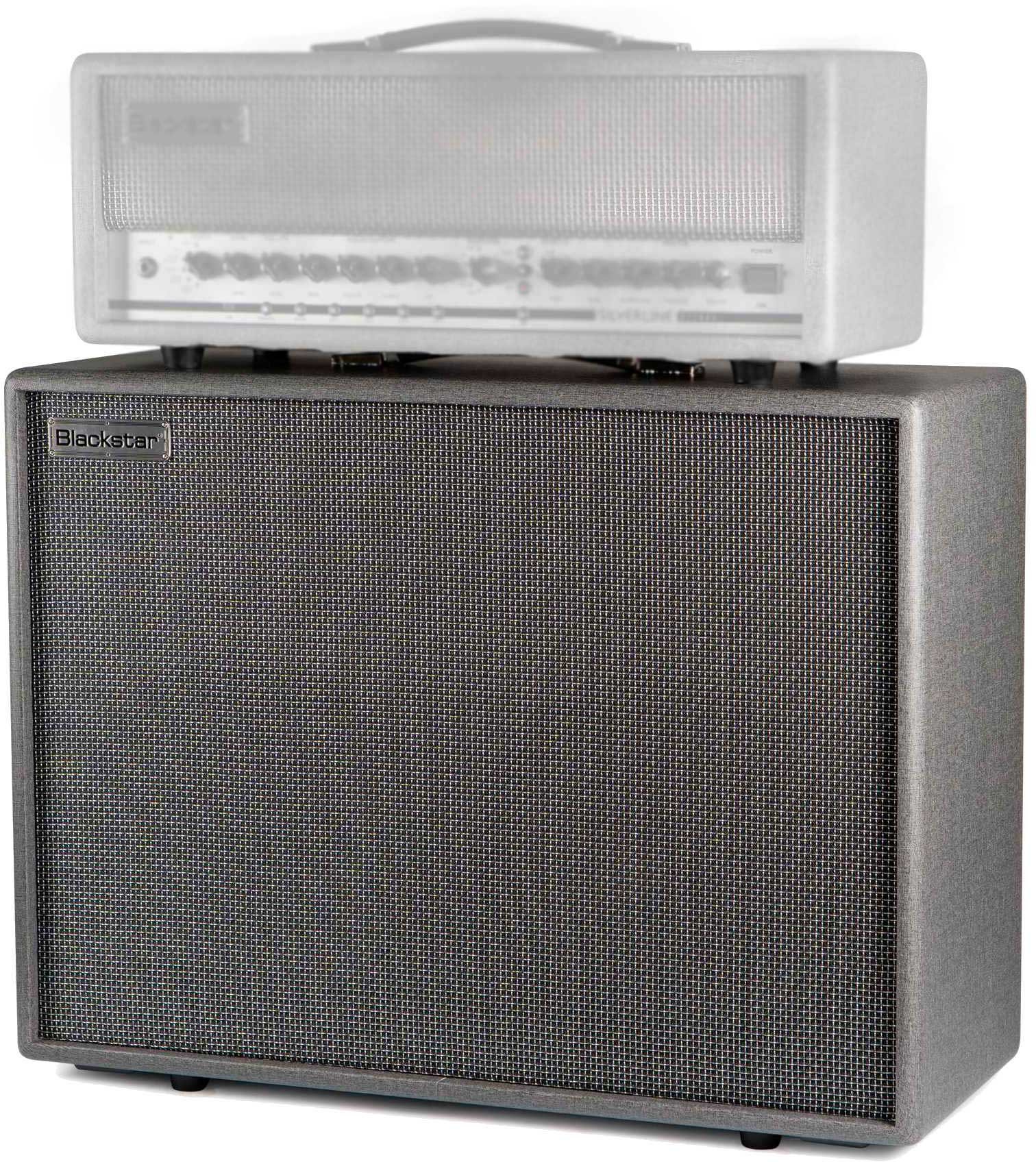 Cabinet für E-Gitarre SILVERLINE 2x12 CABINET. Mit zwei Celestion V Type Lautsprechern mit 12”. Entwickelt, um mit dem BLACKSTAR SILVERLINE DELUXE HEAD oder SILVERLINE STEREO DELUXE kombiniert zu werden. Oberfläche in silbernem Tolex “Boutique Silver” mit metallic Frontlogo.