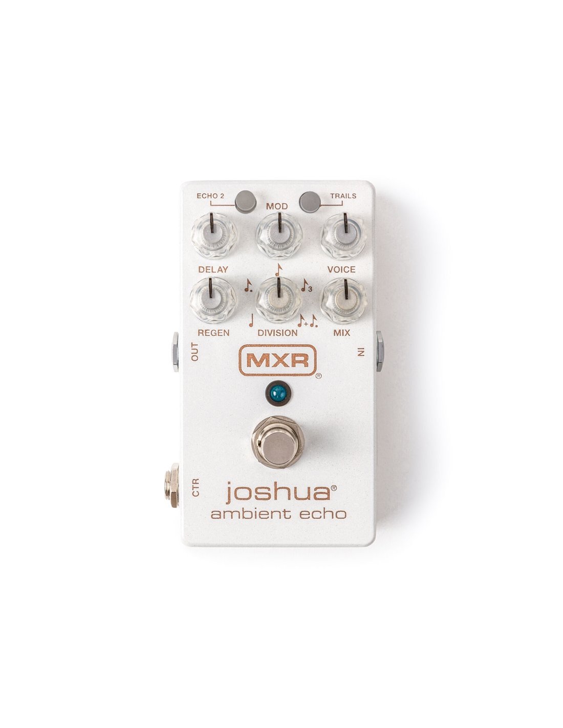 Das MXR Joshua Ambient Echo basiert auf sorgfältig abgestimmten Klängen und Texturen, die sich kombinieren, um die reichen und atmosphärischen Klänge und das große Raumgefühl zu erzeugen, die das Markenzeichen unzähliger klassischer Stücke sind. Das Herzstück dieses Pedals sind die Delay-Einstellungen, die es ermöglichen, nicht nur die Zeit und die Anzahl der Wiederholungen (Steuerungen Delay und Regen) zu regeln, sondern auch deren Rhythmus. Durch Drehen des Division-Reglers kann zwischen 1/4-Noten, punktierten 1/8-Noten, 1/8-Noten, 1/8-Terzen und einem doppelten Delay mit einer 1/8-Note plus einer punktierten 1/8-Note gewählt werden. Durch Drücken der Trails-Taste bleibt das Delay auch nach Deaktivierung des Pedals aktiv. Der Echo 2-Regler fügt hingegen eine Reihe von 1/4-Wiederholungen hinzu, die über die erweiterten Einstellungen angepasst werden können. Um die Delay-Zeit direkt zu steuern, kann ein Tap Tempo oder eine externe Steuerung über den CTR-Jack angeschlossen werden. Über die externe Steuerung kann das Feedback für ein "eingefrorenes" Delay maximiert werden. Die Modulation, die mit dem Mod-Regler einstellbar ist, ermöglicht es, die Texturen des Effekts zu verfeinern, und der Voice-Regler senkt das Signal um eine Oktave und hebt es um eine oder zwei Oktaven an, was Klänge ähnlich einem Orgel erzeugt. Wenn die Grundeinstellungen nicht ausreichen, um den eigenen Sound zu finden, ermöglichen die erweiterten Funktionen die Anpassung von bis zu 12 verschiedenen Parametern, je nachdem, wie die LEDs im Mix des sekundären Delays blinken.