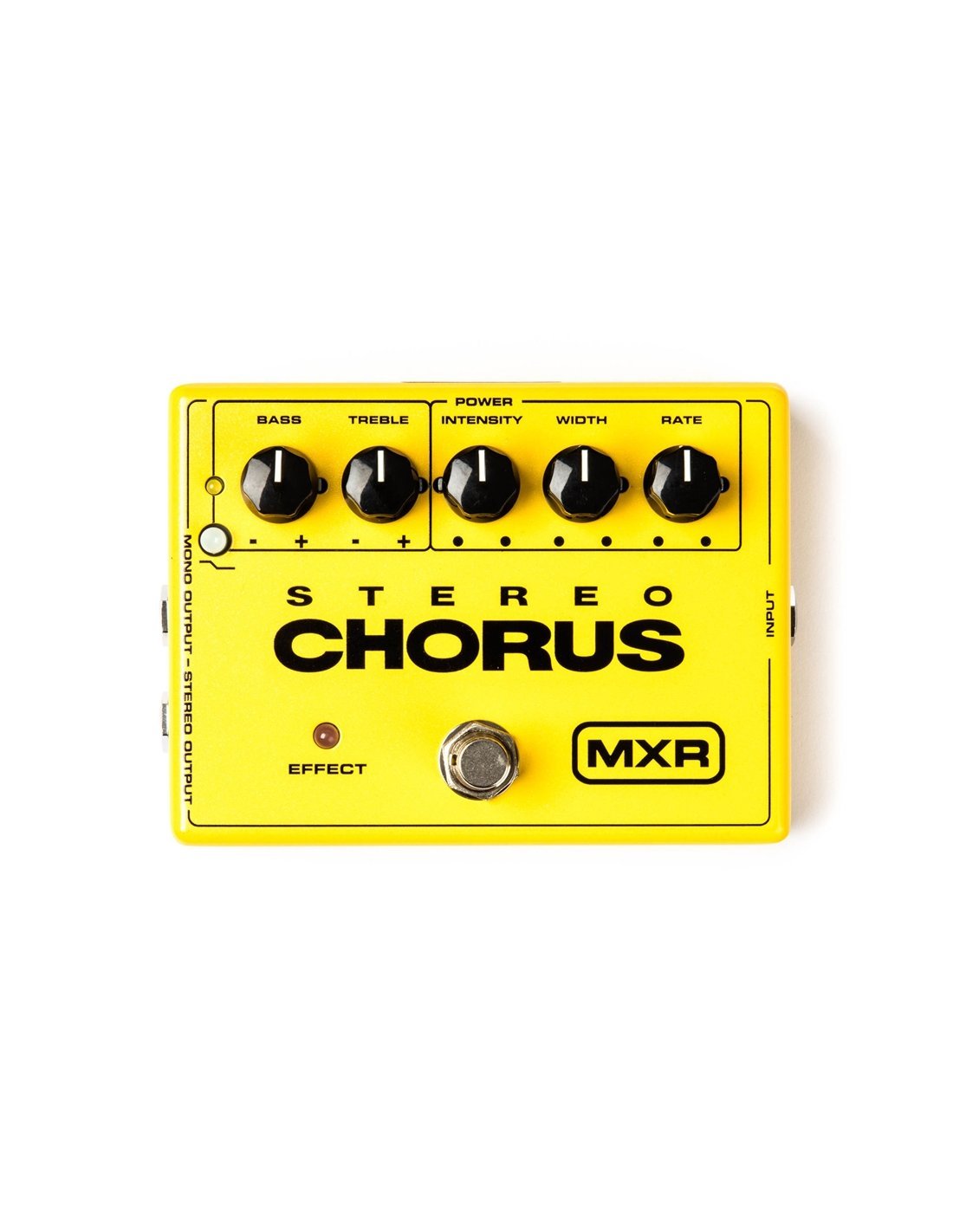 Das Stereo Chorus von MXR hat eine üppige Modulation. Die Regler Rate und Width ermöglichen es, die Geschwindigkeit und die Tiefe des Chorus zu bestimmen, und der Regler Intensity steuert die Intensität des Effekts. Es ist möglich, den Klang weiter zu formen, indem die modulierten Frequenzen mit den Reglern Bass und Treble angepasst werden. Um einen intensiven und lebendigen Klang zu erzielen, können die Mono- oder Stereo-Ausgänge verwendet werden. Um die tiefen Frequenzen des Instruments oder den Klang der Gitarre zu erhalten, hilft das Stereo Chorus mit der Taste Bass Filter, die den Effekt nur auf die hohen Frequenzen anwendet.