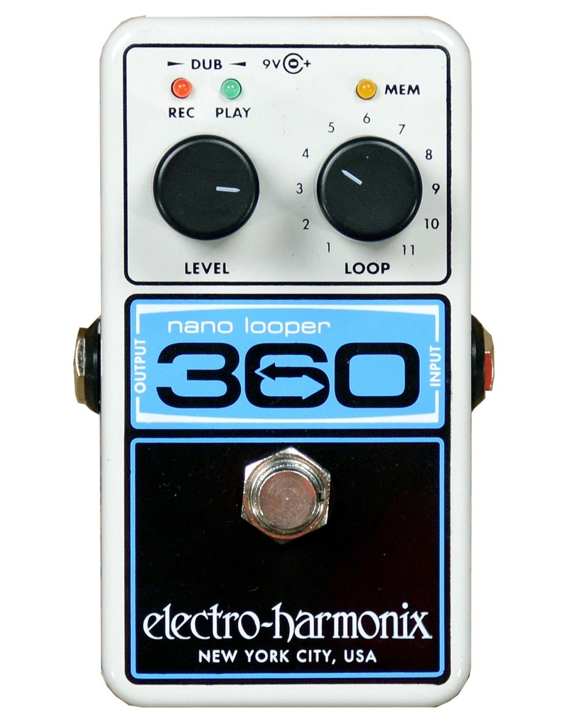 Pedale für Gitarre Electro Harmonix 360L Nano Looper. Der Electro Harmonix 360L Nano Looper ist ein Looper-Pedal für Gitarre, das über 360 Sekunden (6 Minuten) Aufnahmezeit verfügt, die in 11 speicherbare Loops mit unbegrenzten Overdubs und einer Rückgängig/Wiederholen-Funktion unterteilt werden können. Es ist mit den Reglern Level und Loop ausgestattet.