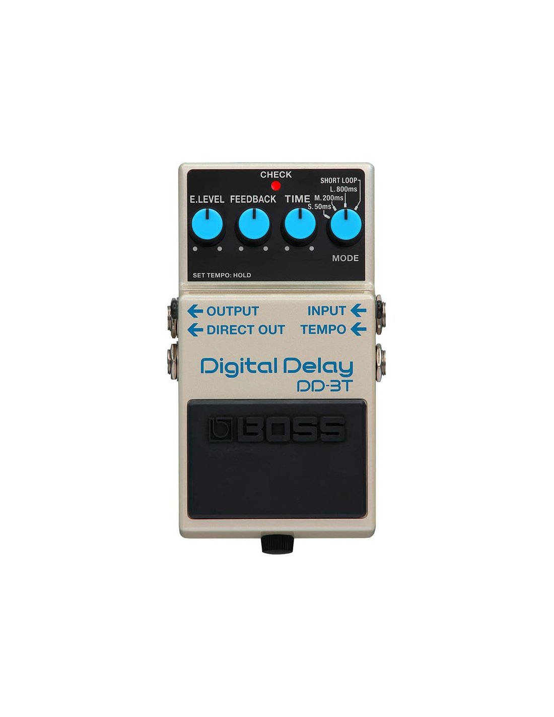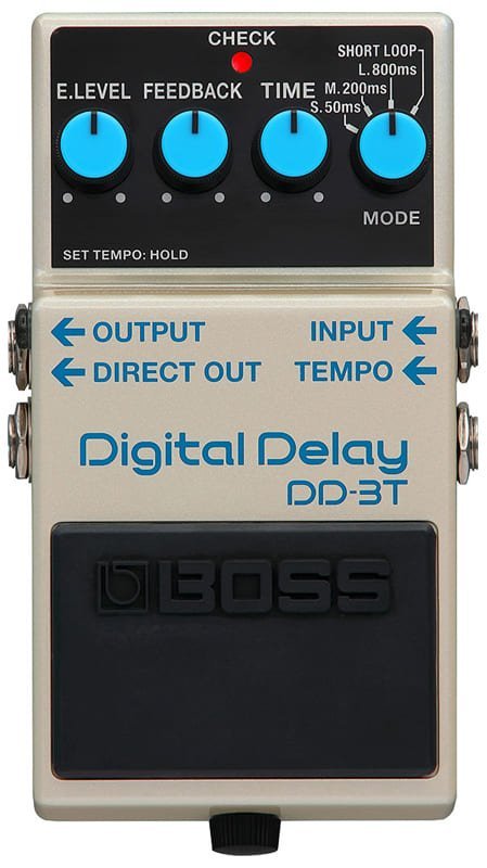 Pedale für Gitarre Boss DD-3T Digital Delay. Das Boss DD-3T Digital Delay ist ein digitales Delay-Pedal für Gitarre. Es verfügt über die Regler E.Level, Feedback, Time, den Drehregler Mode, der die Auswahl von 3 Delay-Modi (50ms, 200ms, 800ms) ermöglicht, die Funktion Short Loop zum Erstellen von Loops und die Funktion Tap Tempo.