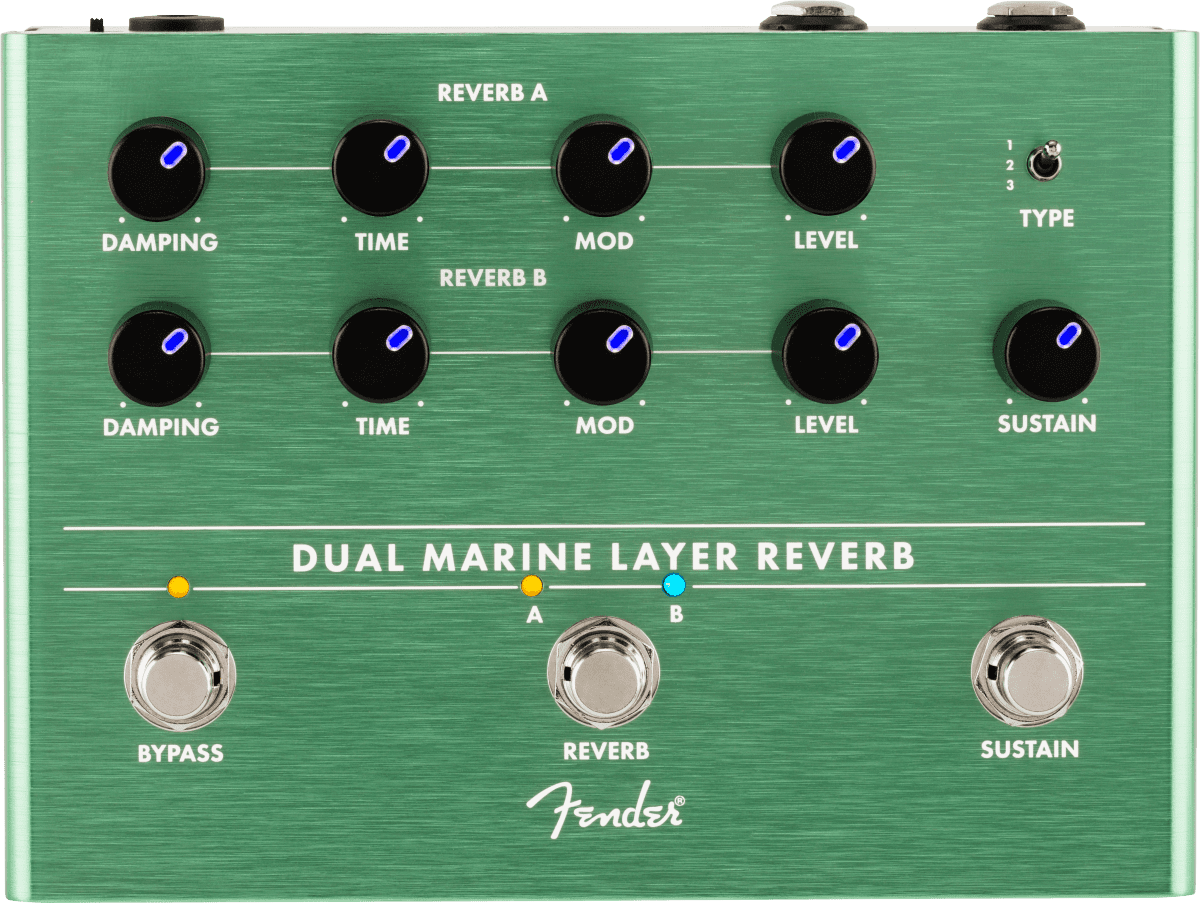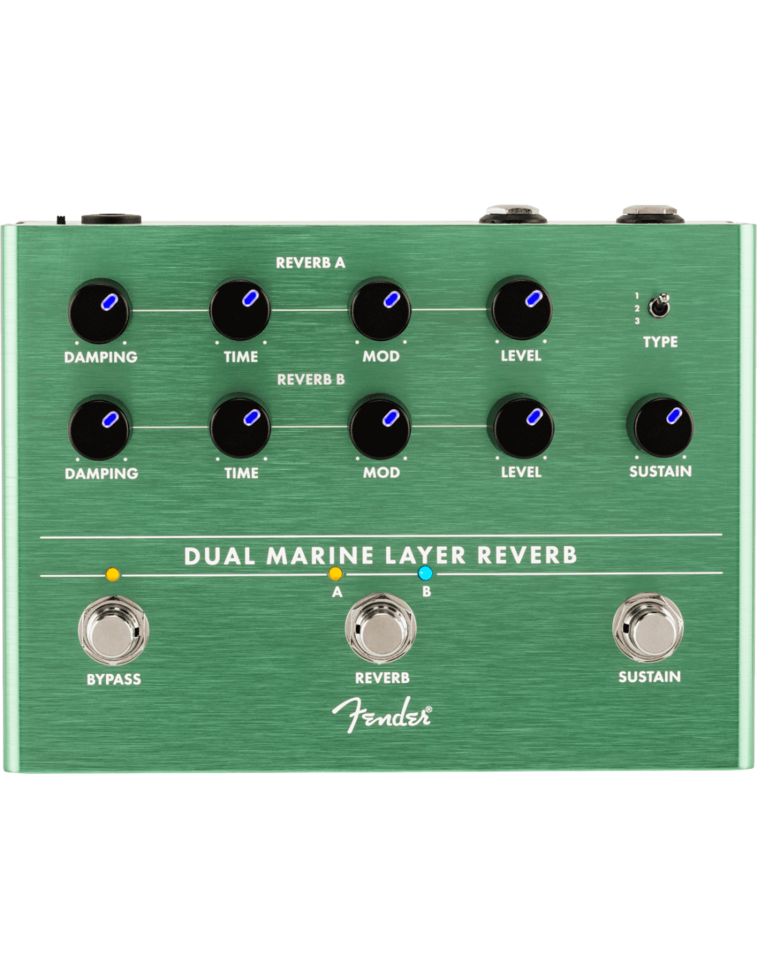 FENDER DUAL MARINE LAYER REVERB ist ein Dual-Reverb-Effektpedal für Gitarre, mit 3 auswählbaren und modellierbaren Reverb-Typen in 2 verschiedenen Bänken. Die technischen Merkmale umfassen 2 auswählbare Reverb-Bänke (A/B) über einen dedizierten Fußschalter, mit hintergrundbeleuchteten Reglern für Damping, Time, Pre-delay und Level auf jeder Bank, Switch Type zur Auswahl von 3 Reverb-Typen, Level-Regler für den Sustain-Effekt mit aktivierendem Fußschalter. Es verfügt über eine Klappe für 9V-Batterien mit Scharnier und magnetischem Verschluss, einen Schalter zur Aktivierung der LED (auf der Rückseite), Eingang und Ausgang über 6,3mm Klinke.