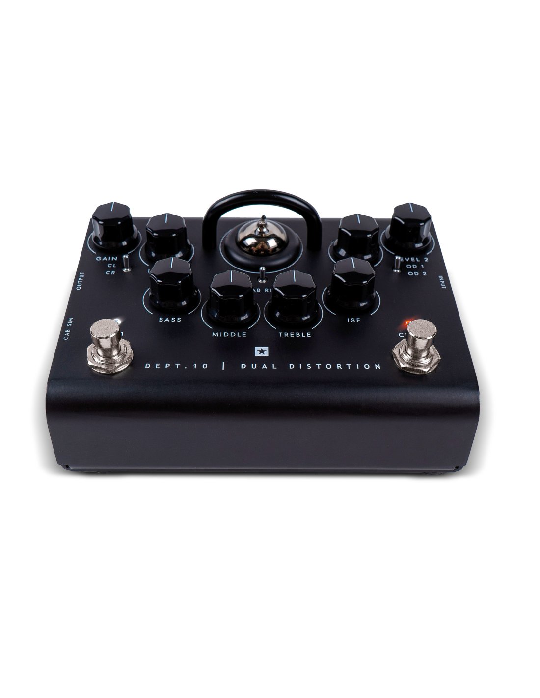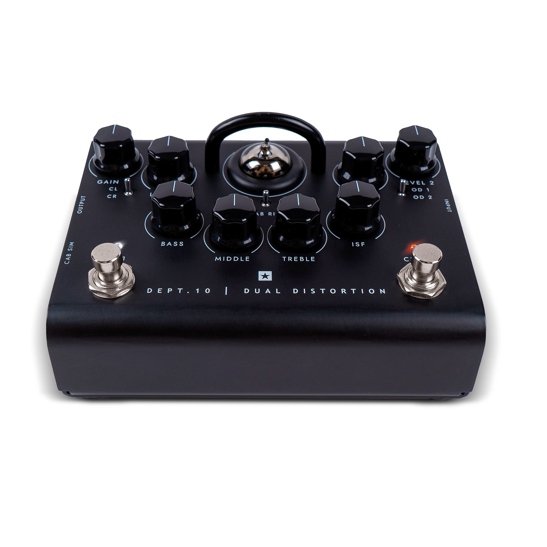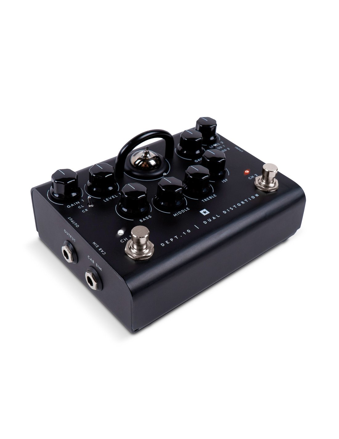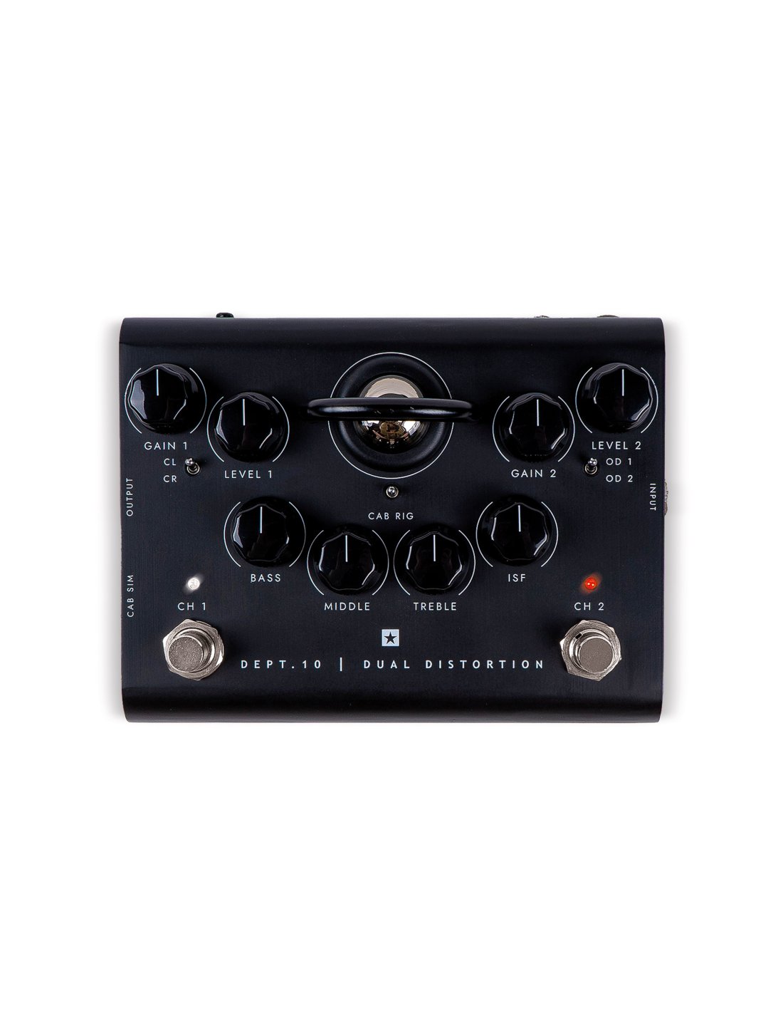 BLACKSTAR DEPT. 10 DUAL DISTORTION ist ein Röhrenverzerrer-Pedal für Gitarre. Die technischen Merkmale umfassen 2 Kanäle mit Clean/Crunch-Schalter am Kanal 1 und Schalter mit 2 Arten von Overdrive am Kanal 2, EQ mit 3 Bändern und patentiertem ISF Tone Stack, ECC83 Triodenröhre, Lautsprecher-Cab-Rig-Simulationstechnologie mit 3 Speicherplätzen, D.I. XLR-Ausgang und USB-Ausgang. Betrieben mit 9V-Batterie (inklusive) oder Netzteil (nicht enthalten)