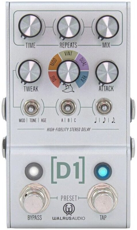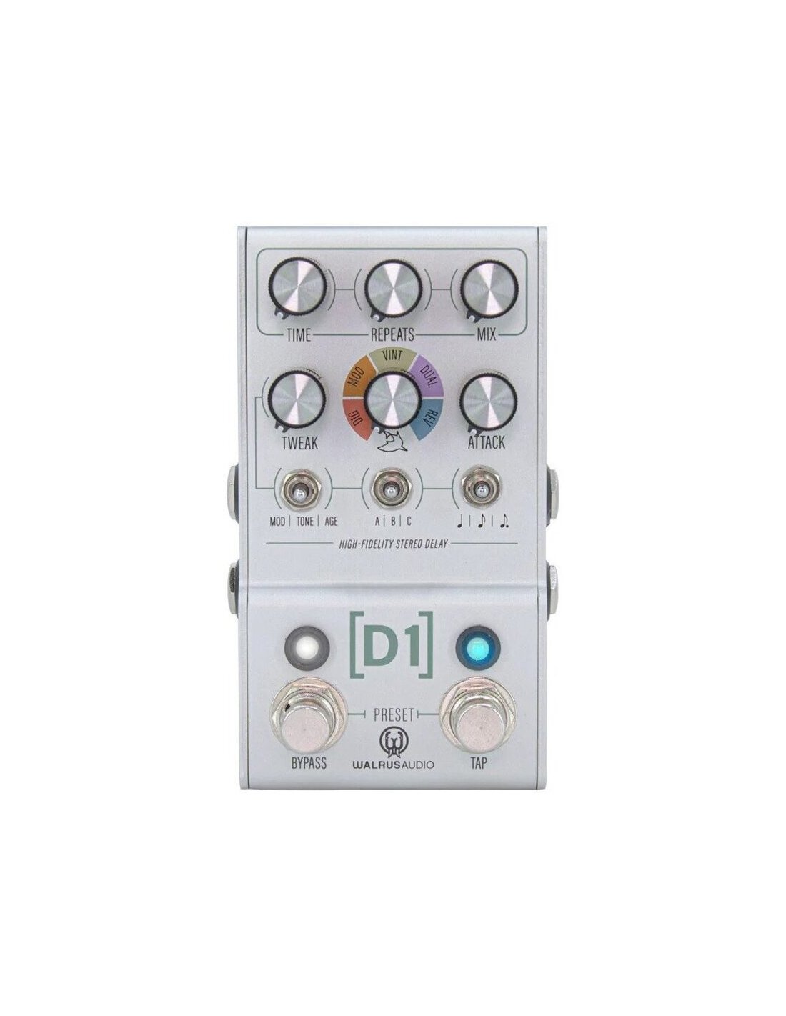WALRUS AUDIO MAKO SERIES D1 V2. Stereo Delay-Pedale für Gitarre. Die technischen Merkmale umfassen die Regler Time, Repeats, Mix zur Modellierung des Effekts und zur Mischung mit dem Dry-Signal, den Prog-Regler zur Auswahl von 5 verschiedenen Delay-Modi: digital, modulation, vintage, dual und reverse. Attack-Regler zur Bestimmung des Angriffs der Effekte, 3-Wege-Tweak-Schalter zur Einstellung von 3 verschiedenen Effekttexturen für jedes Programm mit einem speziellen Ausdrucksregler, A/B/C-Schalter zur Einstellung von 3 Bypass-Modi des Signals und der 3-Wege-Schalter zur Entscheidung über die rhythmische Unterteilung des Delays. Tap-Tempo über Fußschalter. Möglichkeit, bis zu 128 Presets über MIDI zu integrieren.