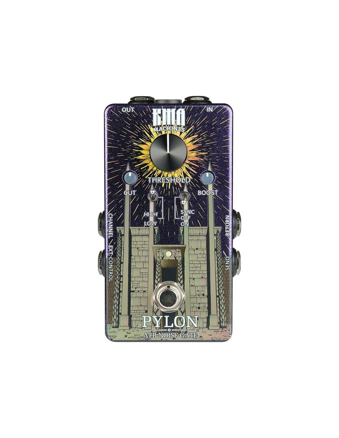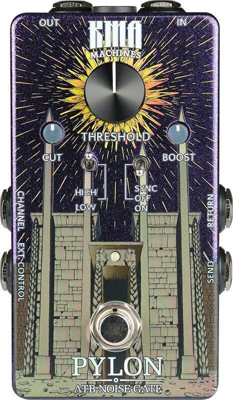 KMA PYLON ist ein Noise Gate Pedal für Gitarre. Die technischen Eigenschaften umfassen eine variabel einstellbare Cut-Frequenz, einen Boost-Regler zur Erhöhung oder Absenkung von bis zu 30 dB Gain, einen Frequenzschnitt-Wahlschalter (High, Low), einen Synch-Schalter und einen Threshold-Regler zur Einstellung des Niveaus des Noise Gates.